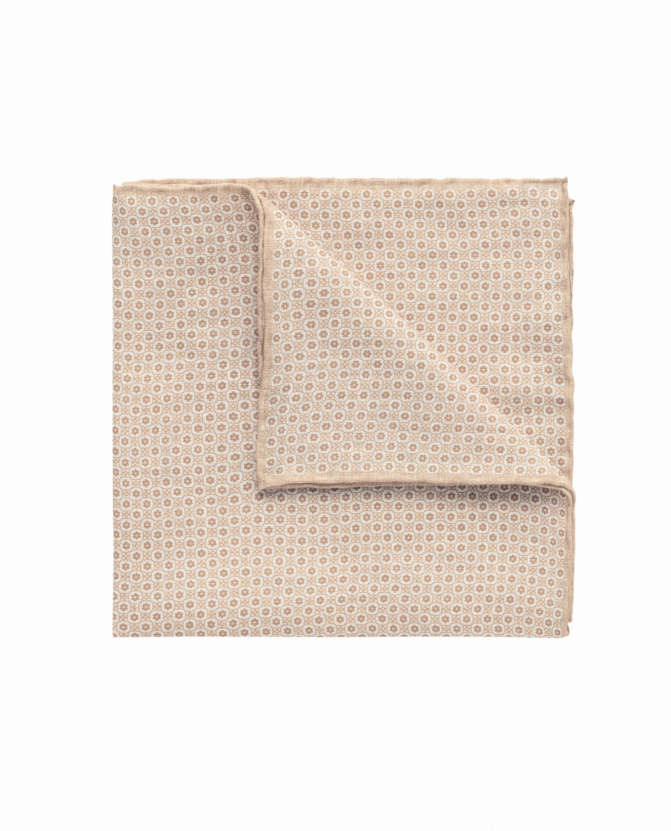 This pure linen pocket square is made from natural flax fibers known for their strength. Seen here is a mixed beige and white-tiled flower print that sits crisply lending it a sartorial touch appropriate for a wide range of events.