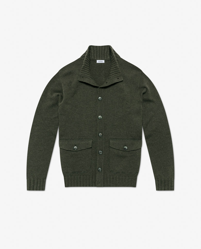 With its side pockets and chunky ribbed finishing, this moss green knit is casual meets practical. Made from soft cashmere with superior insulation and 3D knitted for a luxurious seamless look. Designed here as a bomber knit with full-length buttons, in double ply for winter warmth. Make this knitwear your own from our customization options.