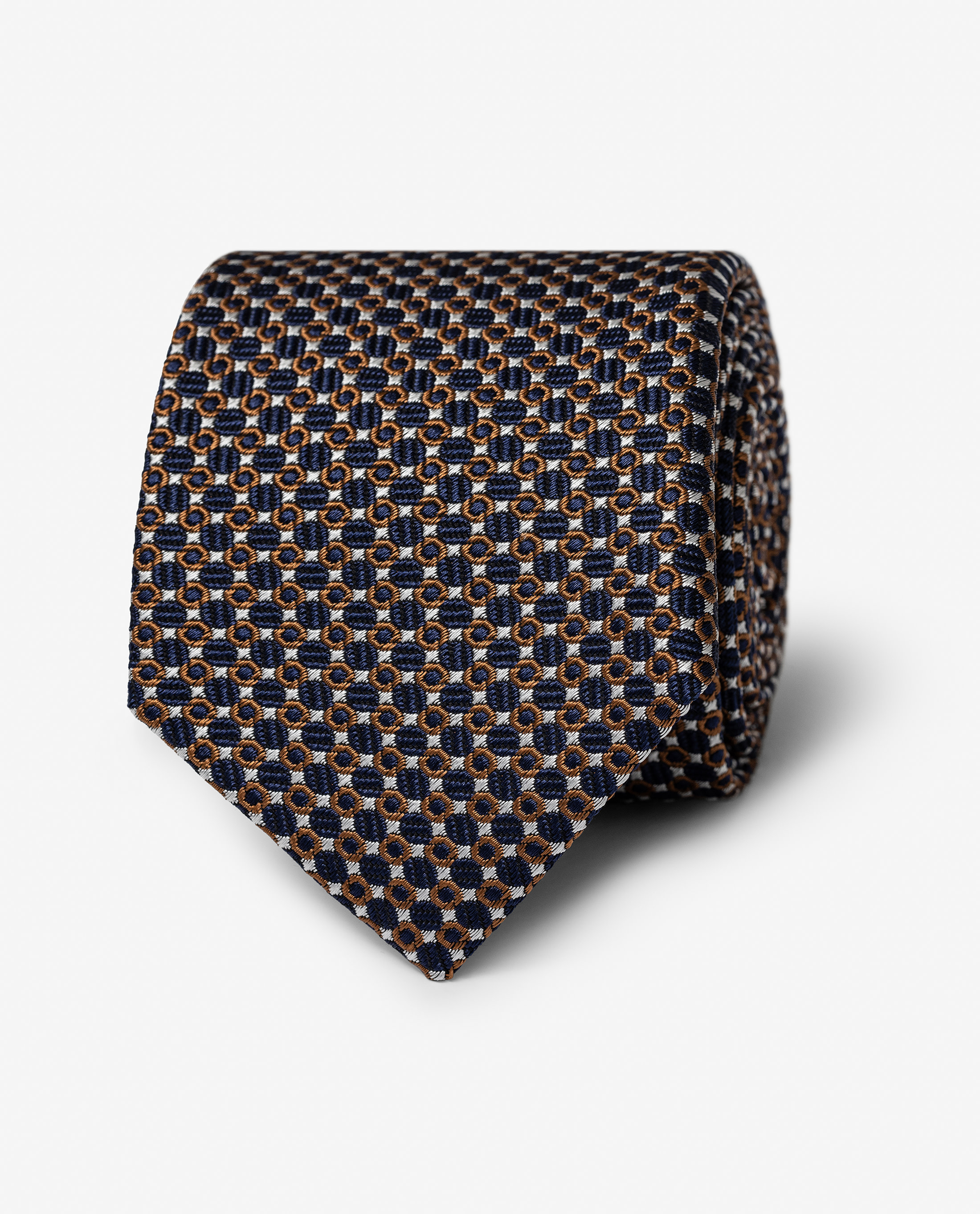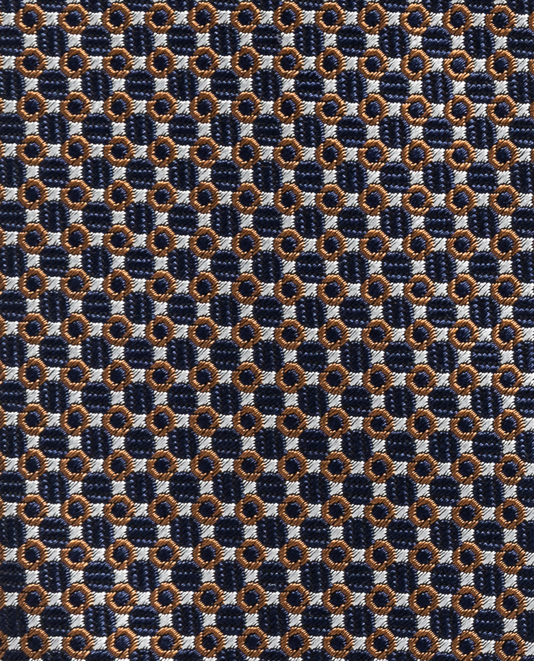 This navy blue, cinnamon, and white silk and cotton tie features a jacquard texture for a touch of personality. The combination of colors and symmetrical patten makes it a true statement piece. Make this tie your own with our many customization options to choose from. Silk & cotton Luxurious texture More rigid drape Subtle sheen Jacquard
