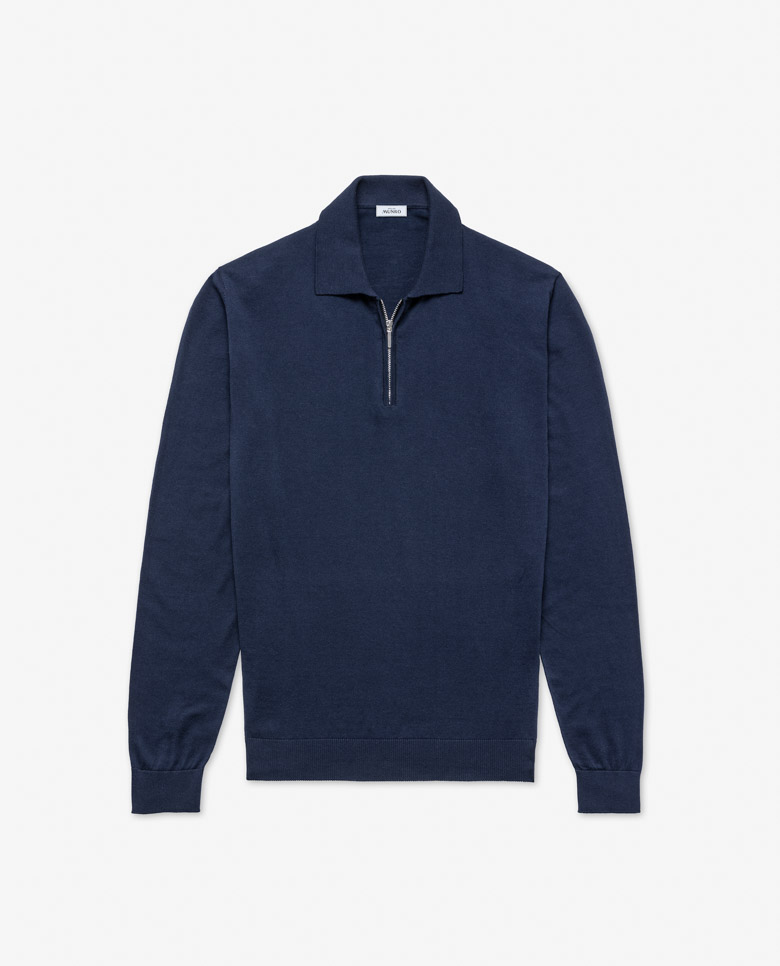 Lightweight with shine especially visible in the sunlight, consider this navy blue polo your quintessential summer knit. Seamlessly knitted from a luxe blend of breathable Egyptian cotton with mulberry silk, adding even more elegance, softness, and drape. Designed here with a zip closure, in single ply for the lightest wear possible. Make this knitwear your own with our customization options.
