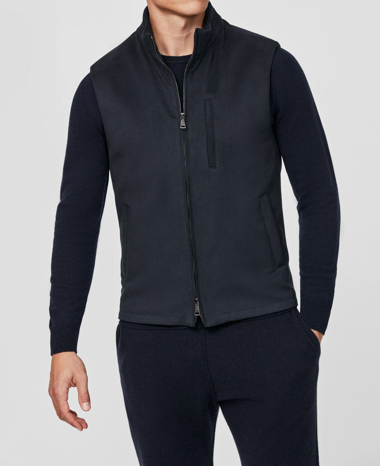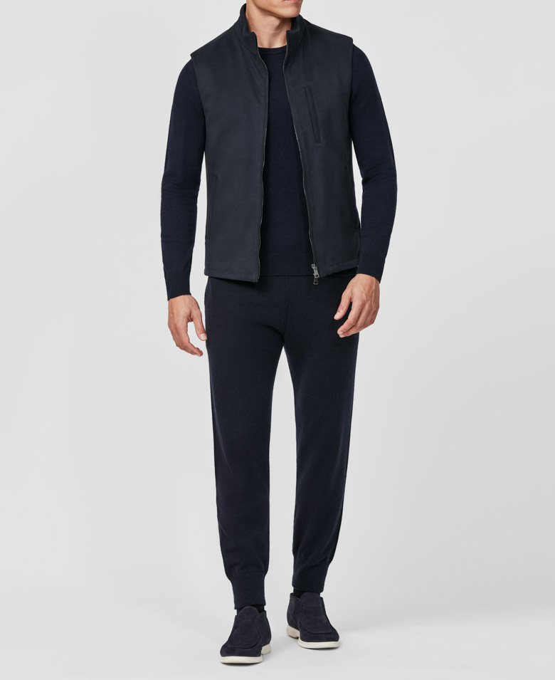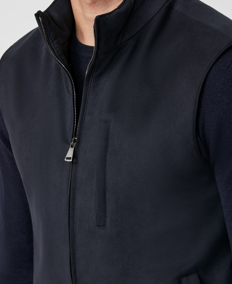 Add a light and laid-back layer to your look with this navy vest. Made from animal-friendly faux suede for soft, extra texture. Designed here with a two-way zip closure. Style it with a crew neck knit, matching leisure pants, and mid-top city loafers all in midnight blue to complete the look. Make this vest your own with our many customization options to choose from.