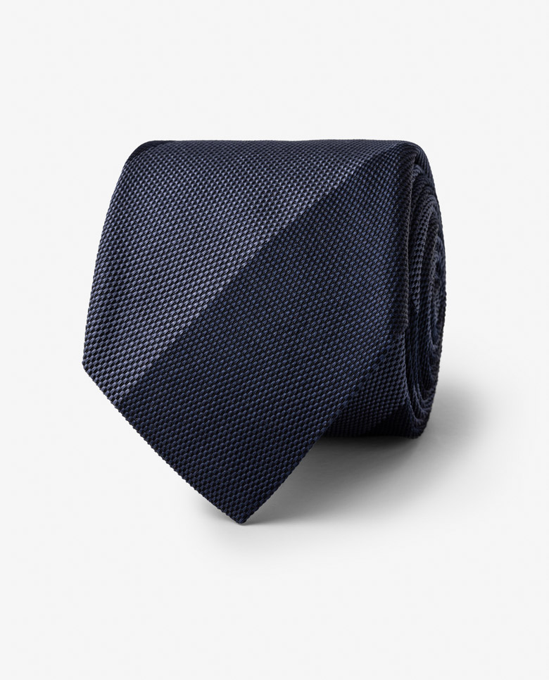 Stand out at a meeting or formal event with a contemporary club stripe. This navy blue tie with a structured stripe in slate blue was designed exclusively for us. Crafted from a balanced blend offering the sheen of silk with the body of cotton. Make this tie your own with our range of design and personalization options. Handmade Silk & cotton Structured stripe Textured Rich feel