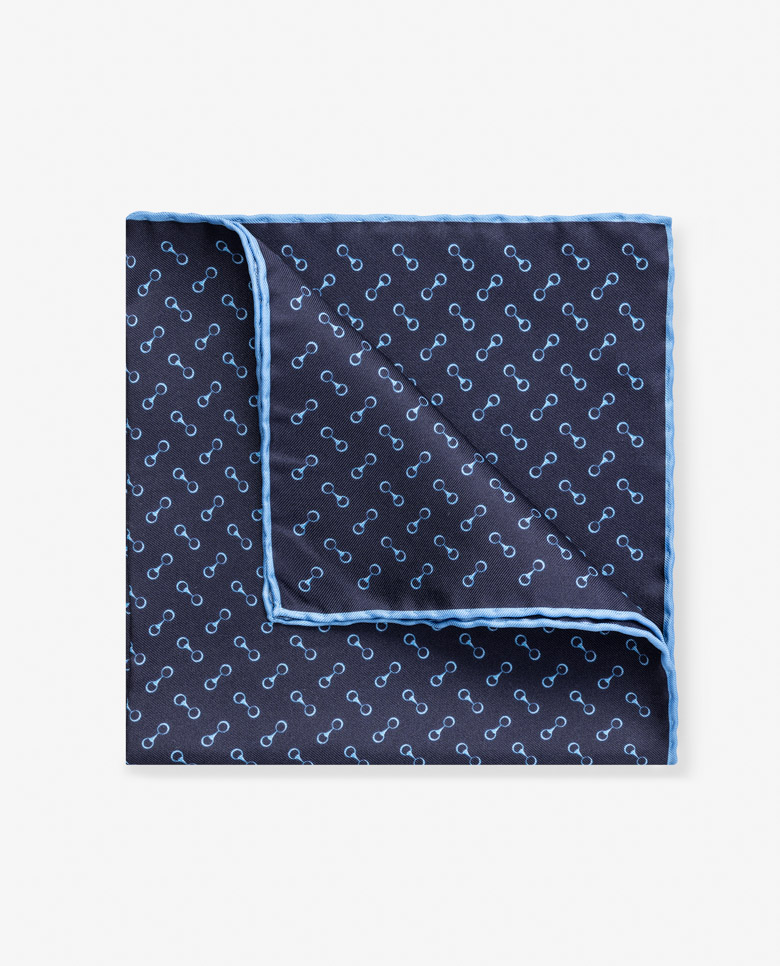 Navy dotted with a sky blue horse bit print, this pocket square reworks a heritage design for something quite contemporary. Crafted from 100% silk with a soft texture and elegant shine. Make this pocket square your own with our range of design and personalization options. 100% silk Soft drape Shine Handrolled