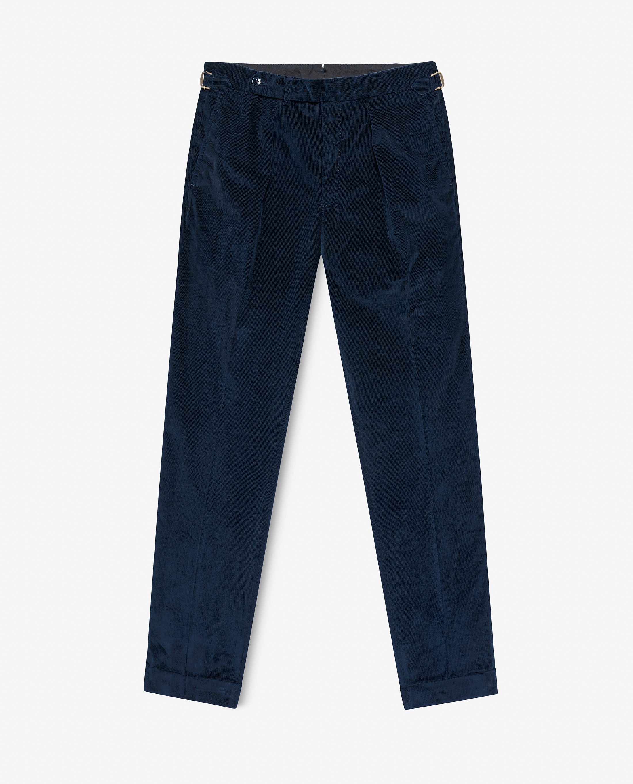 Lighter and softer than your average pair of cords, these navy chinos can be worn all year round. Made from a more sustainable blend of cotton and lyocell with stretch. Designed here as dress chinos with a pleat and turn-up. Make these chinos your own with our many customization options to choose from.