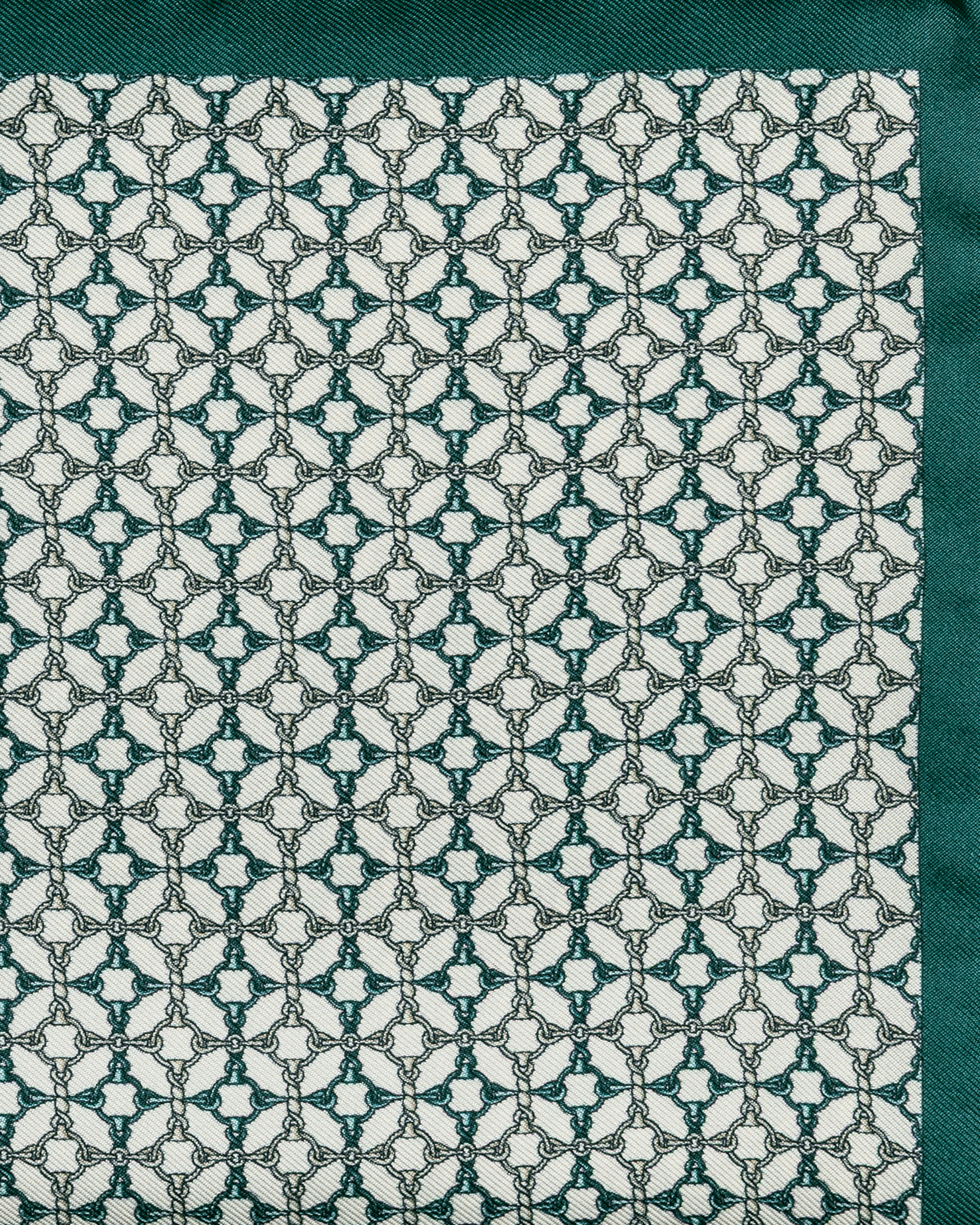 This petrol green pocket square with chain-inspired print is a celebration of artistry and timeless design. Woven from pure silk and printed exclusively in Como, Northern Italy, it’s the perfect companion when forgoing a tie. Designed here with a hand-rolled edge for added elegance. Make this pocket square your own with a monogram. 100% silk Chain print Hand rolled