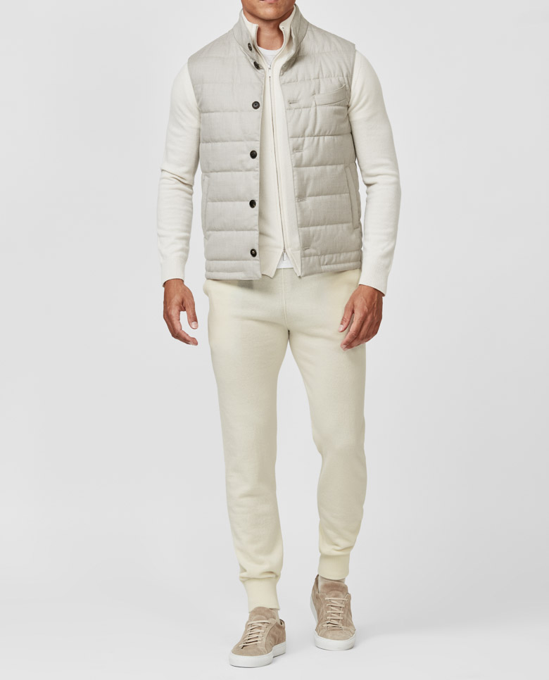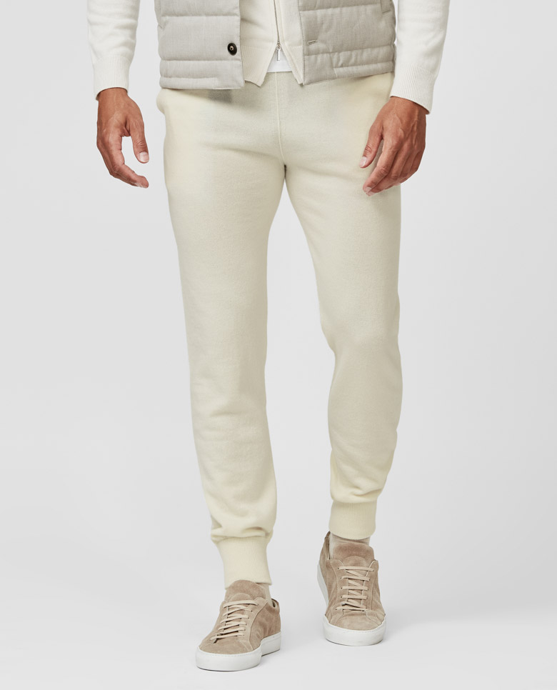 Lounge in luxury with these knitted leisure pants in wintery off-white. Made from a mix of ultra-fine Australian wool and soft Inner Mongolian cashmere. Featuring an airy fit with elastic drawstring waistband. Designed here with a right back pocket, in single ply for a lighter wear. Make this knitwear your own with our customization options.