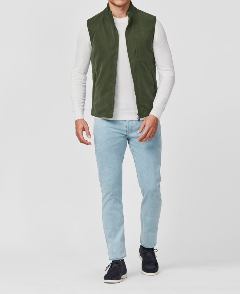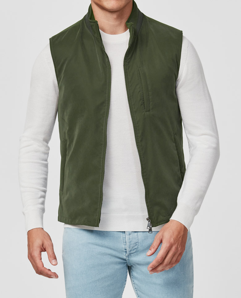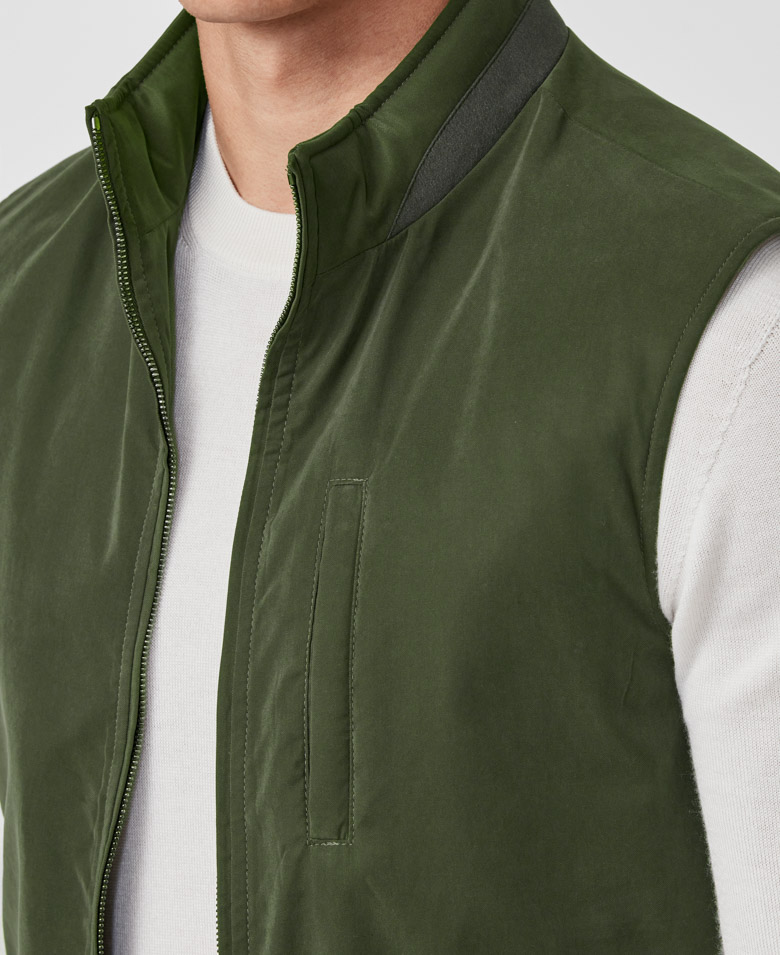 For a laidback look with sportive style, throw on this lightweight olive green vest. Made from a technical fabric featuring a velvety texture and water-repellent finish. Designed here with a two-way zip closure. Pair it for weekends with a crew neck knit, jeans, and laced city loafers. Make this vest your own with our many customization options to choose from.