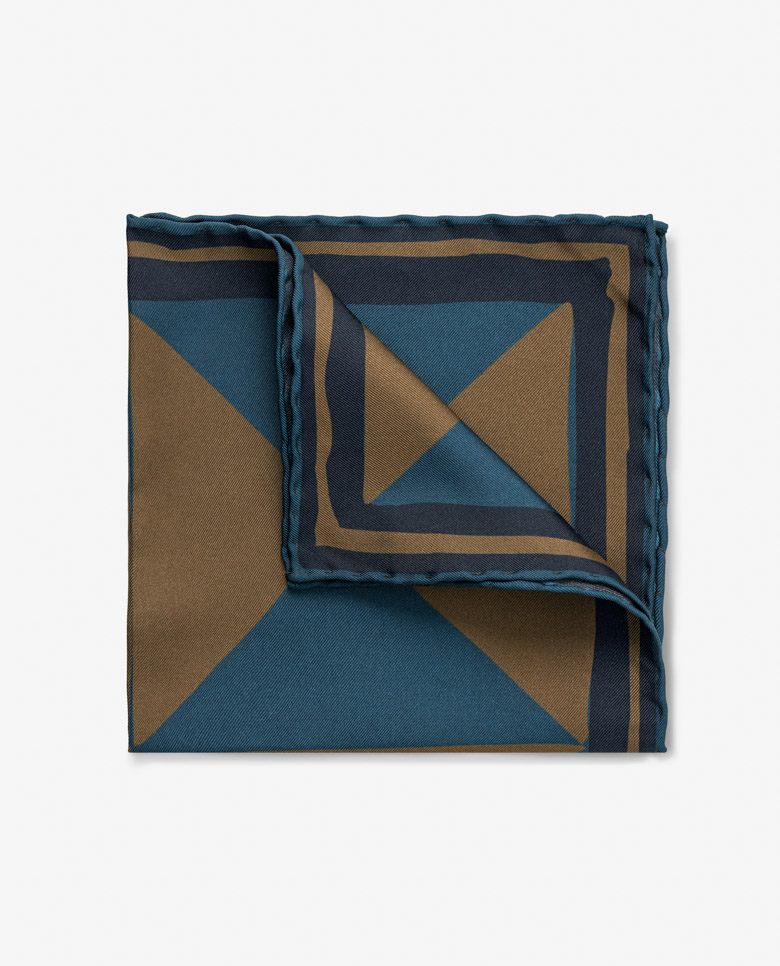 Bring a modern mood to your formal wear with this pocket square designed exclusively for us. The teal and tobacco abstract tile design is printed on petrol Italian silk for an accessory with soft drape and shine. Handrolled with a petrol-colored edge. Make this pocket square your own with our range of design and personalization options. 100% silk Soft drape Shine Handrolled