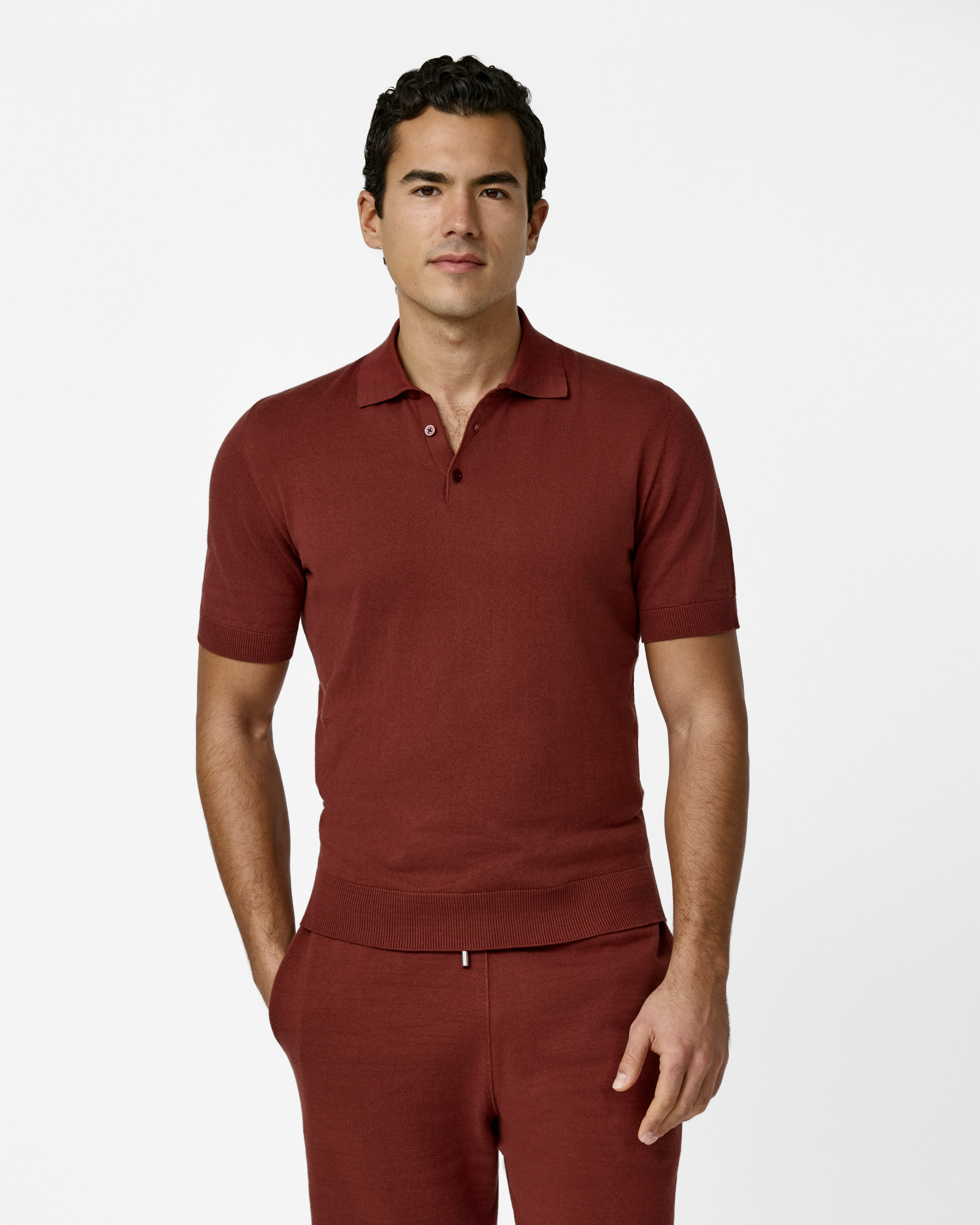 Cool to the touch with matte elegance, this seamless rust red knit is an easy summertime essential. The Pima cotton sourced from the USA is ultra-fine with longer fibers for remarkable smoothness, durability, and crease resistance. Designed here as a short-sleeved polo in single-ply yarn for a classic look. Prefer a different style?