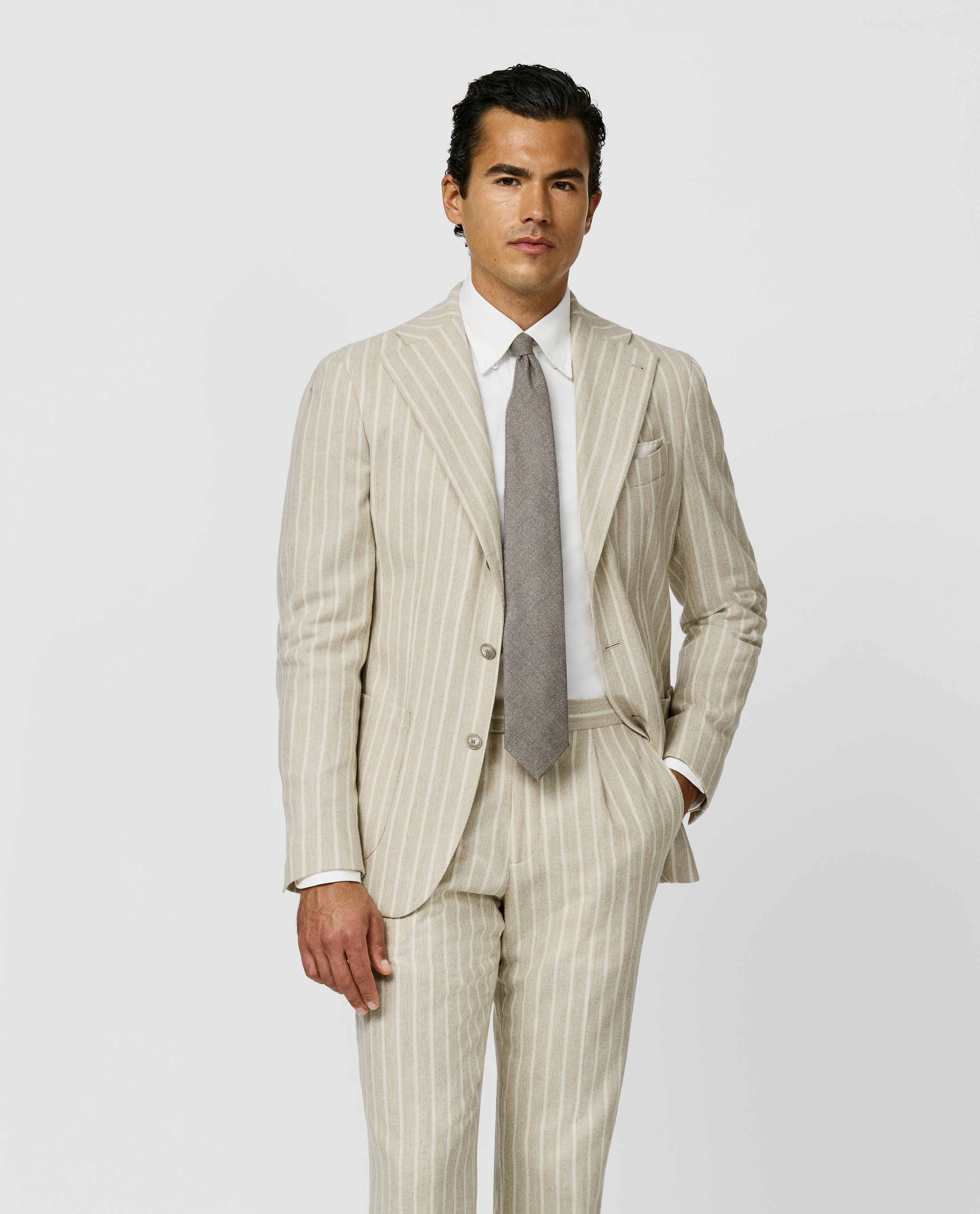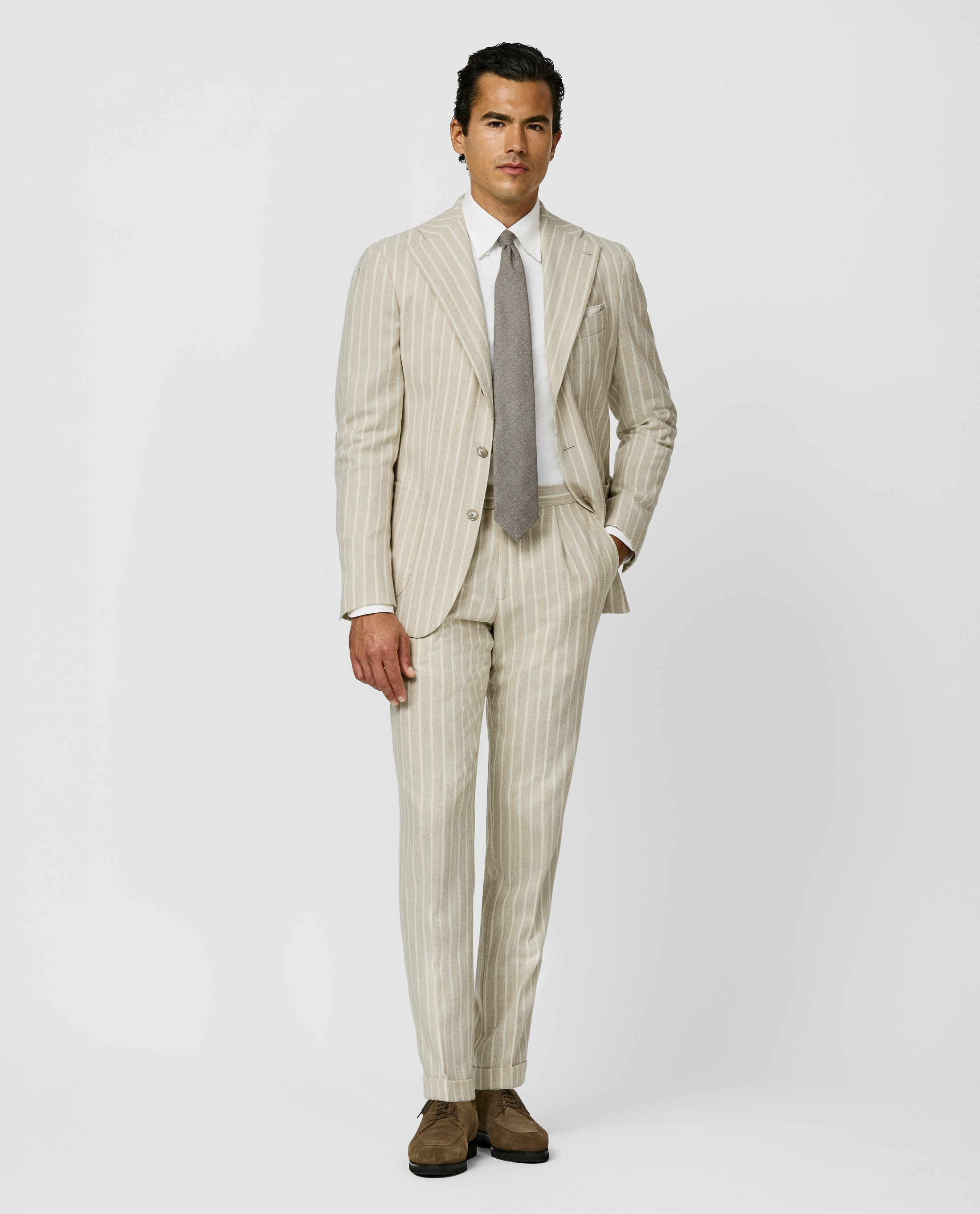 This sand suit with ivory stripes crafted from a stretch alpaca-wool blend balances comfort and sophistication. The baby alpaca's natural properties provide lasting durability and performance, keeping the fabric lightweight yet high-performing. This two-piece suit features a 2.5-button double-breasted jacket, a wide lapel, and unconstructed camicia shoulder. Complete the look with a silk pocket square, extra-fine merino turtle neck, and suede penny loafers for an effortlessly elegant style. Make this suit your own with our many customization options to choose from. Soft feel Hypoallergenic Breathable Versatile Stripe
