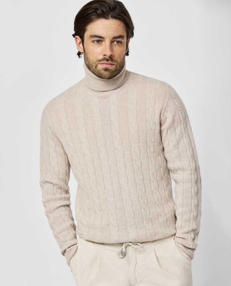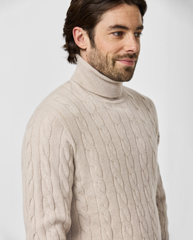 This sand-colored cable knit is a laidback layer with an easy sophistication. Made from a mix of ultra-fine Australian wool and soft Inner Mongolian cashmere, 3D-knitted for a luxurious seamless look. Designed here with a turtleneck in double ply for a classic winter look. Make this knitwear your own with our customization options. Wool & cashmere Warm Soft feel