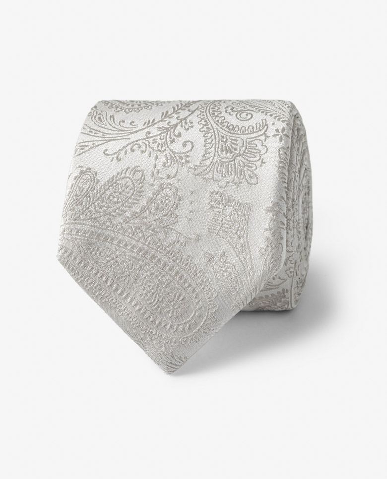 A classic design in an elegant silver palette, this silk jacquard tie is worthy of even the most special event. The pure silk features a subtle paisley pattern with natural shine and soft drape. Perfect for adding a textured touch to your wedding look. Make this tie your own with our range of design and personalization options.