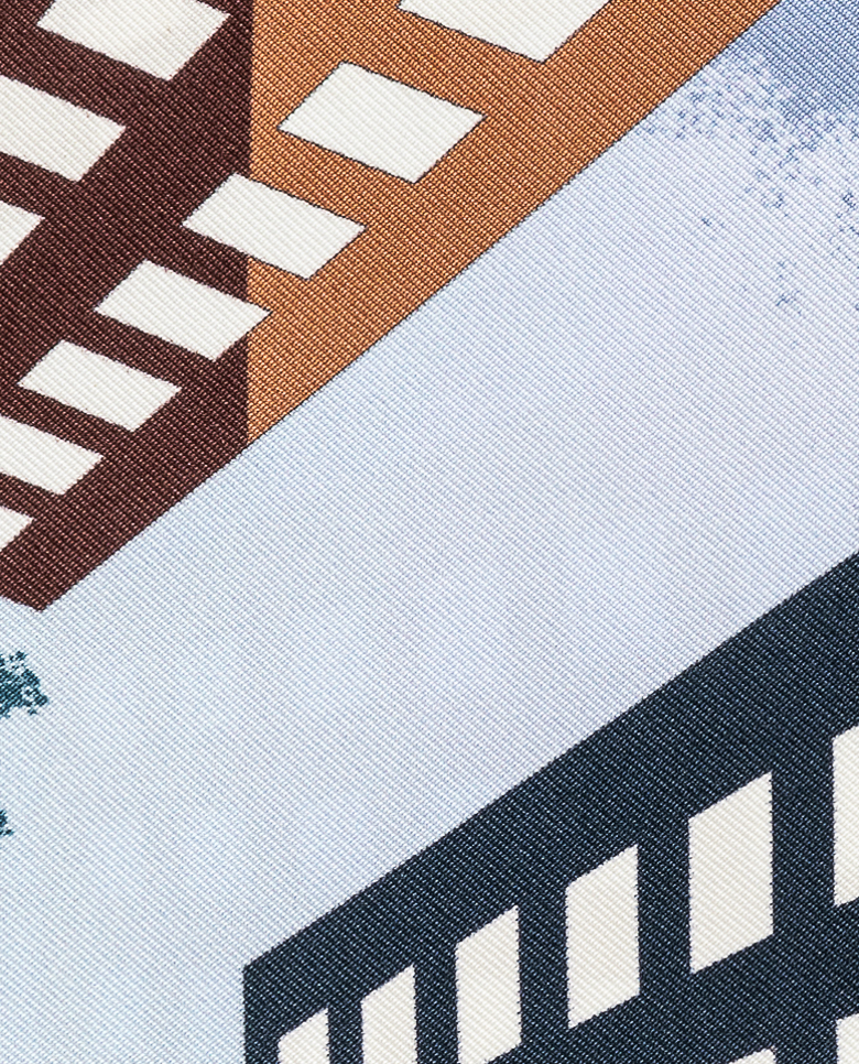 Add a touch of cityscape personality to your ensemble with this sky blue pocket square featuring a beige and red abstract skyscraper design. Printed on elegant pure silk in Como, Italy and finished with hand-rolled wine red edges. 100% silk 33 x 33 cm Hand-rolled edges