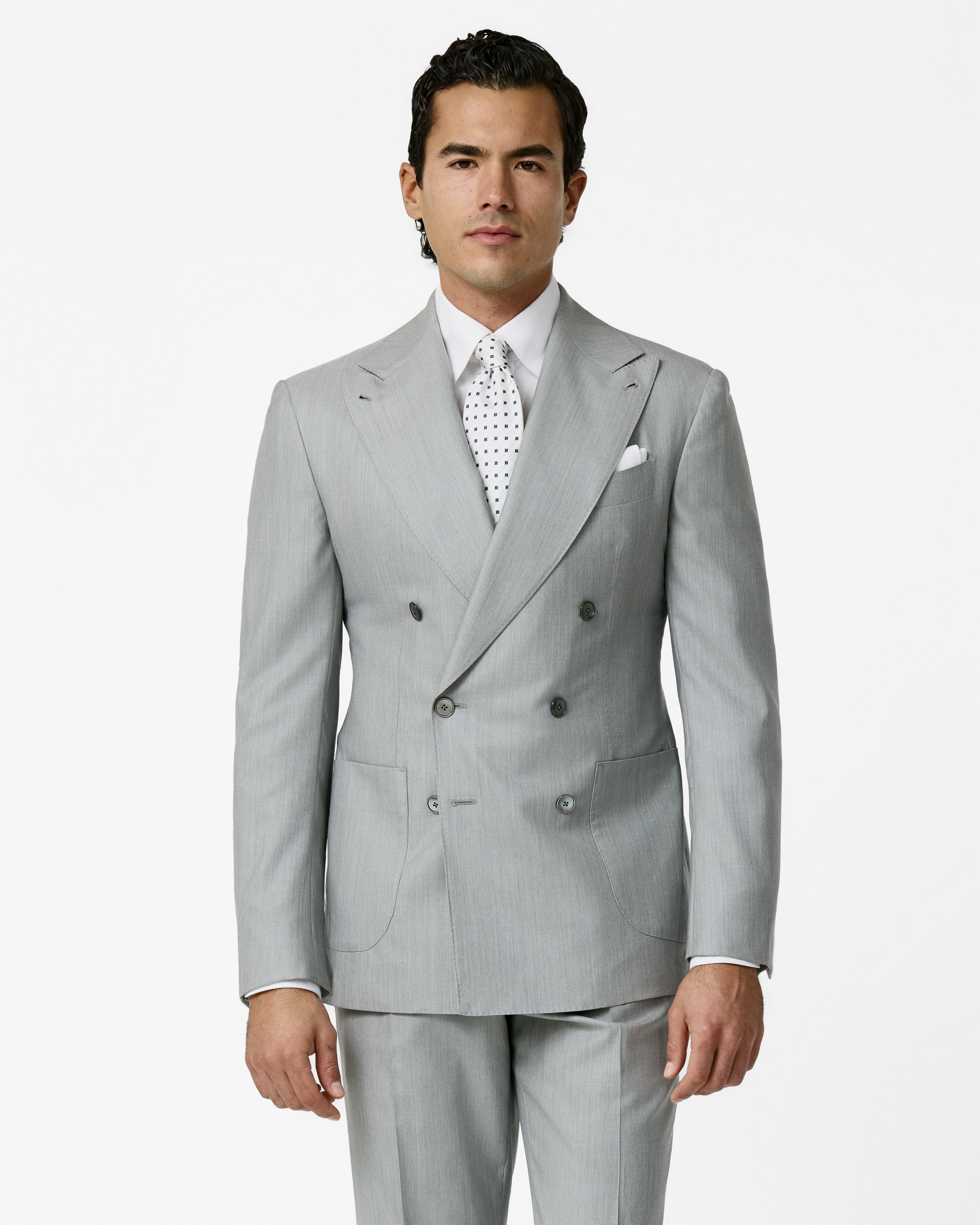 Stay looking crisp and classic in this all-season smoke gray suit. The S130 mélange wool is woven from double-twisted yarns offering greater crease resistance. Designed here as a double-breasted jacket with peak lapels and an unconstructed shoulder. Style it with a natural stretch shirt, patterned tie, and calfskin shoes to complete the look.