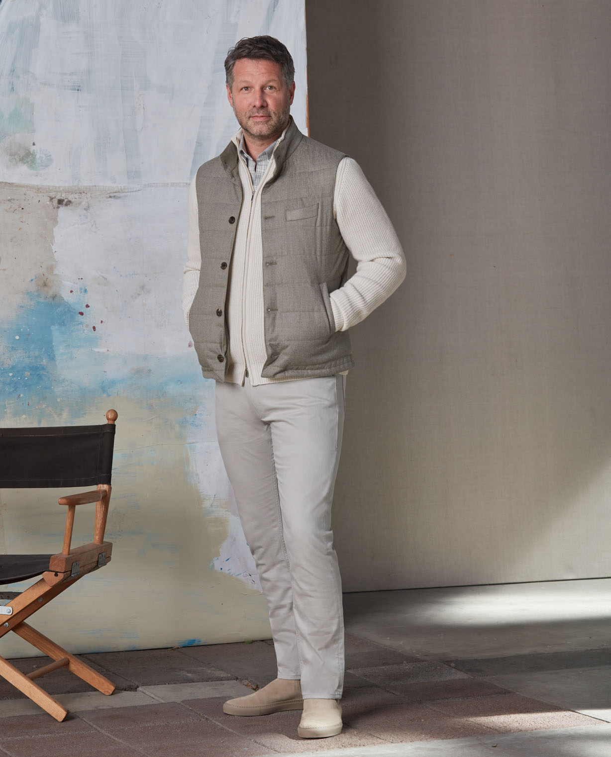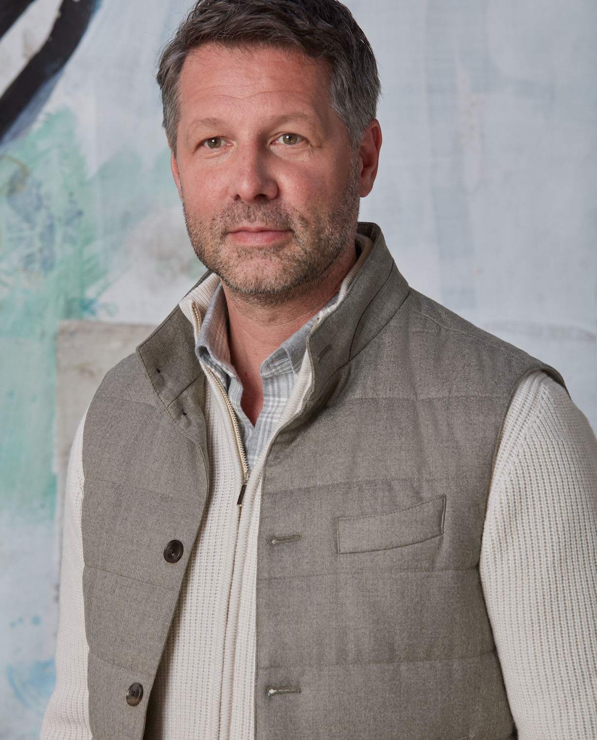 When temperatures drop, pop this taupe quilted vest over your knit to stay cozy. The supremely practical layer will keep your body warm while keeping your arms free. Made from pure wool flannel and padded with 100% eco-down sourced from recycled plastic bottles. Designed here with a 5-button closure and slanted welt side pockets. Style it with a shirt, knit, 5-pockets, and sneakers to complete the look. Make this vest your own with our many customization options to choose from.