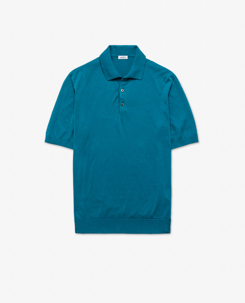 Lightweight with shine especially visible in the sunlight, consider this teal blue polo your quintessential summer knit. Seamlessly knitted from a luxe blend of breathable Egyptian cotton with mulberry silk, adding even more elegance, softness, and drape. Designed here with short sleeves, in single ply for the lightest wear possible. Make this knitwear your own with our customization options.