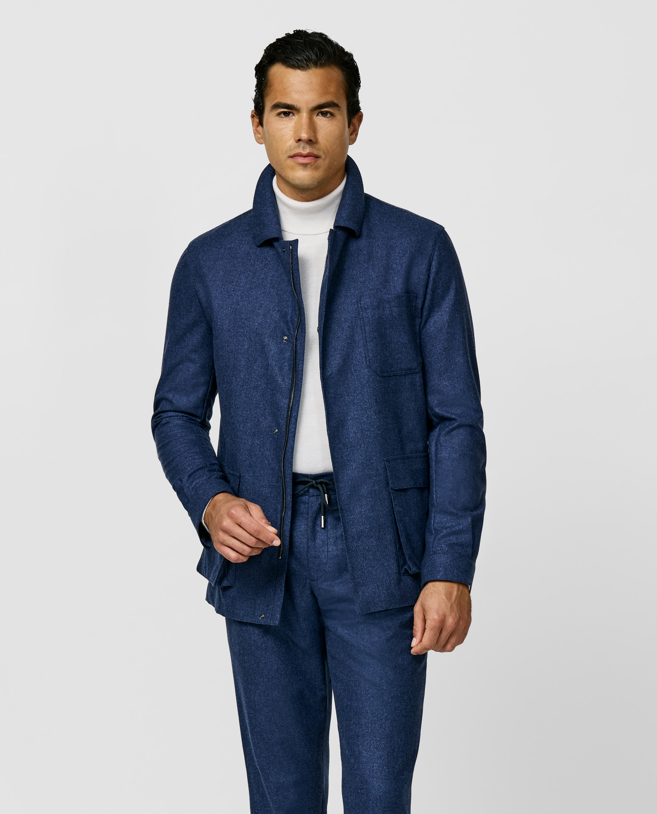 Made from a luxurious wool-cashmere blend, this mixed blue suit features a soft brushed flannel texture paired with a breathable tropical weave. The micro-houndstooth pattern adds sophistication, while the brushed finish elevates its luxurious feel. Perfect for winter, it offers refined elegance and comfort for special occasions. Combine your suit with an off-white turtle neck and dark blue city loafers for a cohesive look. Make this suit your own with our many customization options to choose from. Wool & cashmere Micro-houndstooth Warm Flannel finish Soft feel