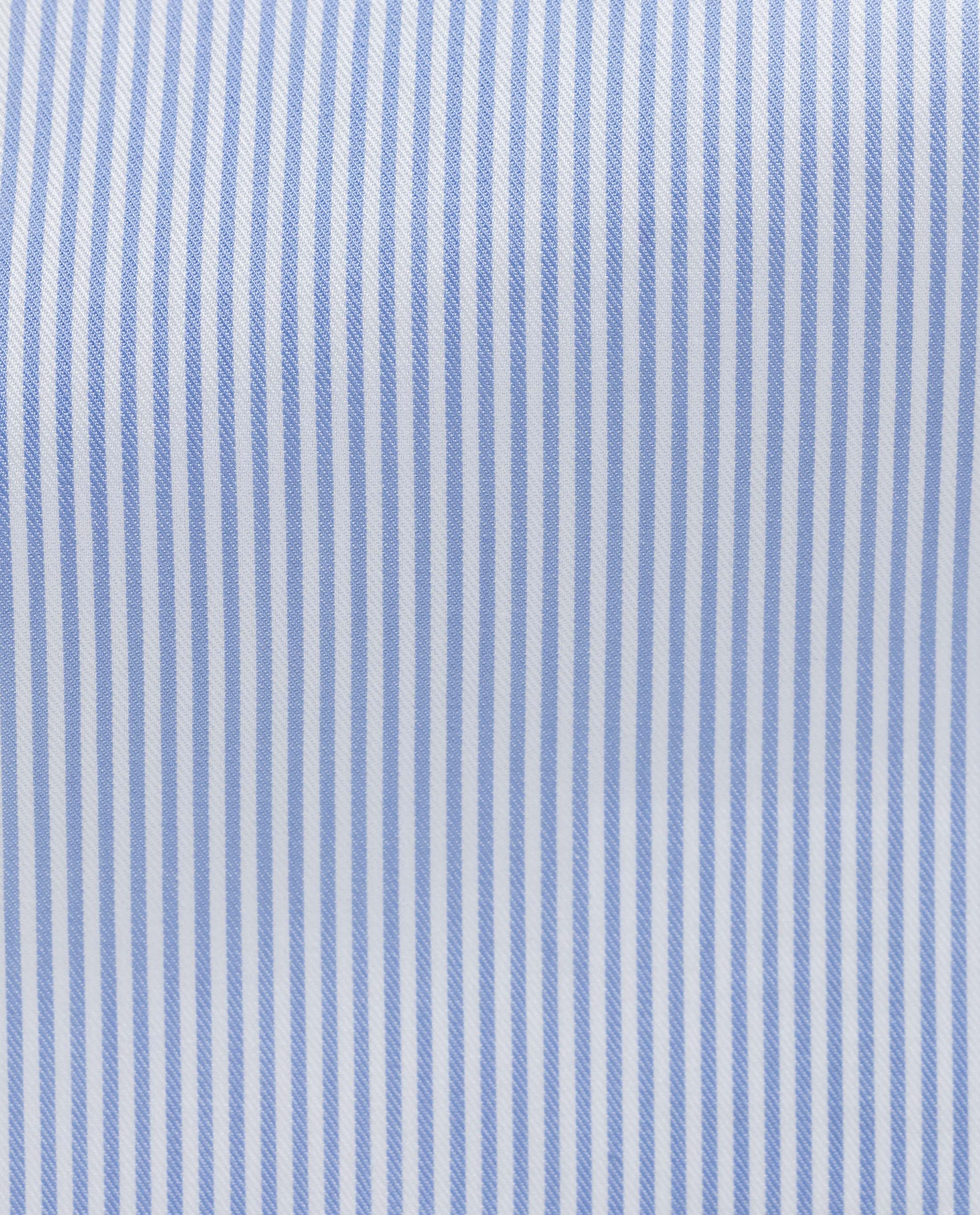 A wrinkle-resistant medium blue twill shirting with stripes featuring a vibrant luster, for use in all four seasons