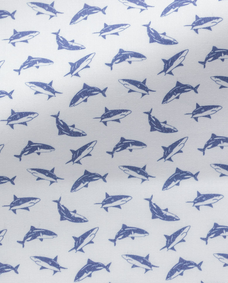 Make waves in a summer shirt with this fun blue mini-shark design. Printed on a crisp single-ply cotton poplin offering the comfort and breathability desired for more casual seasonal settings. Designed here with a one-piece collar. Make this shirt your own with our many customization options to choose from.