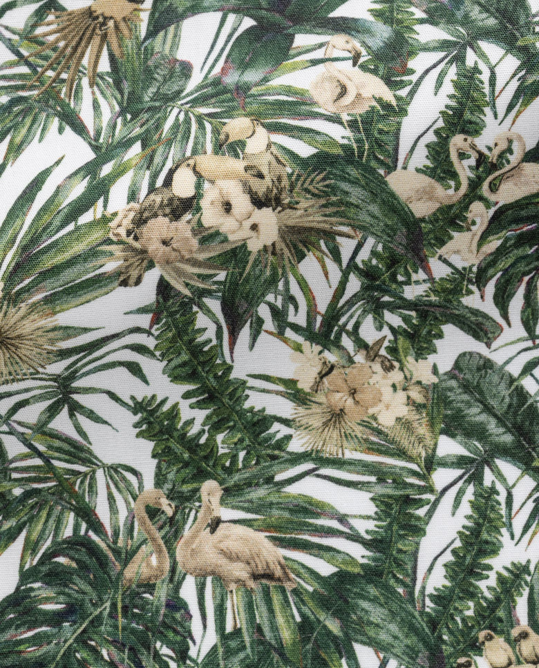 Bring vibrancy to your summer shirt collection with this lively green tropical print. Printed on a crisp single-ply cotton poplin offering the comfort and breathability desired for more casual seasonal settings. Designed here with a one-piece collar and a straight hem. Make this shirt your own with our many customization options to choose from.