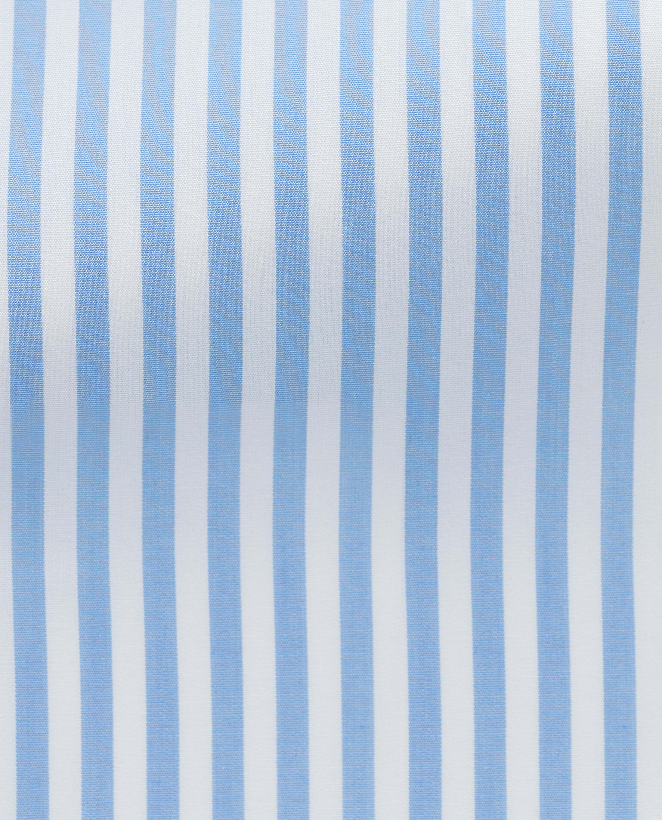 White cotton poplin with l.blue bengal stripe with soft handfeel, made of fine single yarns. Perfect for business.