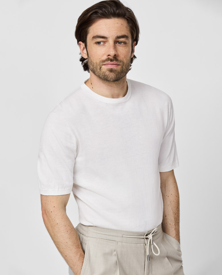 Lightweight with shine especially visible in the sunlight, this white knit is all-season essential. Seamlessly knitted from a luxe blend of breathable Egyptian cotton with mulberry silk, adding even more elegance, softness, and drape. Designed here as a crew neck t-shirt with a straight silhouette, in single ply for lighter wear. Make this knitwear your own with our customization options. Cotton & silk Lightweight Breathable Subtle shine Soft feel