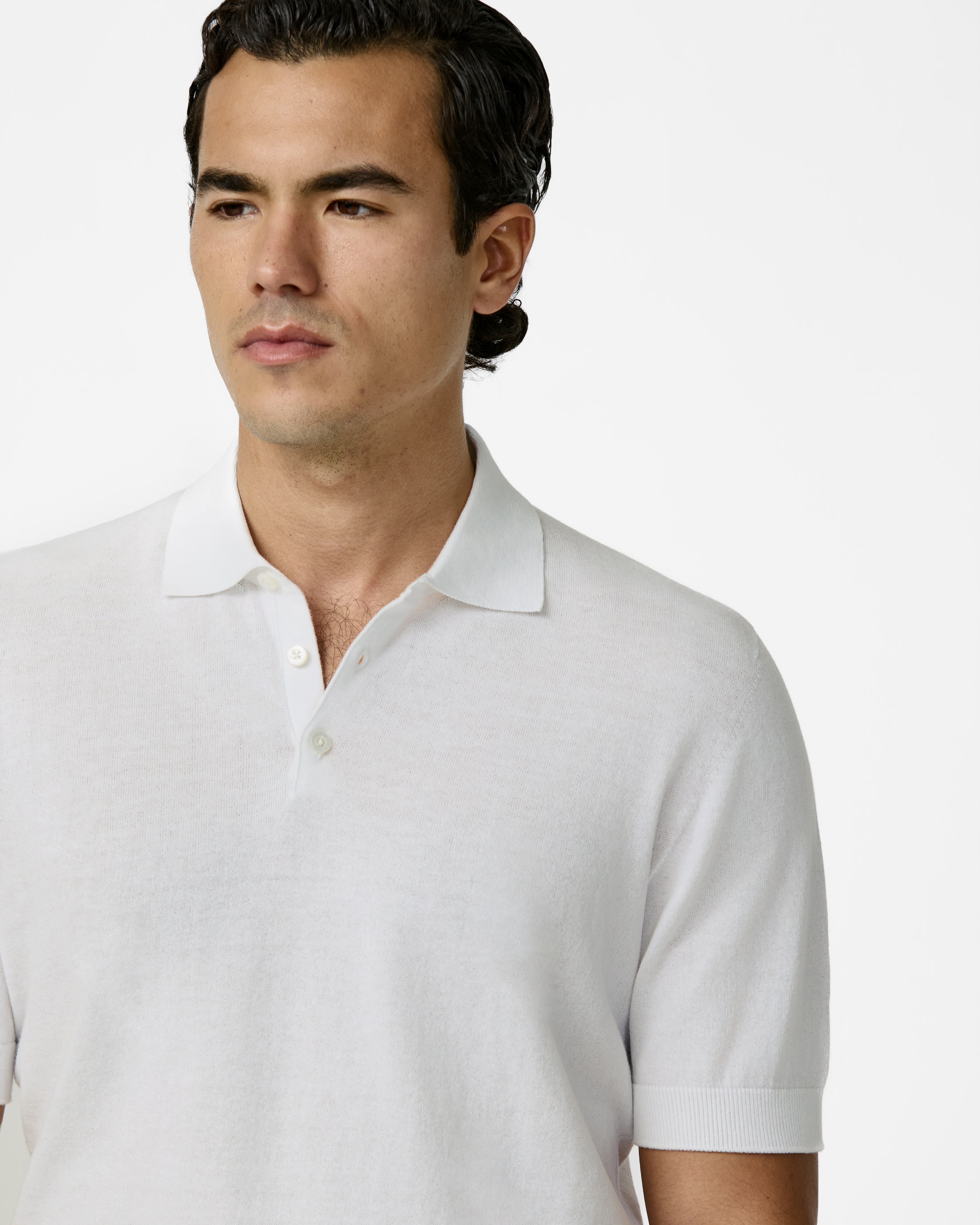 Cool to the touch with matte elegance, this seamless white knit is an easy summertime essential. The Pima cotton sourced from the USA is ultra-fine with longer fibers for remarkable smoothness, durability, and crease resistance. Designed here as a short-sleeved polo in single-ply yarn for a classic look.