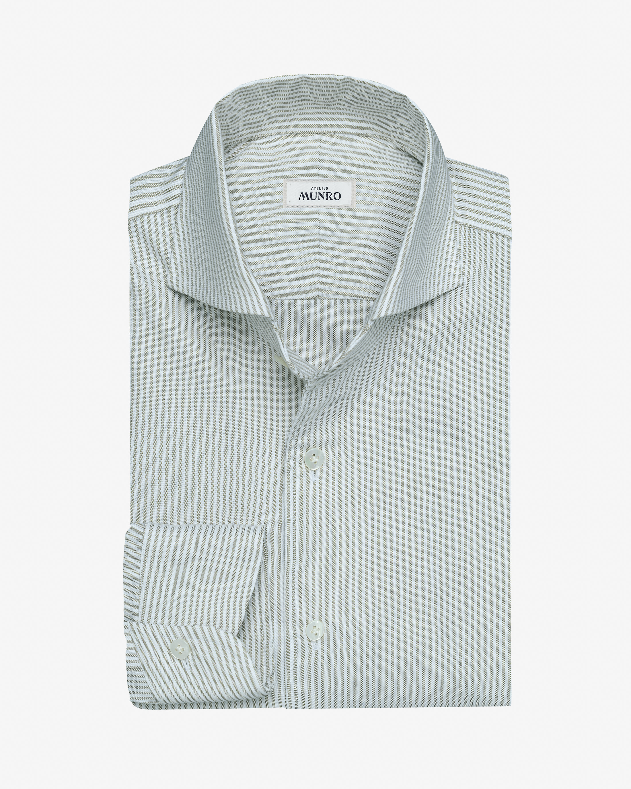 This sage stripe shirt brings innovative comfort to classic dressing. Made from a cotton Oxford weave with soft structure and a special finish that offers completely natural elasticity – without any synthetics. Designed here with a one-piece cutaway collar.