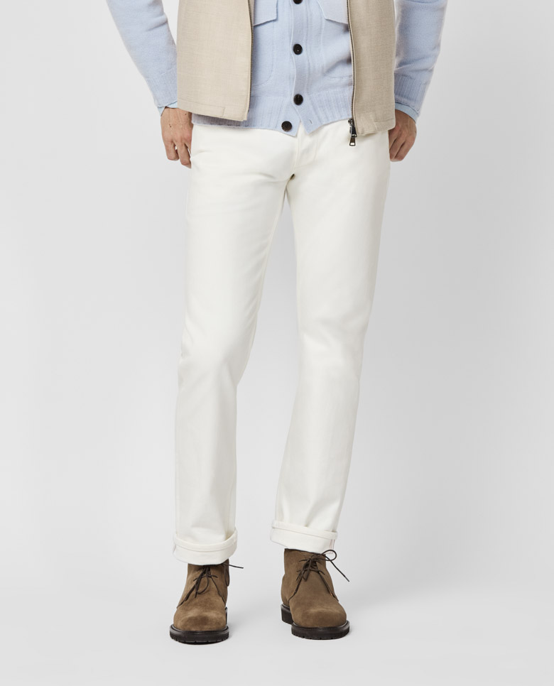 With a snow white color, lighter weight, and slight stretch, these jeans are ideal for transitional weather. The soft denim by artisanal Italian mill Blue Selvedge is enhanced with classic selvedge details only achievable on a vintage loom to create a pair that will delight fashion fanatics and denim geeks alike. Make these jeans your own with our many customization options to choose from. Stretch cotton Lightweight Selvedge