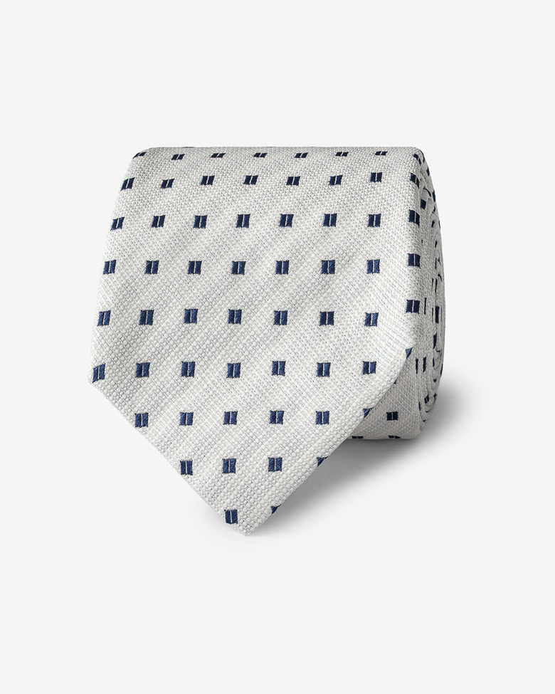 This white silk tie with a navy blue square design successfully blends textured elegance with timeless design. Crafted on a jacquard loom for a structured drape with tactile interest. Make this tie your own with our range of design and personalization options. Handmade 100% silk Jacquard Square design Luxurious texture