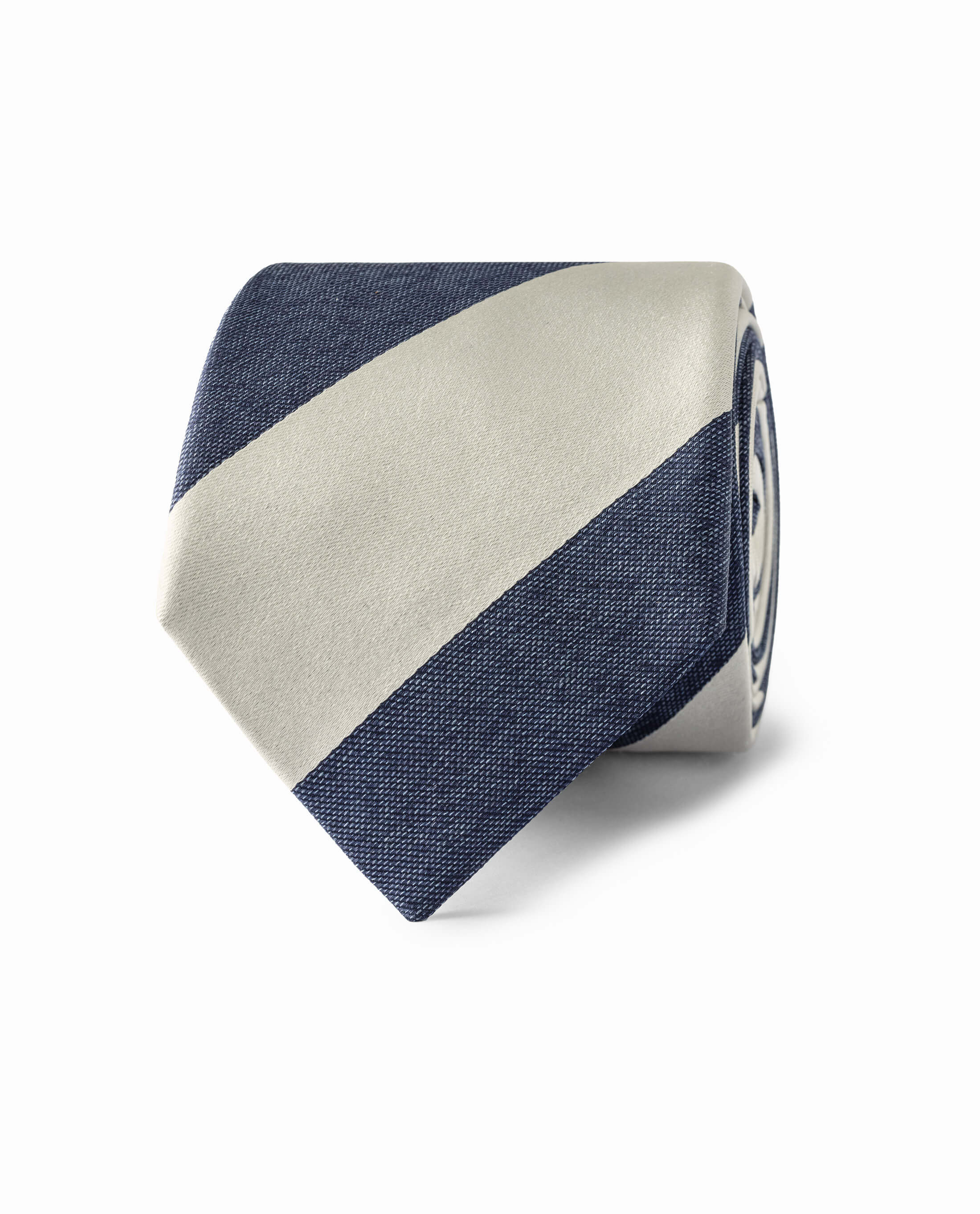 This silk jacquard tie is woven with a bold stripe in dark blue and white adding a touch of flair to a conservative look.