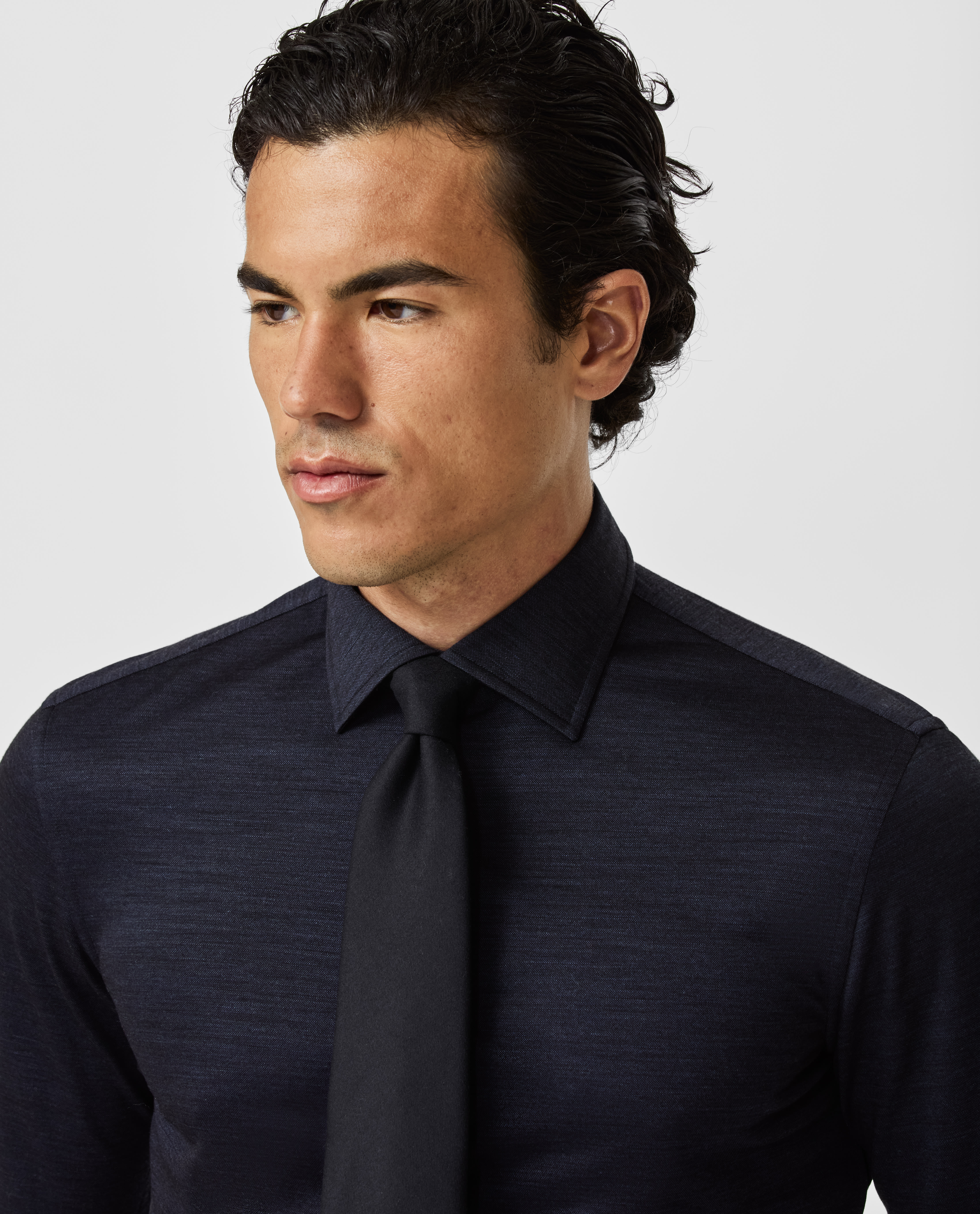 This navy blue blend elevates the piqué knit shirt to new heights. Lighter, softer, and elegantly draped, thanks to durable wool woven with more sustainable lyocell. Designed here with a semi-cutaway collar. Make this shirt your own with our many customization options to choose from. Wool & lyocell Light piqué knit Breathable Silky sheen Soft feel