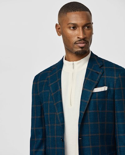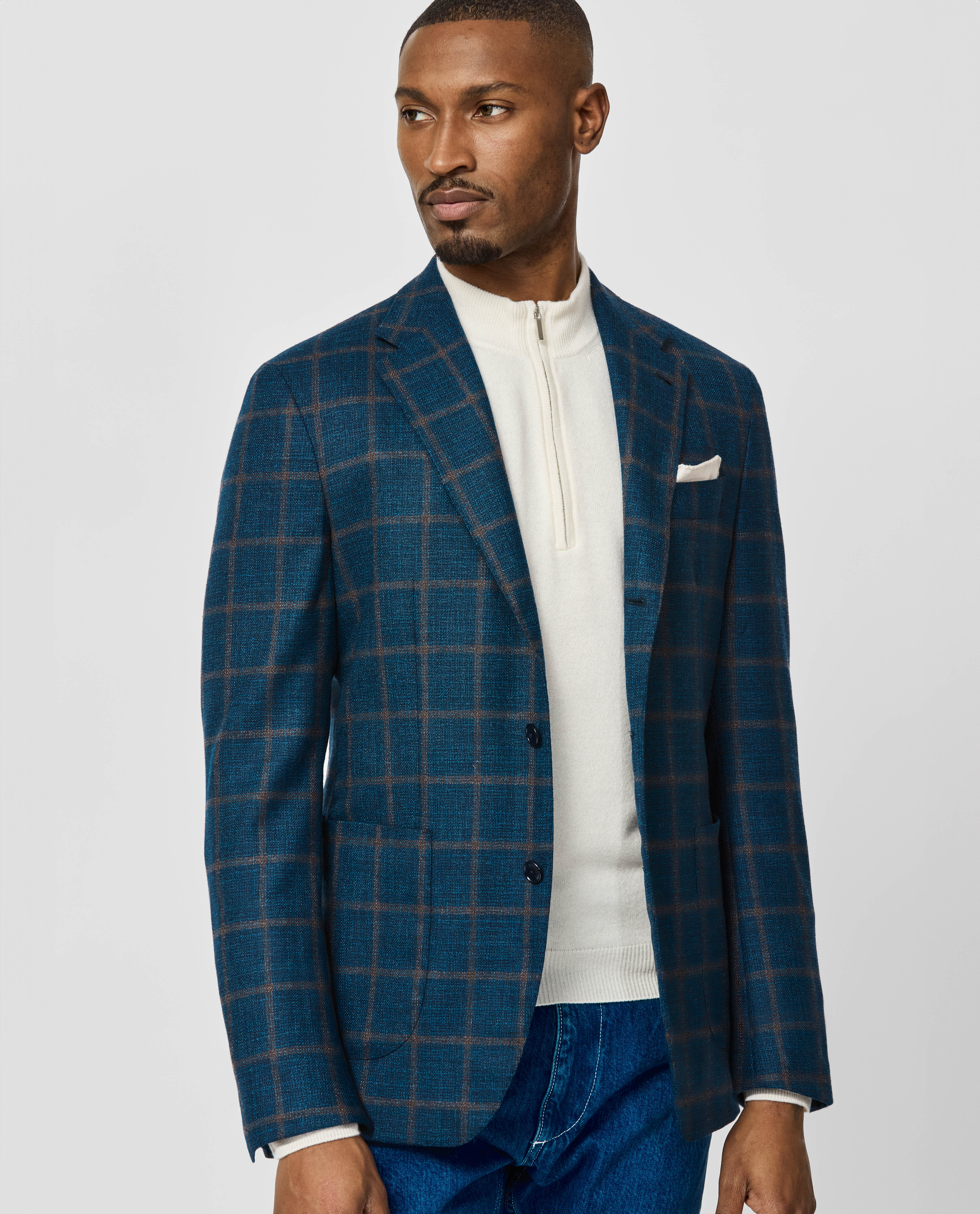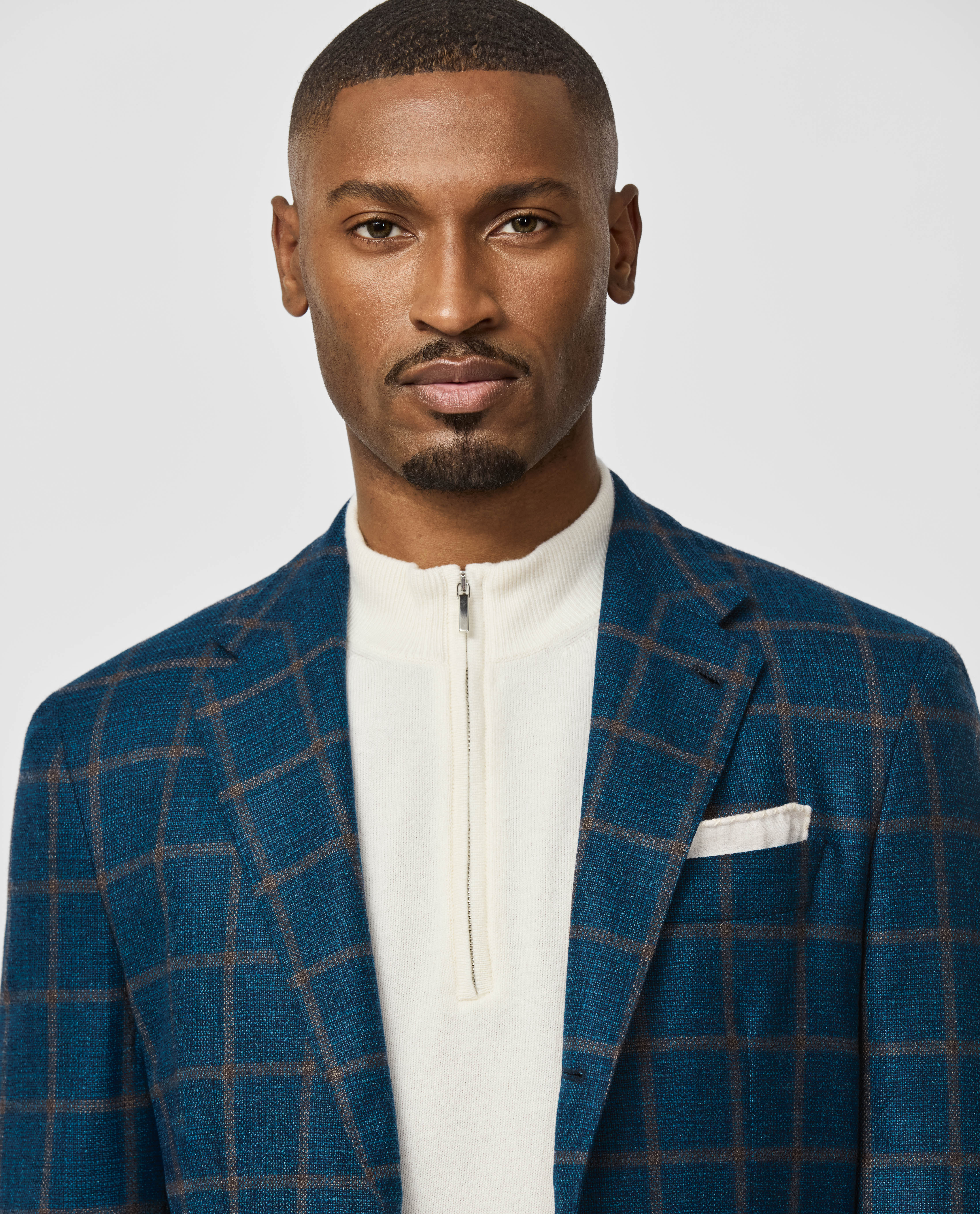 This aqua blue jacket with a brown windowpane offers a contemporary and comfortable twist on a classic. Crafted from Zelander® fabric made in Italy by Loro Piana. The pure wool from New Zealand is renowned for its outstanding resilience and natural stretch, enhanced with special finishes for double the comfort. Designed here with low-gorge lapels. Style it with a half-zip knit, blue jeans, and suede city loafers to complete the look. Make this jacket your own with our many customization options. 100% wool Natural stretch Windowpane Comfortable Soft feel