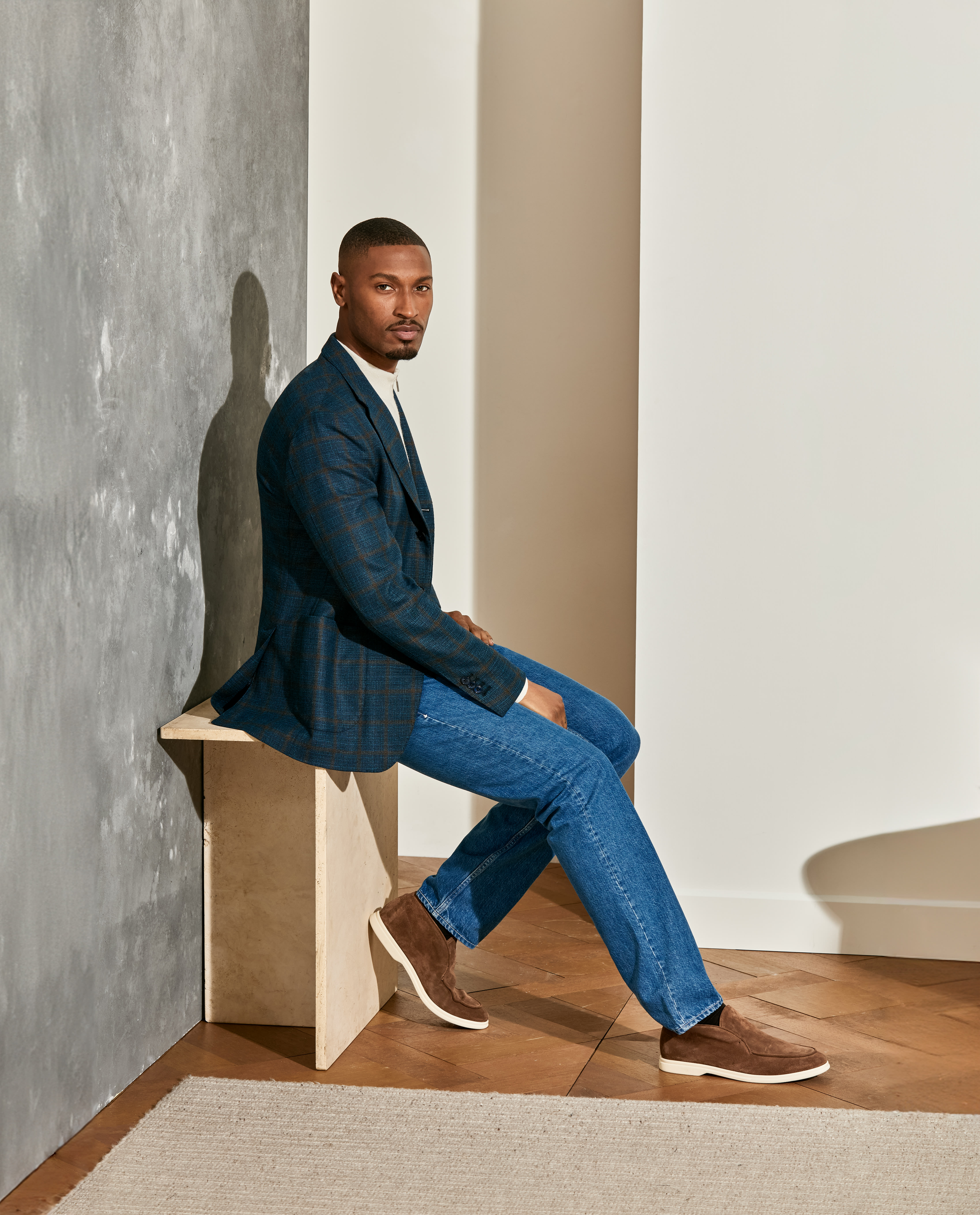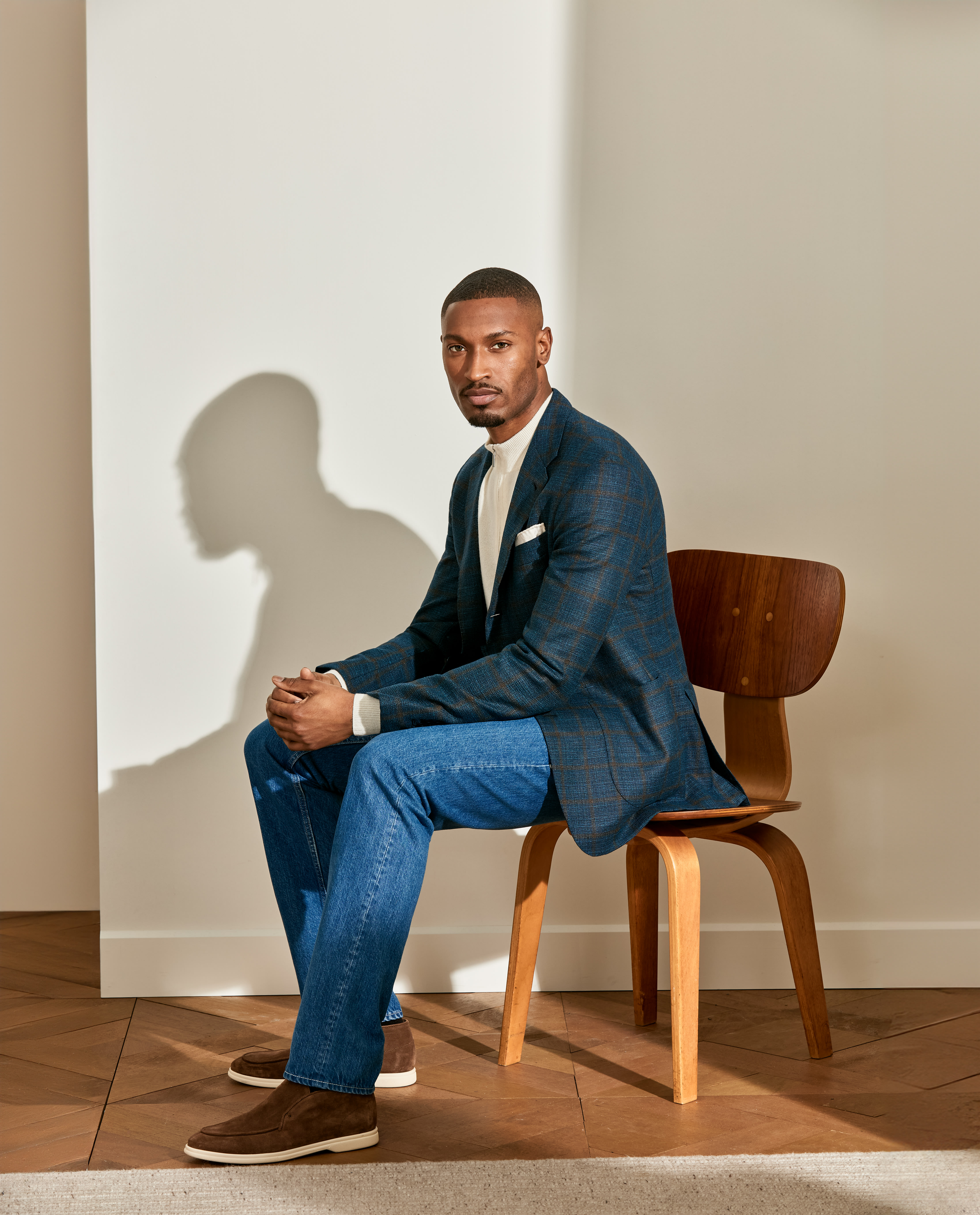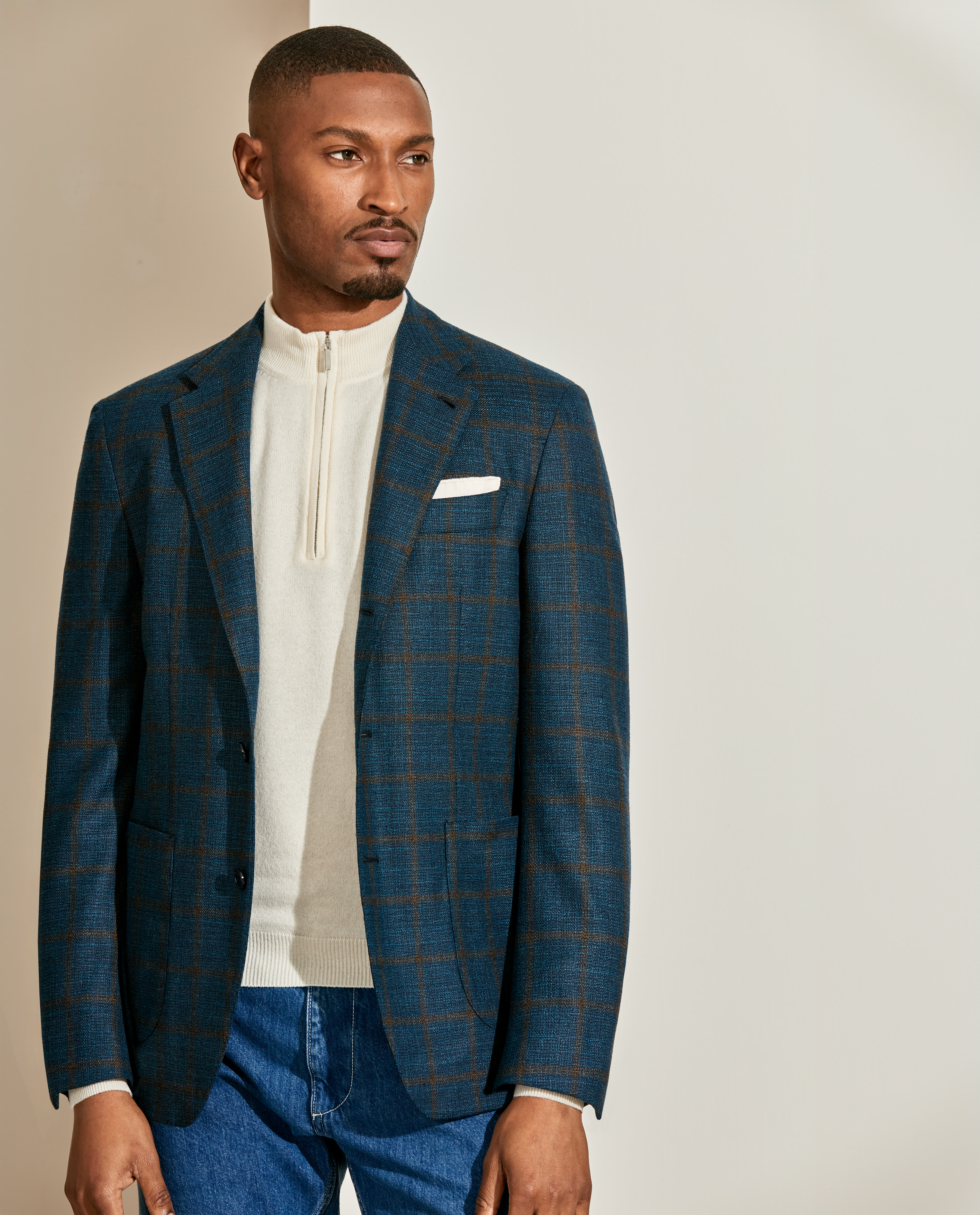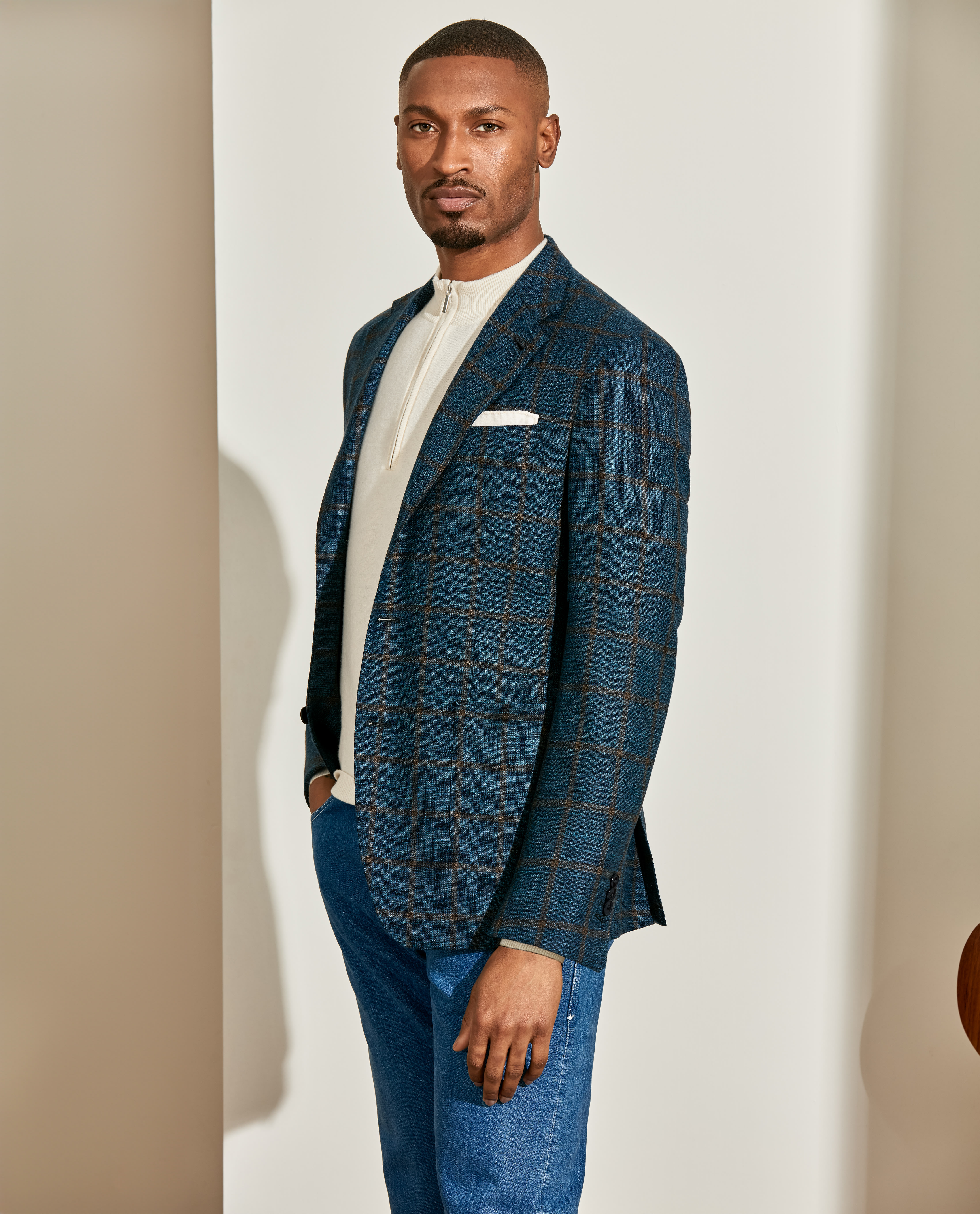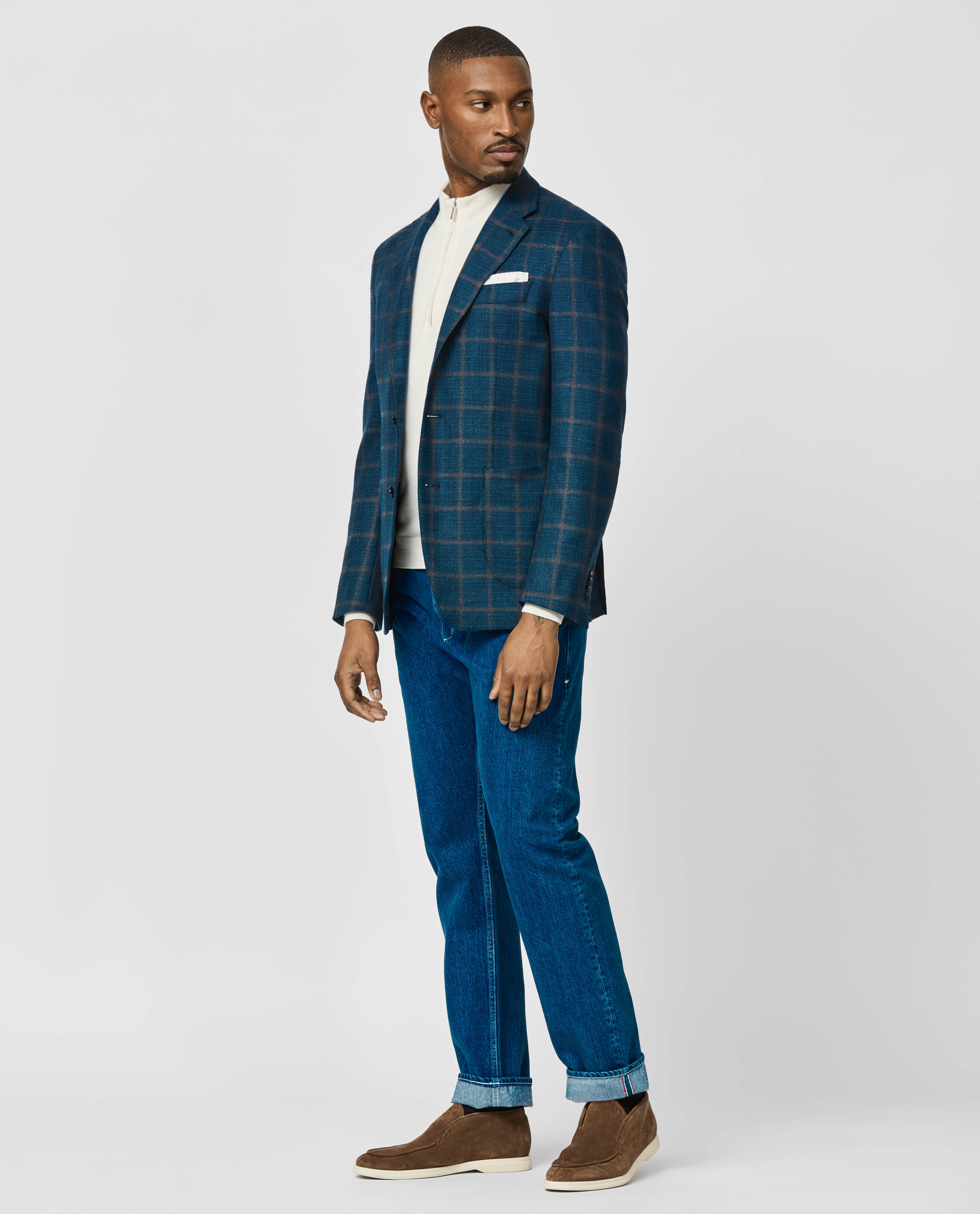 The sports jacket is most loved for its versatility: from laid-back to semi-formal, its overall vibe depends entirely on your choice of separates. For a hybrid business-casual look, we recommend pairing this aqua blue wool windowpane with a cashmere half-zip knit, classic blue selvedge jeans, a beige flannel pocket square, and our brown suede mid-top city loafers.