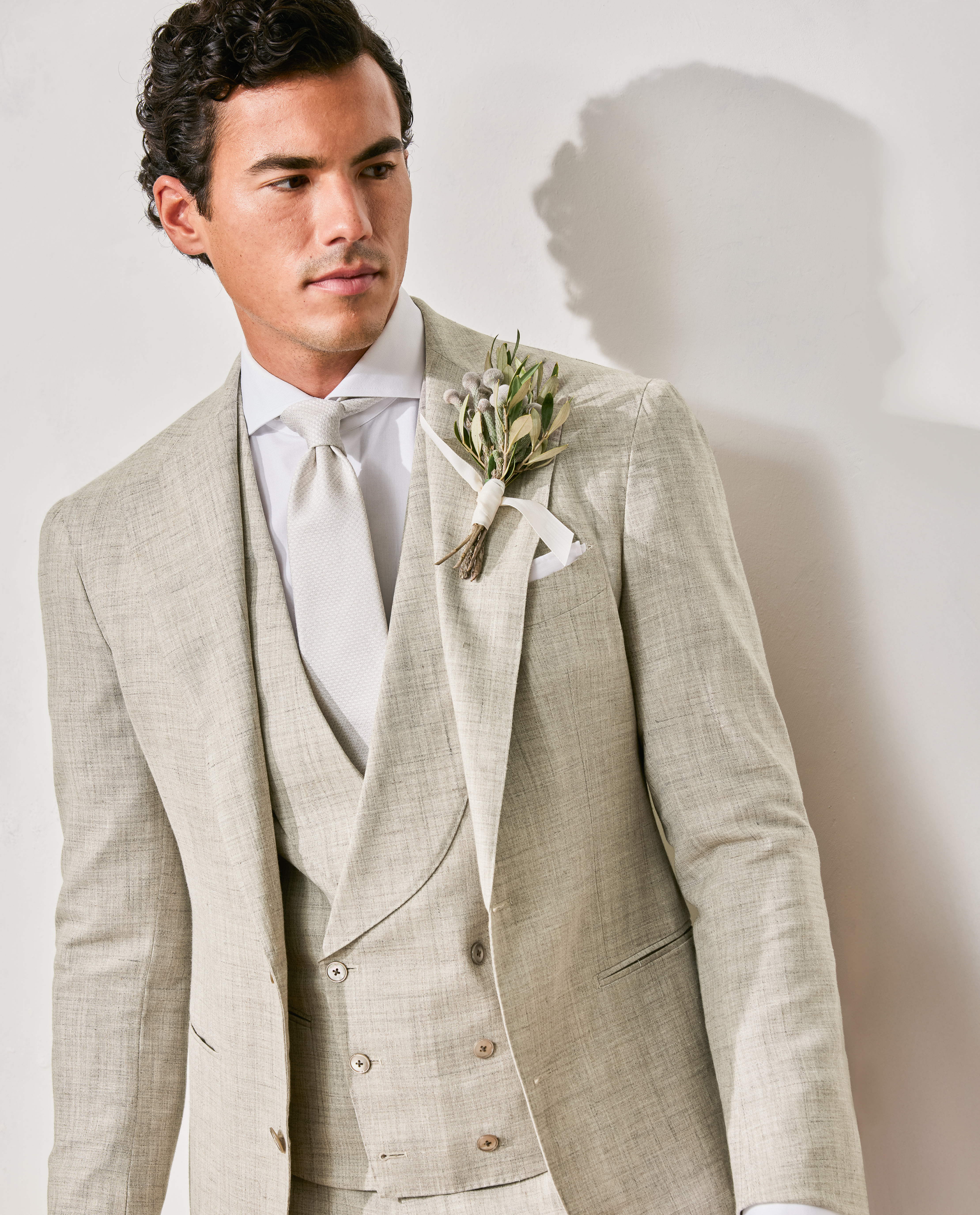 Light, airy, and sharp yet understated, this beige three-piece suit offers an appealing alternative to full-on white. Crafted from artfully composed wool-silk-linen Summertime® fabric made in Italy by Loro Piana, it forms a cohesive neutral palette when styled with a crisp white shirt, silver tie, and taupe suede penny loafers – an ideal pairing for outdoor or beach ceremonies.