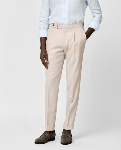Lightweight and sandy-hued, these light fresco trousers can be worn all year round. Crafted from pure wool with natural stretch, constructed in a breathable open weave for a comfortable pair of pants that won't easily wrinkle. Designed here with an extended waistband and a 4cm turn-up. Make these trousers your own with our many customization options to choose from. 100% wool Natural stretch Breathable Lightweight Crease resistant