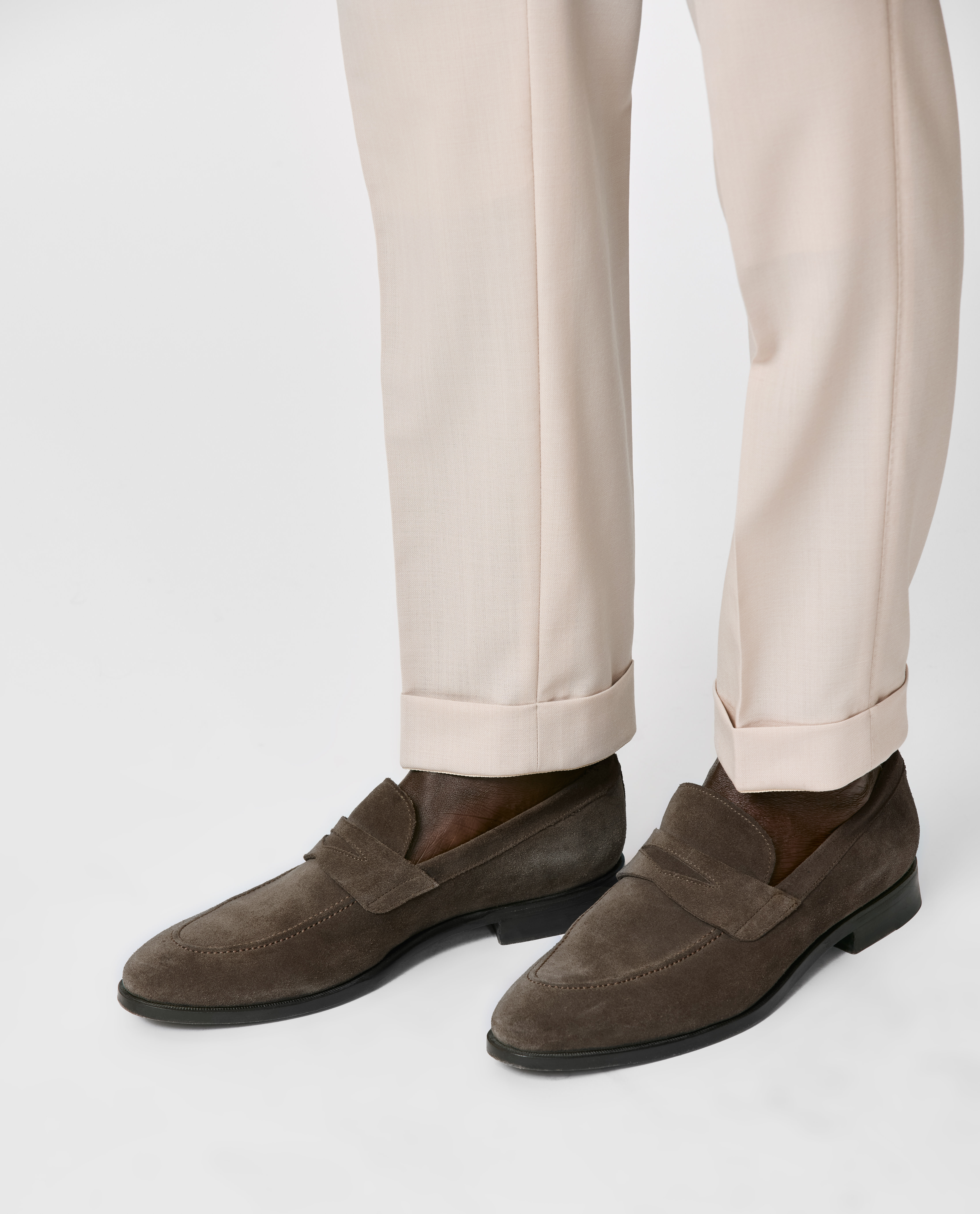 Classic meets casual, these taupe handmade loafers are a comfortable option for everyday. The soft suede napping on chrome-tanned calfskin leather features a water-resistant finish. Make these shoes your own with our many customization options to choose from.