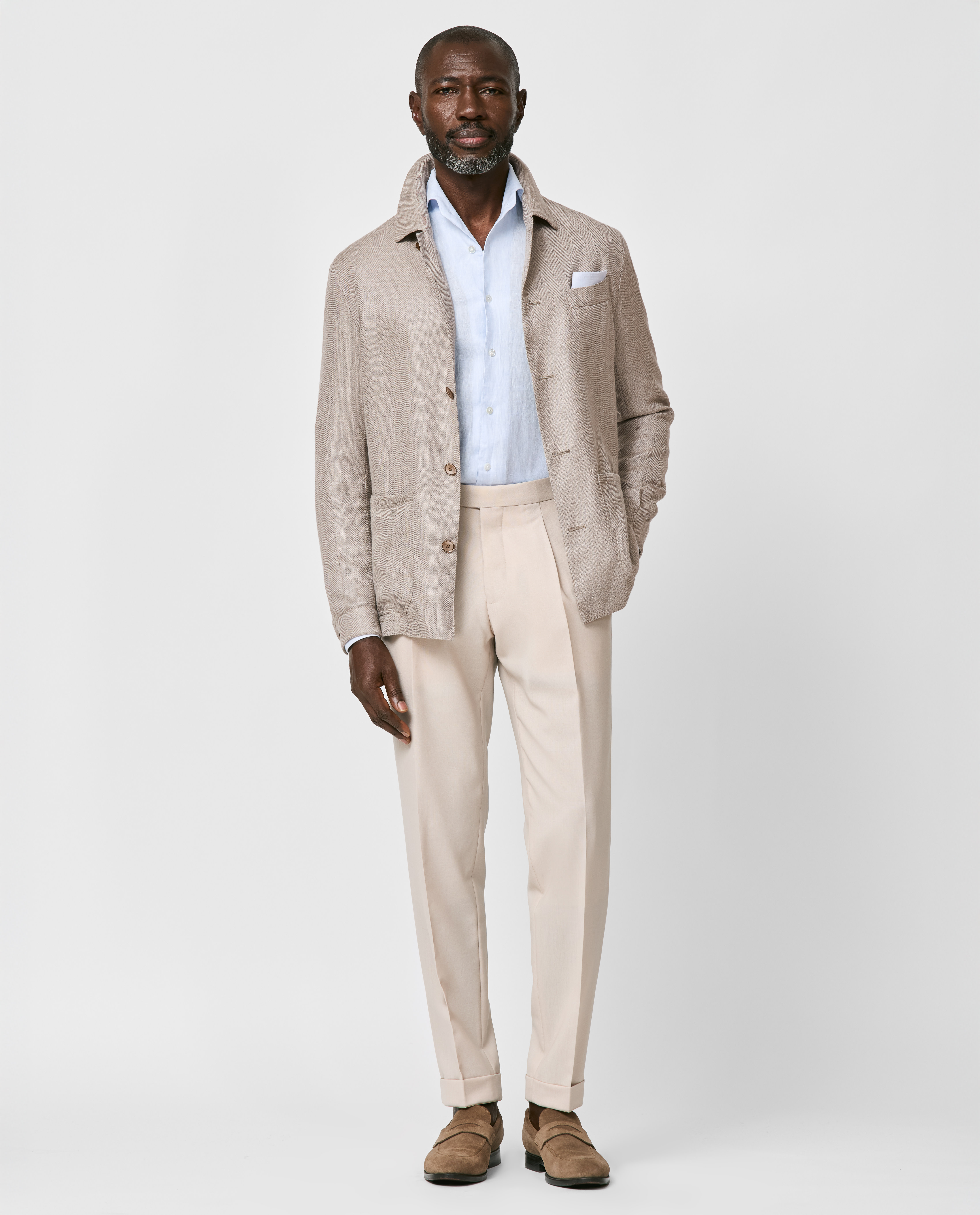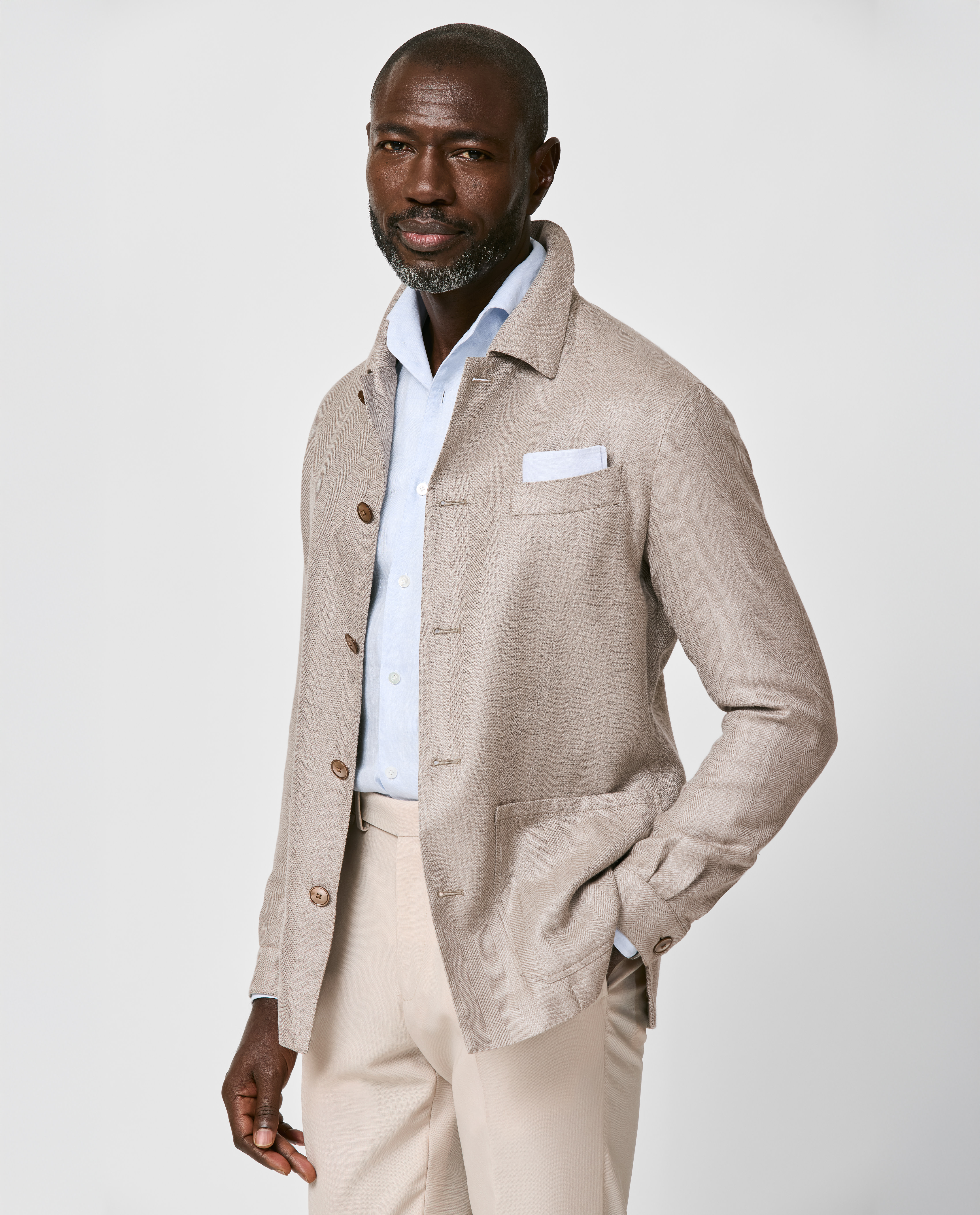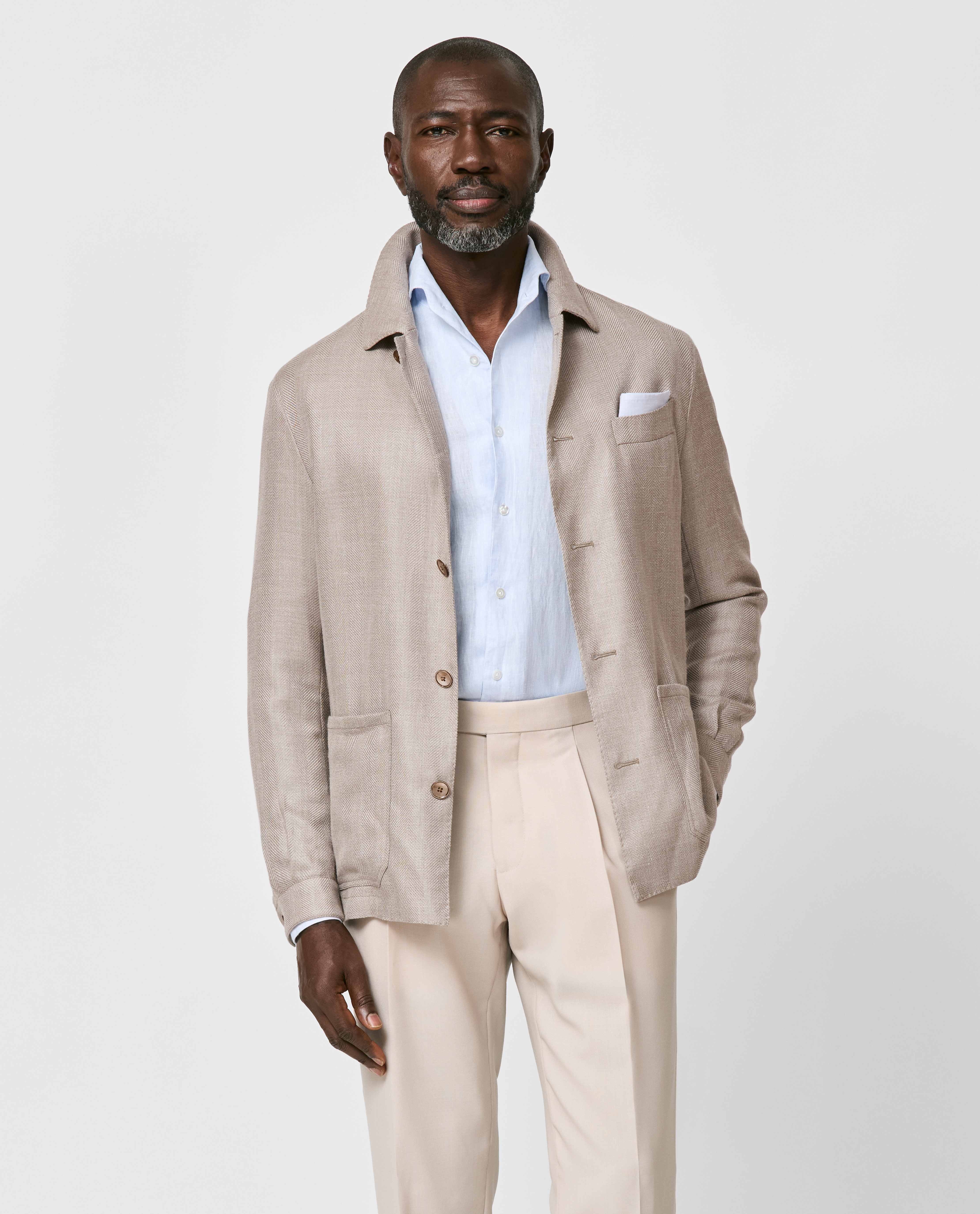 Crafted from a lightweight wool-silk-linen herringbone weave with excellent breathability and a luxurious, subtle sheen, this light beige utility jacket features a 5-button closure, rounded welt chest pocket, and utility patch side pockets. Pair it with a matching linen shirt and pocket square, wool trousers, and suede loafers to create a fresh seasonal look. Prefer a different style? Every piece is made exclusively for you, with your choice of design options. Wool, silk & linen Herringbone Breathable Lightweight