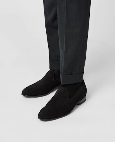 Add a touch of casual luxury to your look with these black loafers. The soft suede calfskin leather is chrome tanned and features a water-resistant finish to withstand the wetter months. Designed here as a plain toe loafer with a rubber sole. Make these shoes your own with our many customization options to choose from. Handmade Suede calfskin leather Chrome tanned Flexible Water-resistant finish