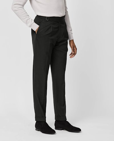 You can't get more classic than these charcoal gray trousers. Made from a S150 wool gabardine by VBC with a four-season weight and a smooth feel. Designed here with a high waistband, single pleats, and a turn up. Make these trousers your own with our many customization options to choose from. S150 wool Gabardine Four-season weight Smooth feel