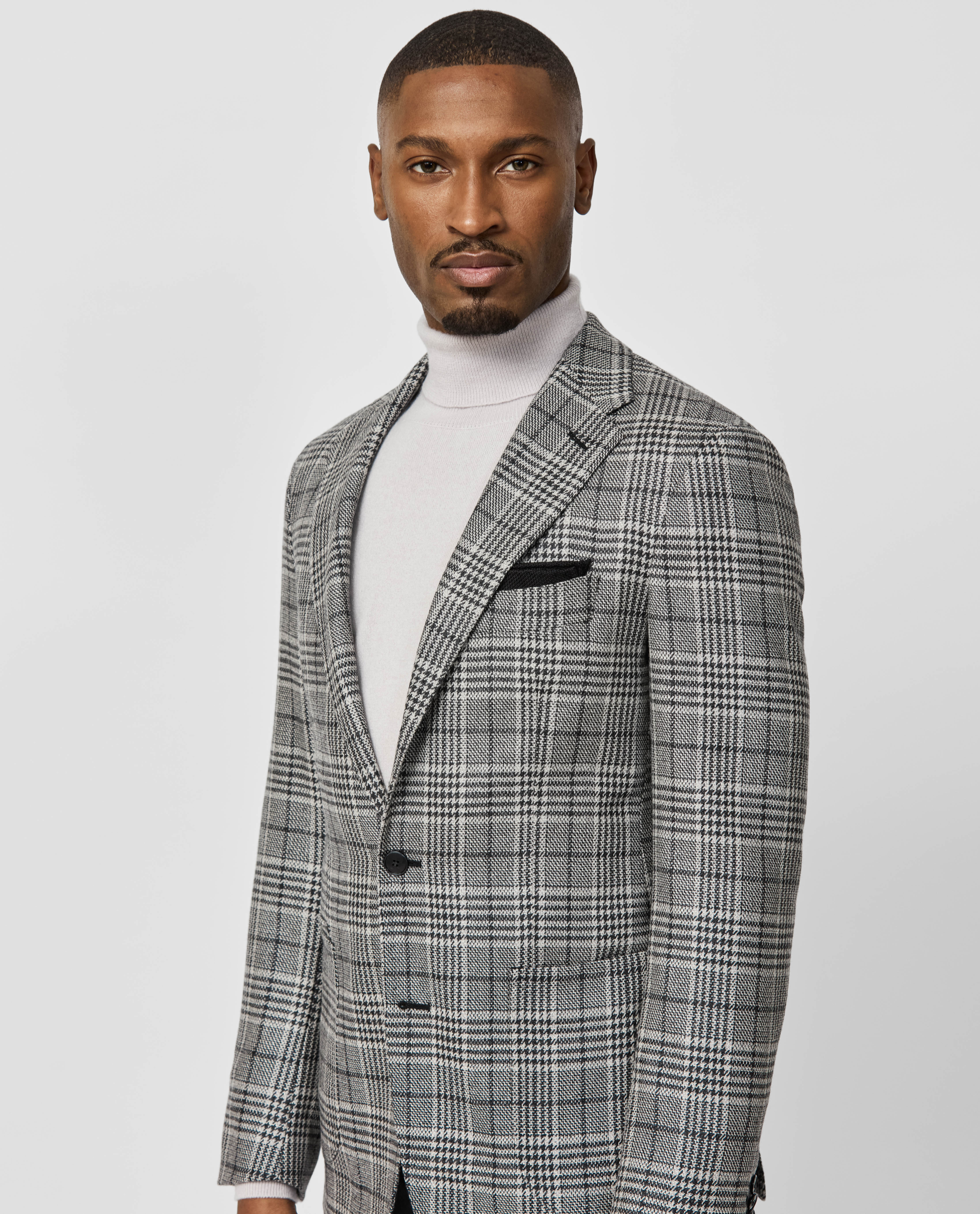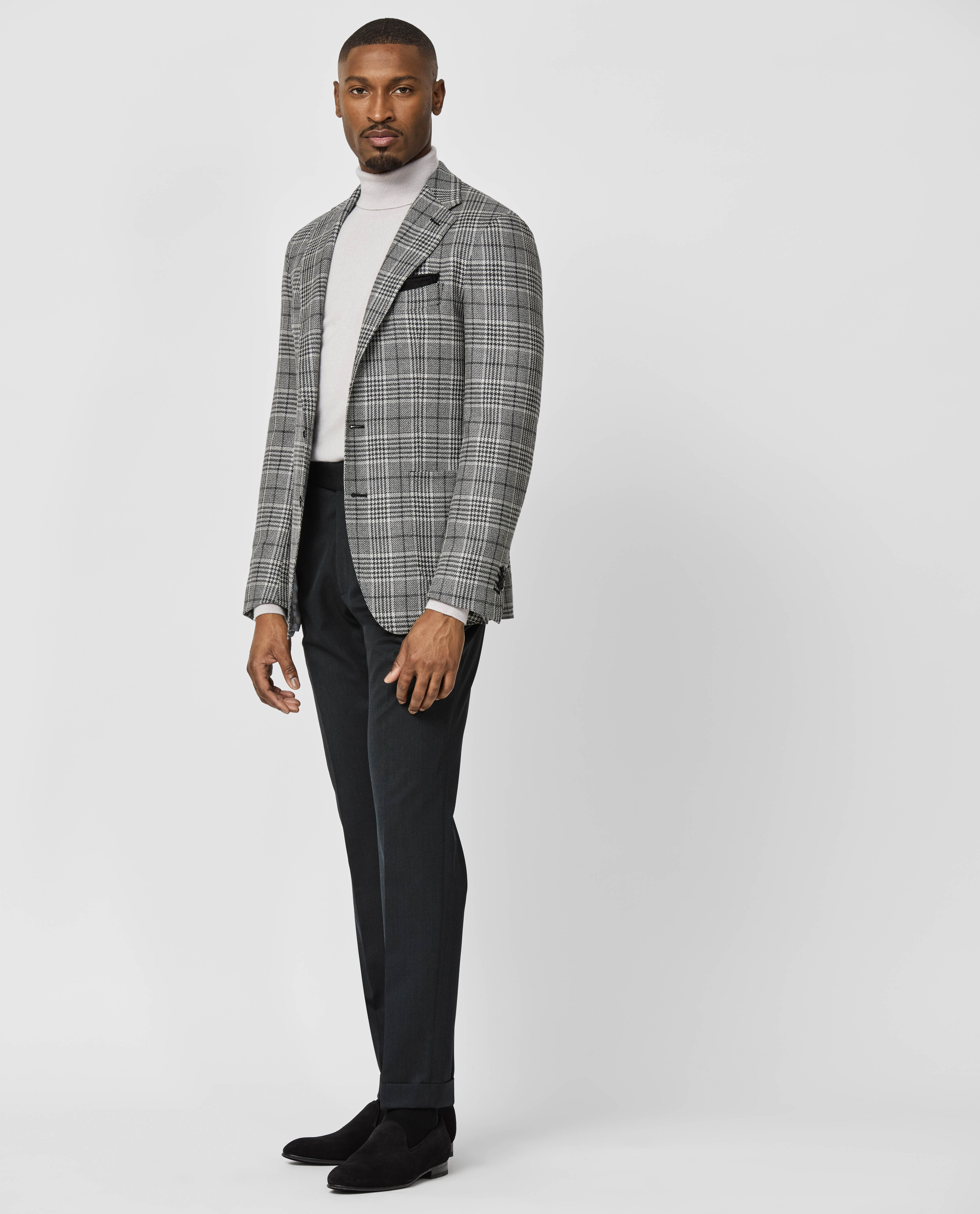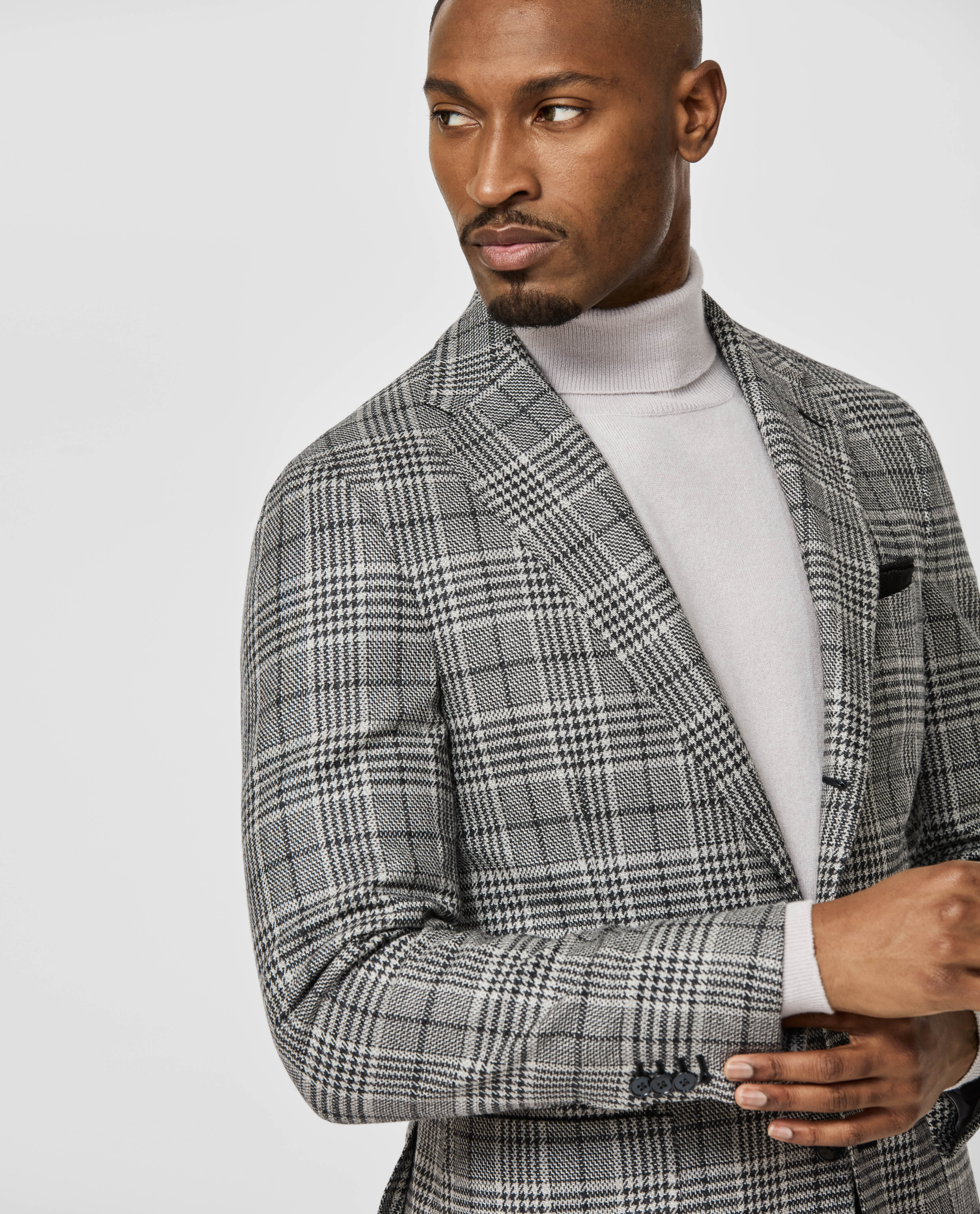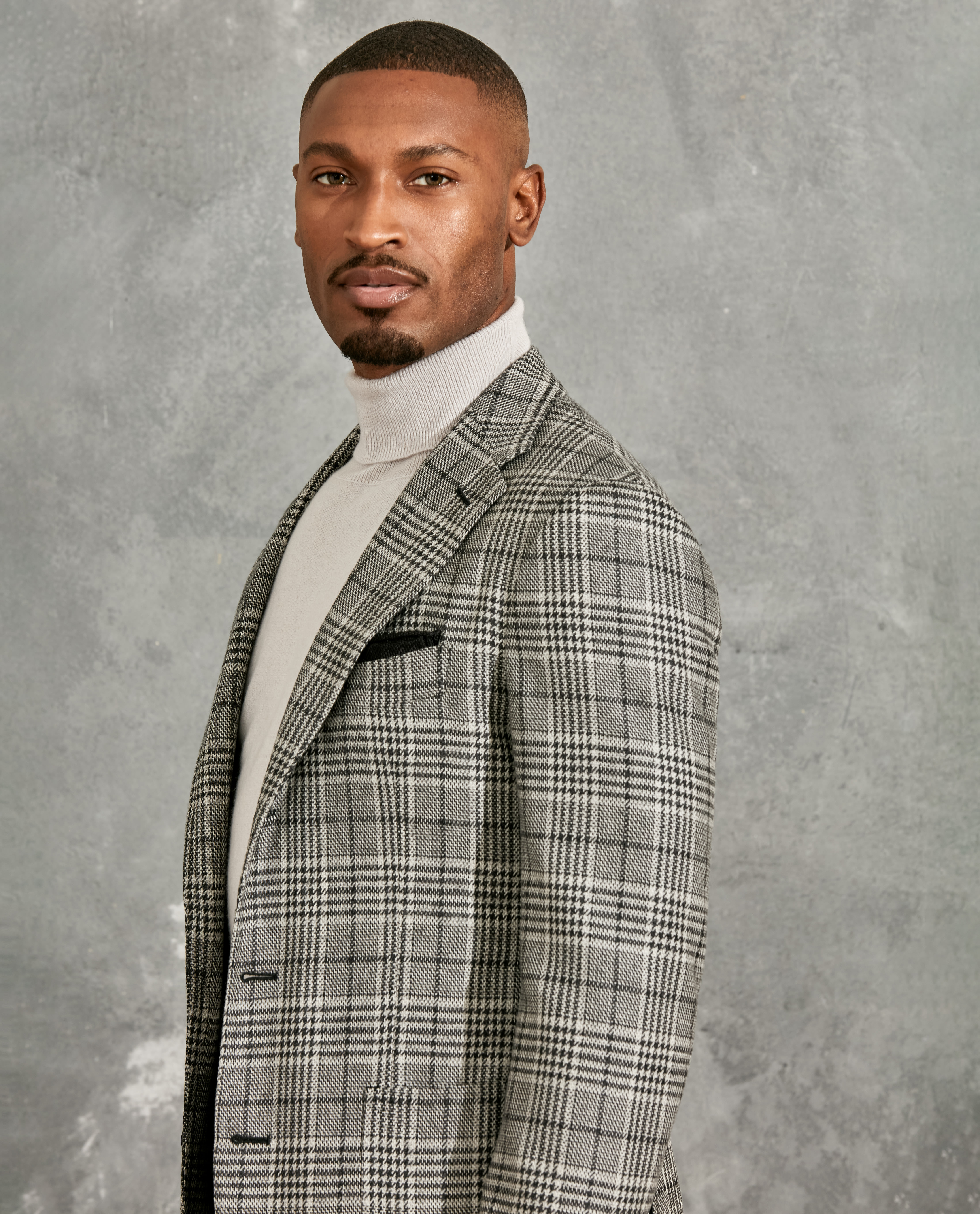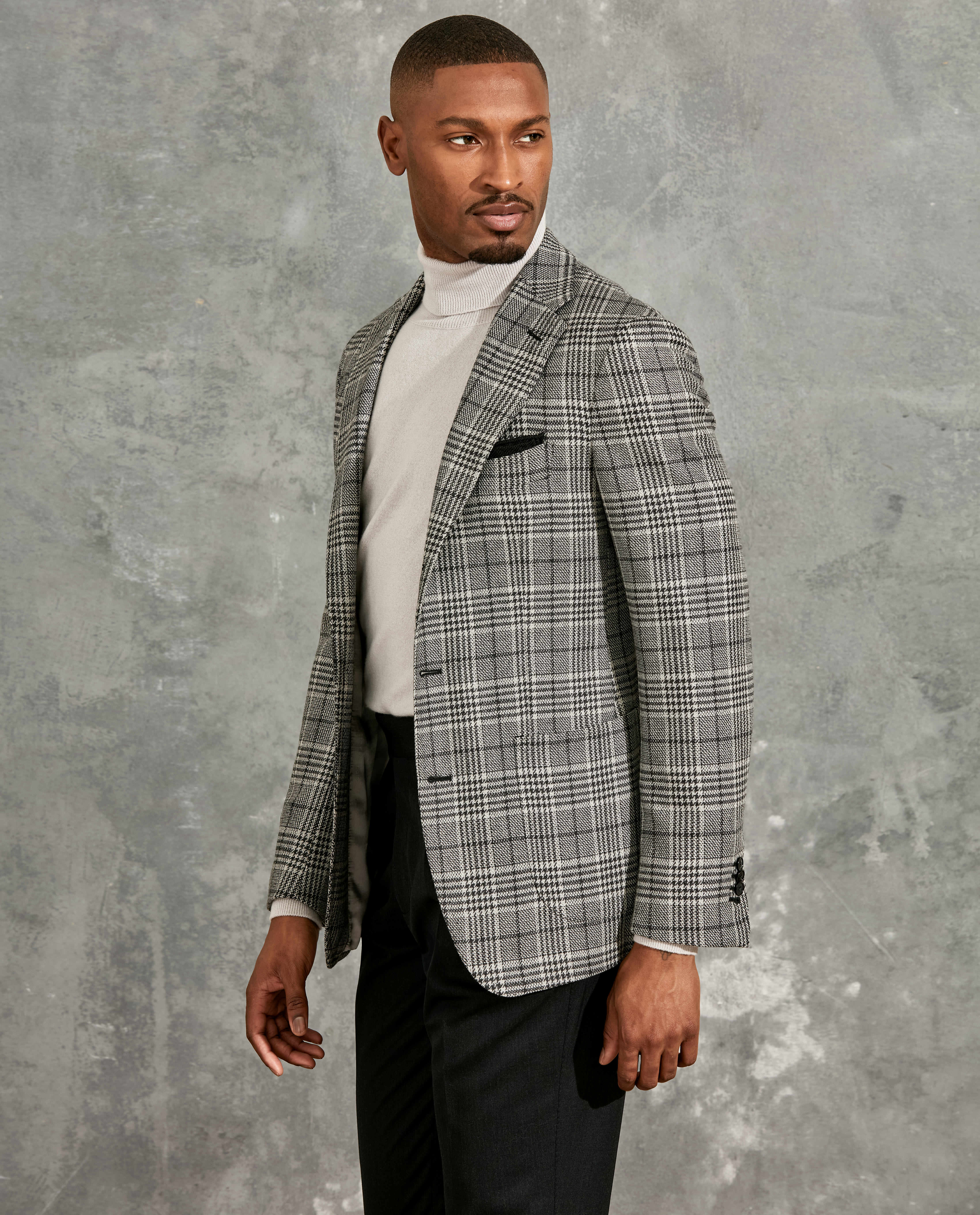 With a bold pattern and distinctive tweed look, this salt-and-pepper plaid jacket is a classic reimagined. Crafted from Capolavoro Tweed® fabric made in Italy by Loro Piana. The blend of wool with a touch of silk is both super soft and warm. Designed here with low-gorge lapels. Style it with a turtleneck, woolen trousers, and suede loafers to complete the look. Make this jacket your own with our many customization options. Wool & silk Glen plaid Tweed look Warm Soft feel