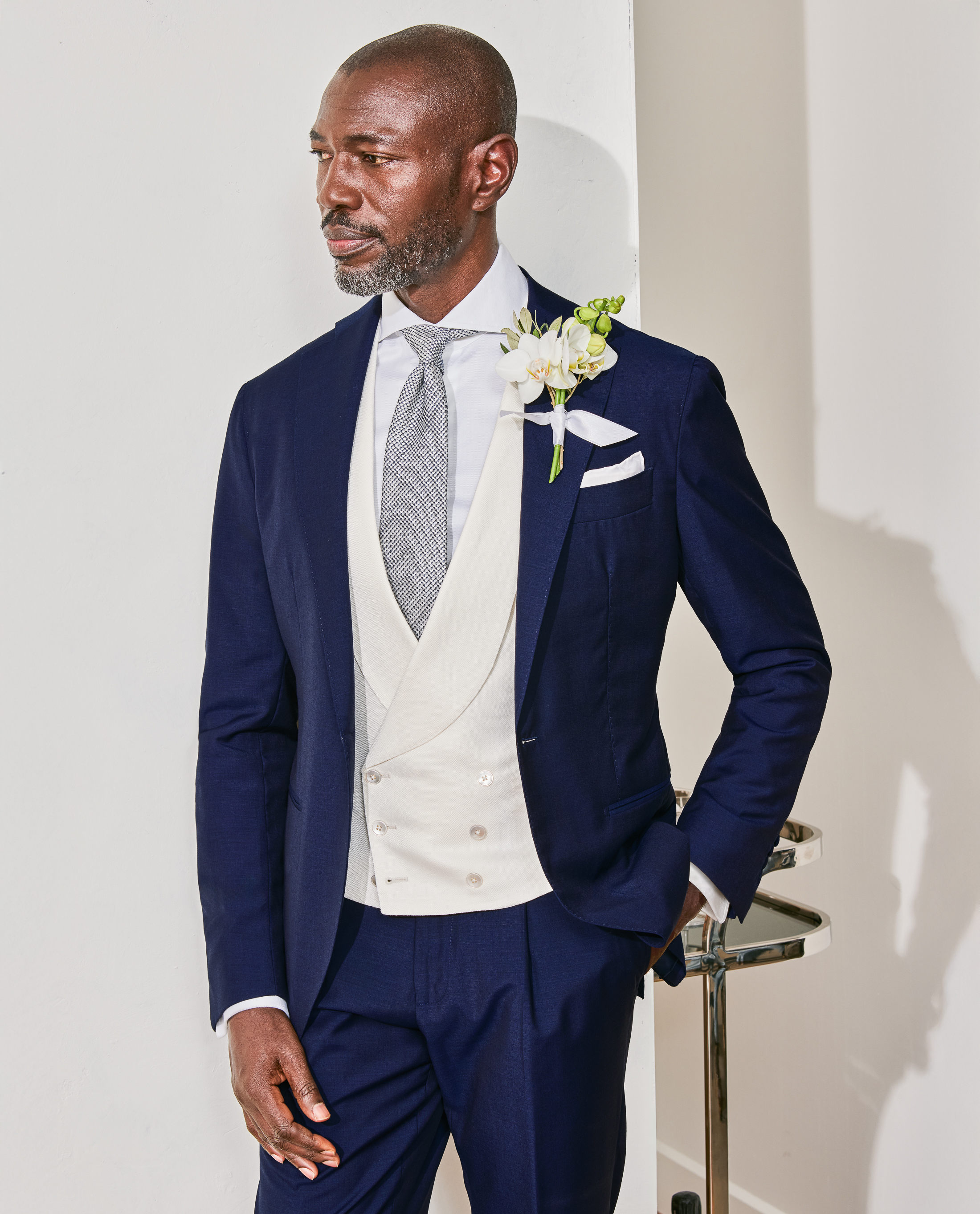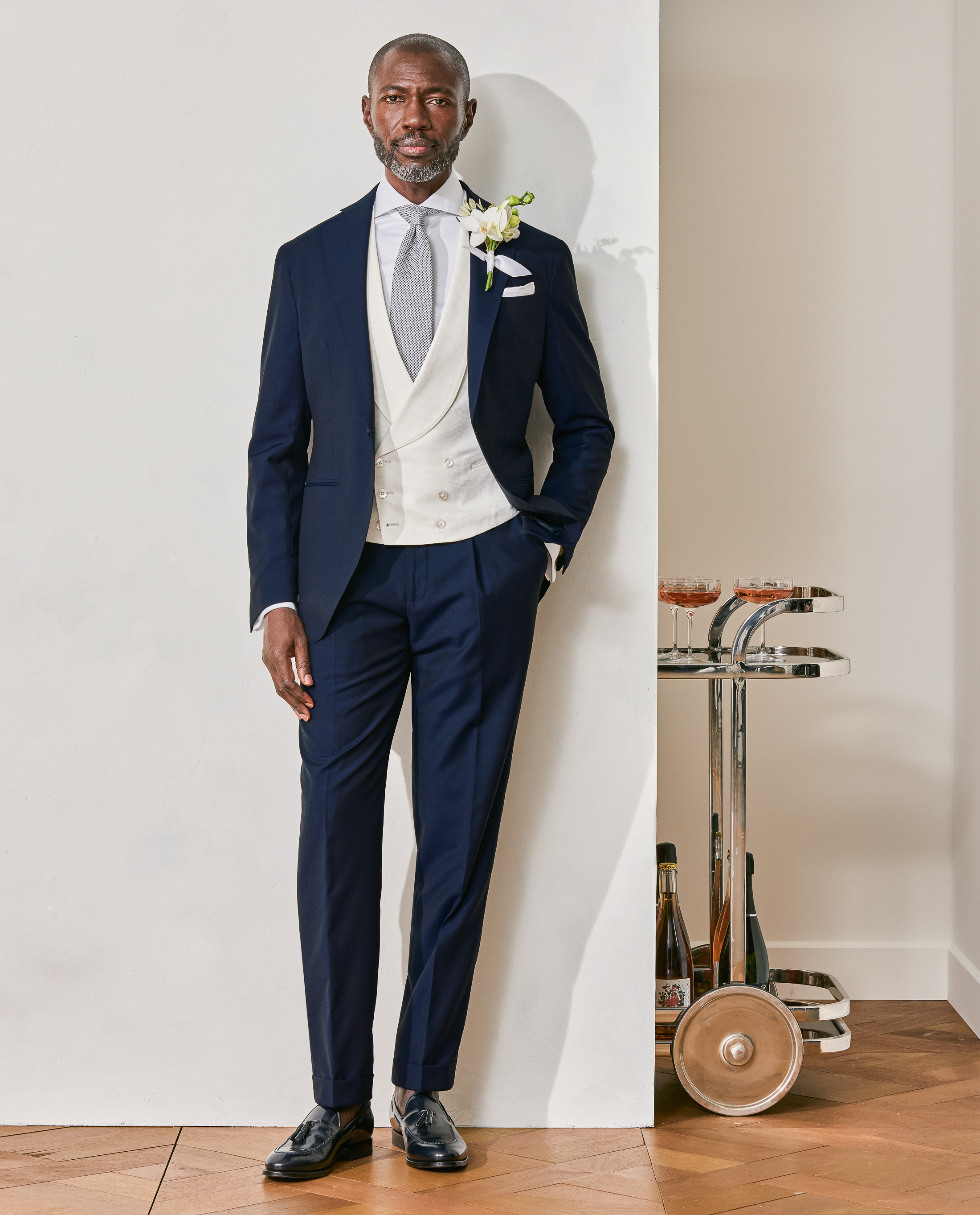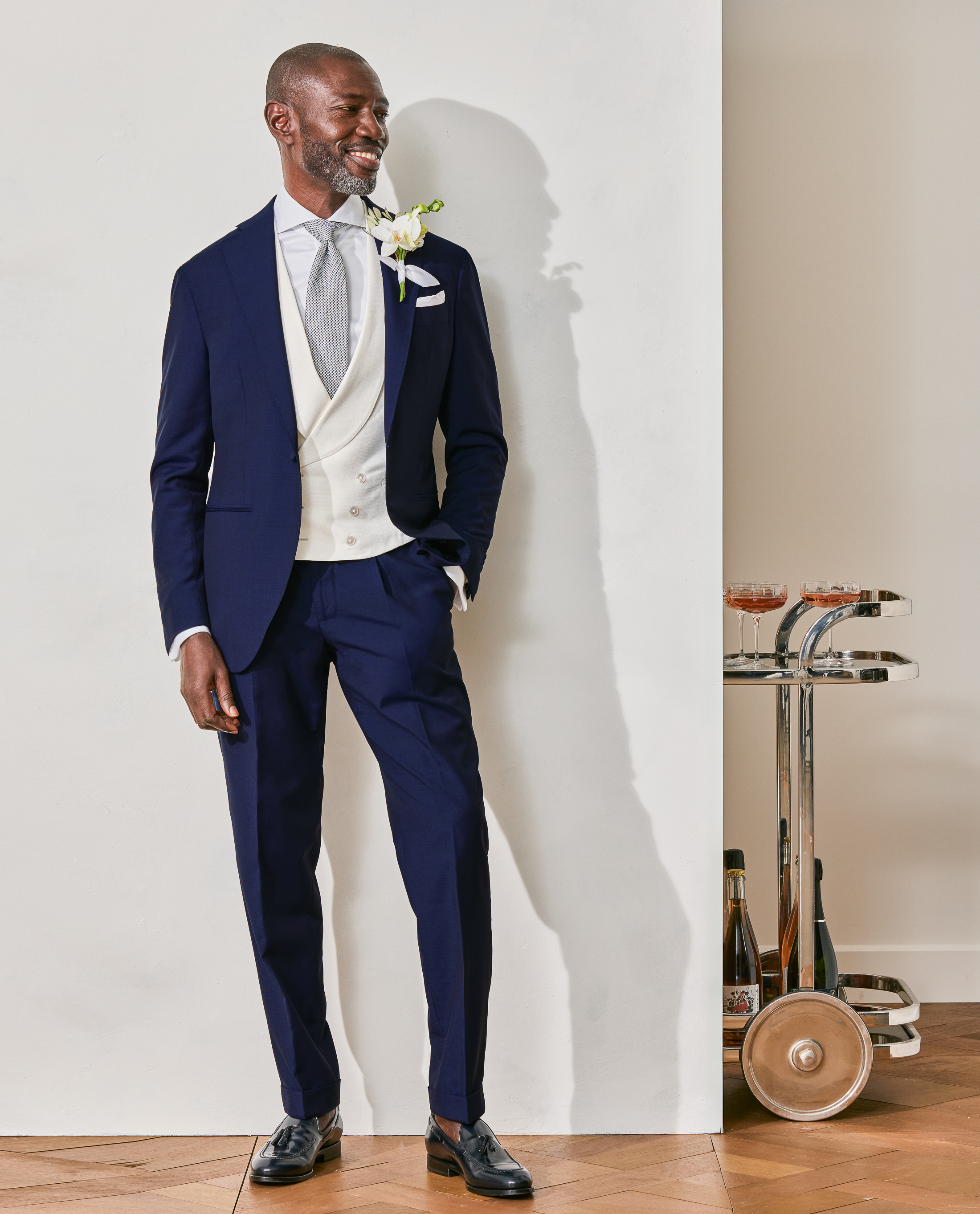 Rich in color and detail, this short morning jacket with matching trousers in Neapolitan blue S100 Solaro wool is refined and distinctive all on its own – and it's made truly extraordinary by the addition of an off-white double-breasted waistcoat with shawl lapels. Undeniably groom-worthy and chic with a classic white shirt, patterned blue tie, and polished blue tassel loafers.