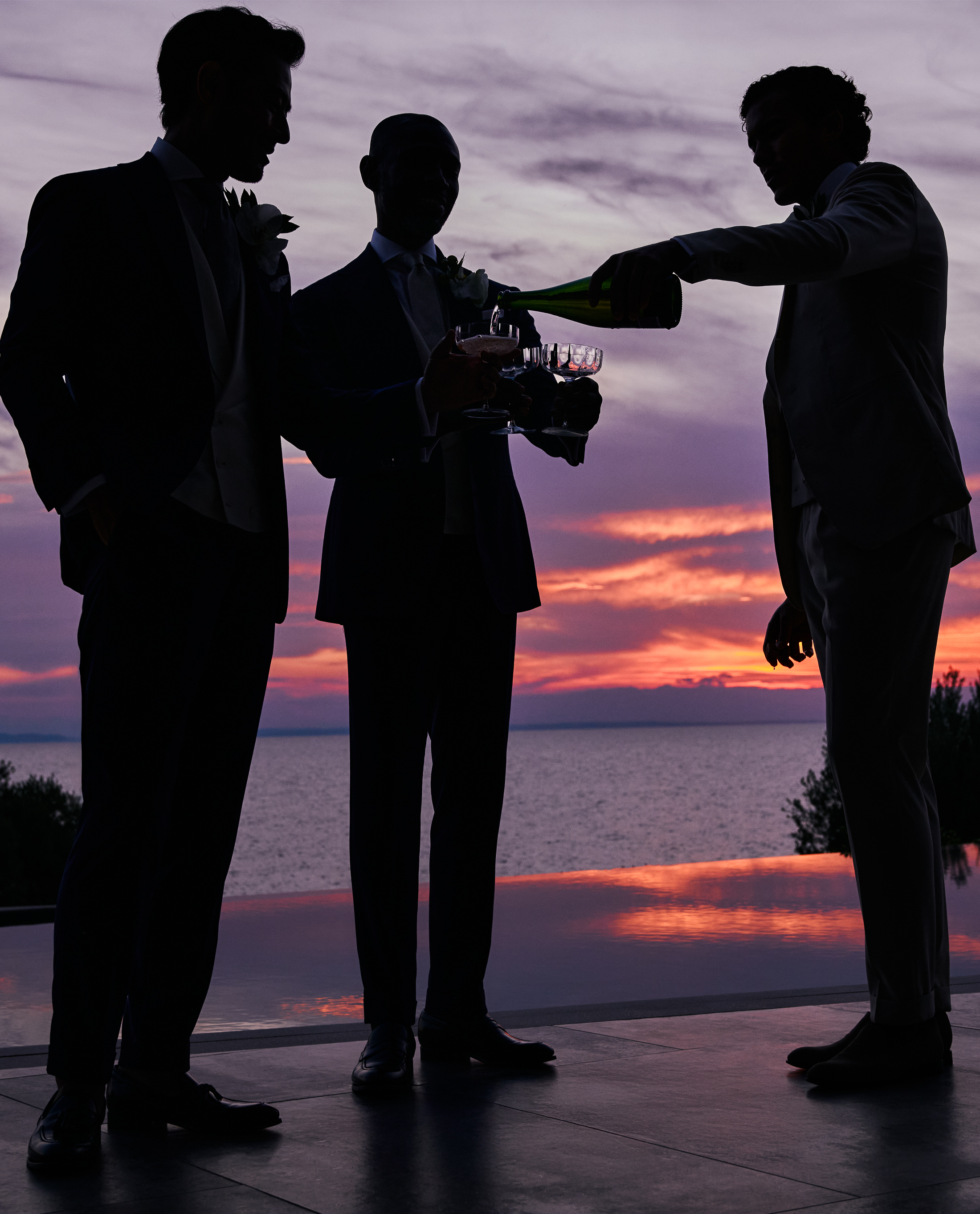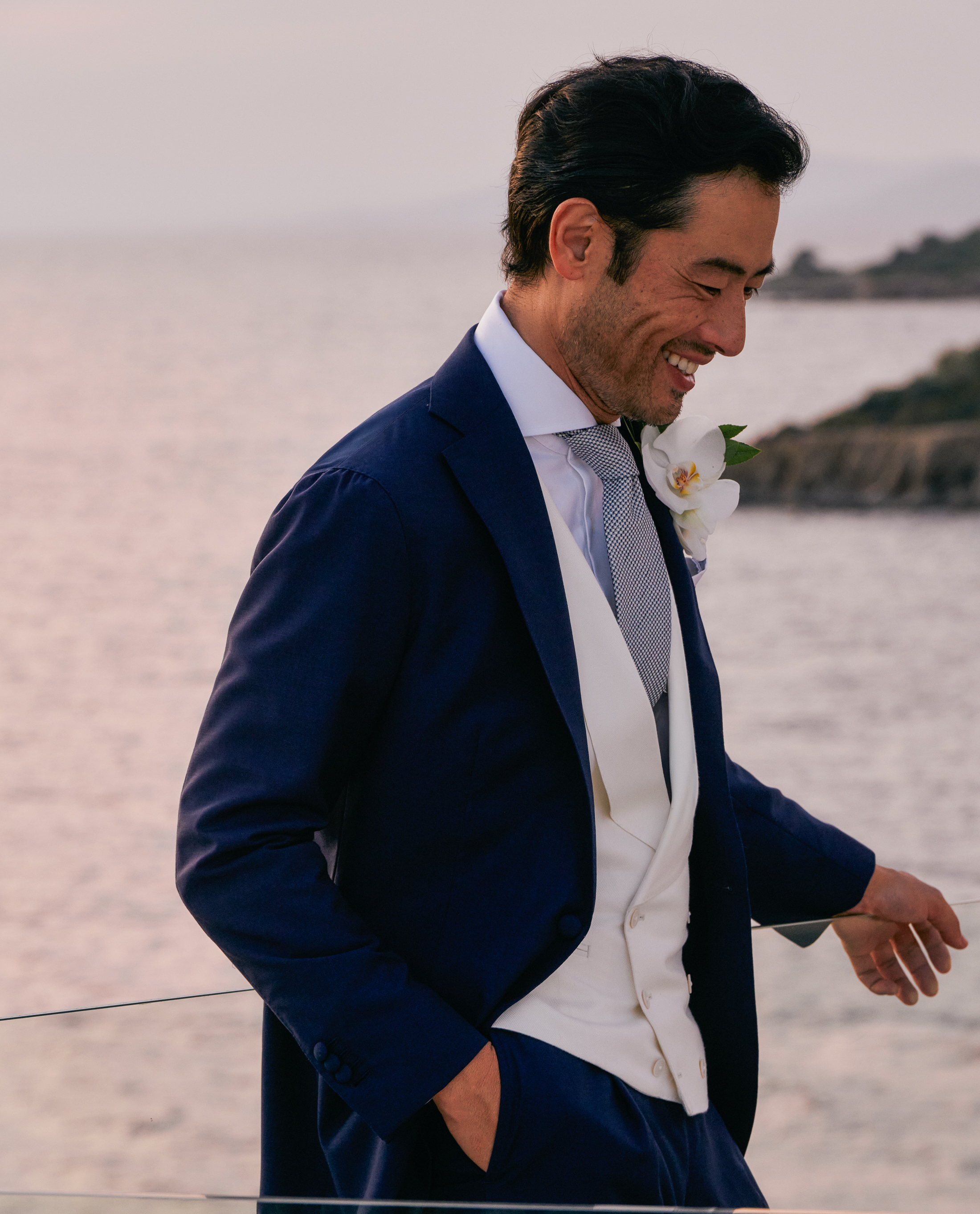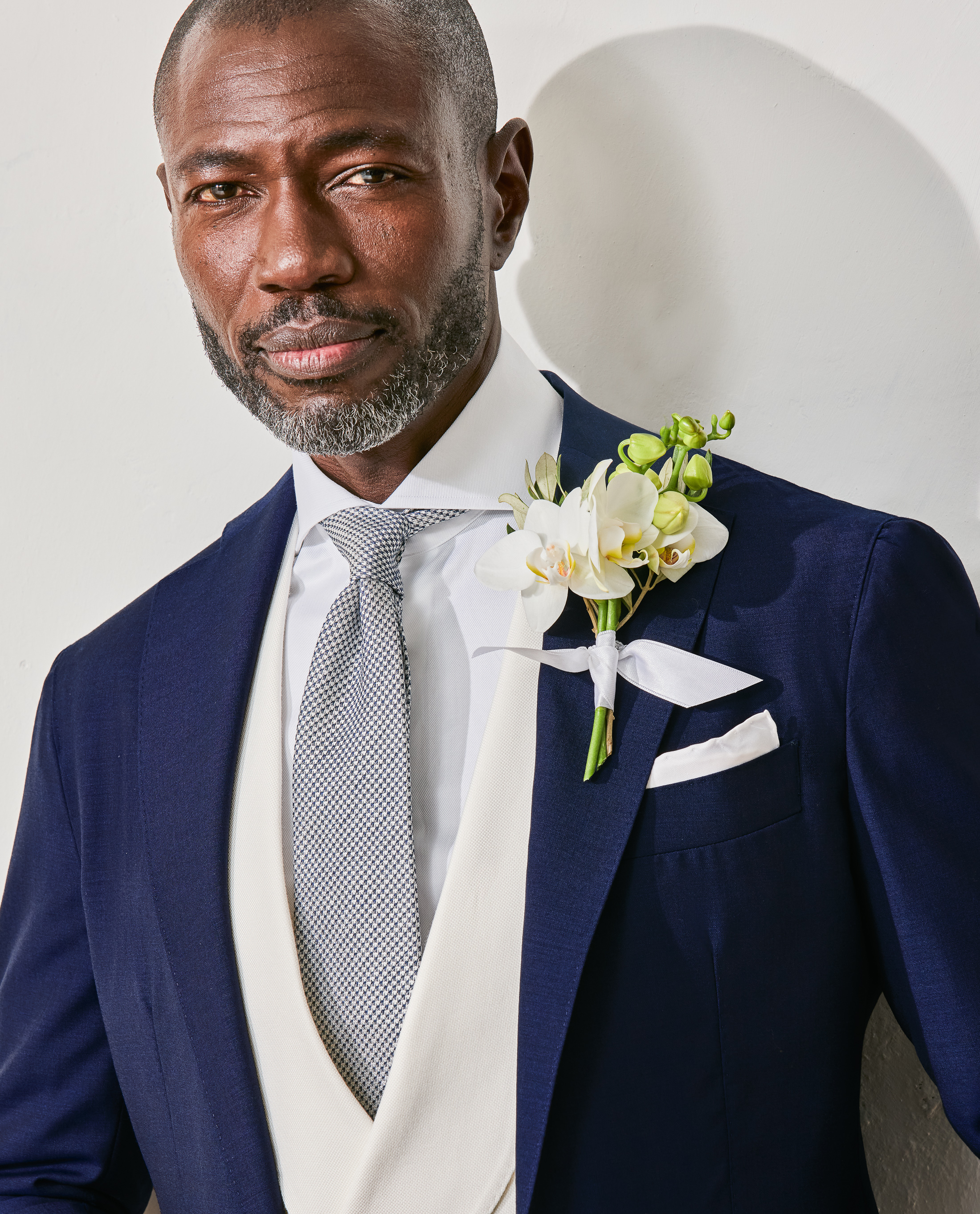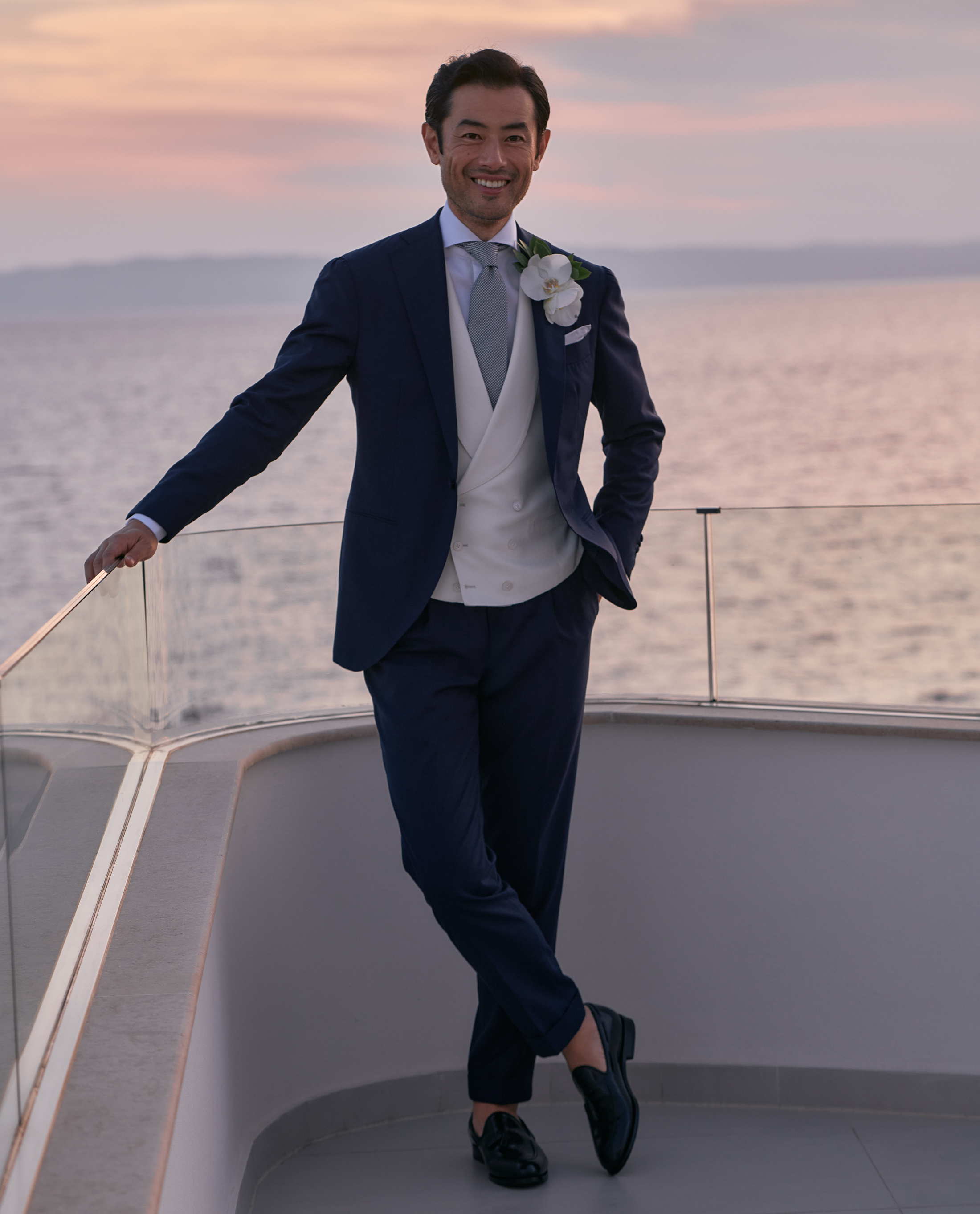 Rich in color and detail, this short morning jacket with matching trousers in Neapolitan blue S100 Solaro wool is refined and distinctive all on its own – and it's made truly extraordinary by the addition of an off-white double-breasted waistcoat with shawl lapels. Undeniably groom-worthy and chic with a classic white shirt, patterned blue tie, and polished blue tassel loafers.