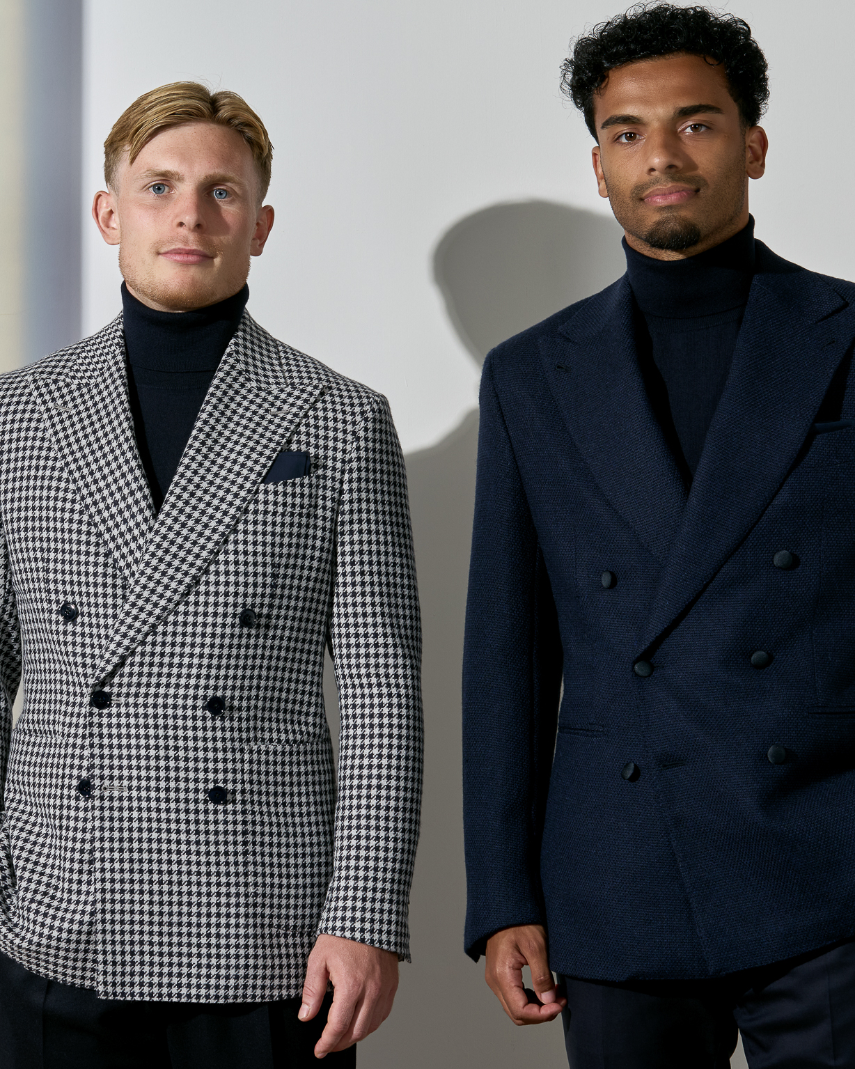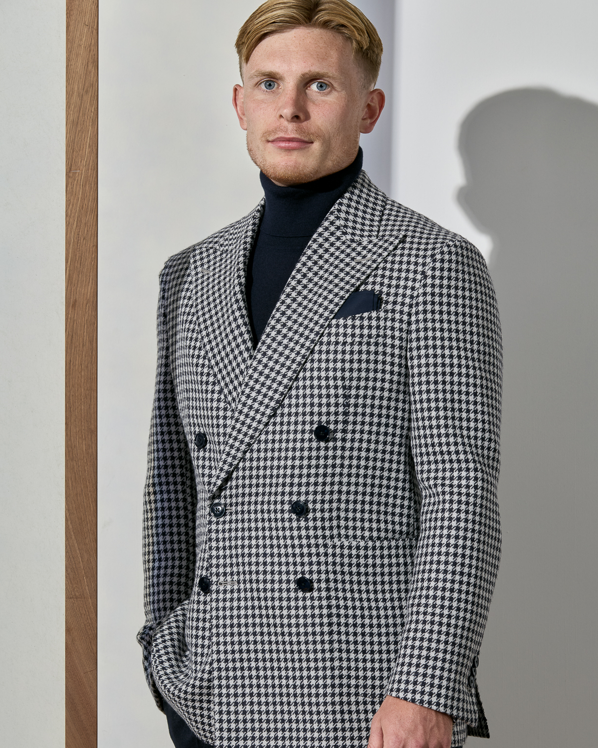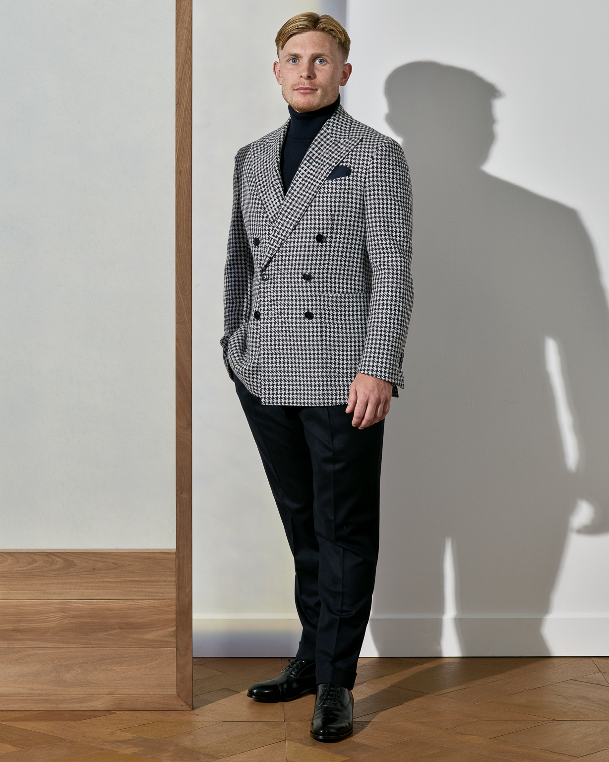 Oliver Advardsen, forward at AFC Ajax, offers a fresh twist on classic houndstooth with this midnight blue and off-white jacket. Styled with a turtleneck and S150 wool trousers in complementary tones, and finished with black penny loafers, the look is polished and captivating.