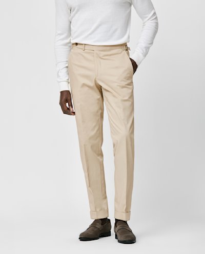 Stylish and comfortable, these sandy-colored trousers are a must have for summer. Constructed using an exclusive Ice Cotton yarn and woven with a touch of stretch, the blend offers a cool feel with more freedom to move. Make these trousers your own with our many customization options to choose from. Stretch cotton Durable