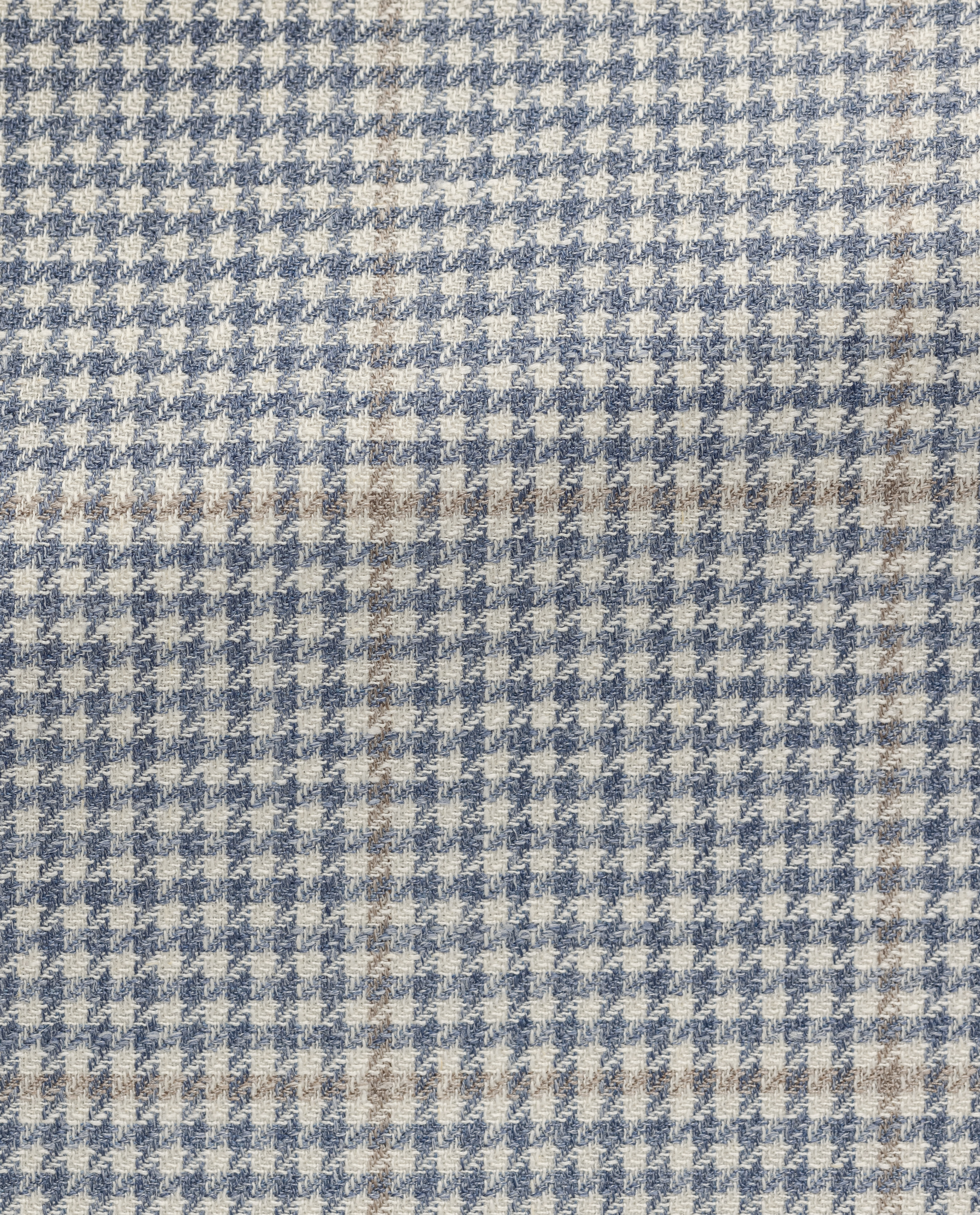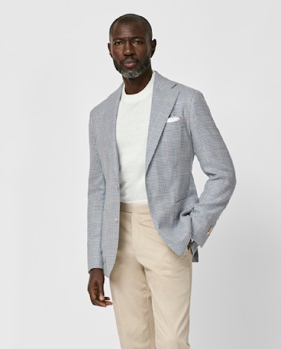 Crafted from a storm blue and ivory houndstooth weave with sand-colored windowpane, this breezy wool-silk-linen jacket offers the best of each fiber in a light yet versatile weight. Designed here with a classic 2-button closure, notch lapels, and modern patch side pockets. Pair it with a lightweight summer knit, trousers, and loafers to create a refined smart-casual look. Prefer a different style? Every piece is made exclusively for you, with your choice of design options. Wool, silk & linen Houndstooth with windowpane Breathable Light four-season weight