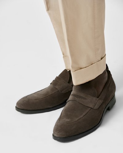 Classic meets casual, these taupe penny loafers are a comfortable option for everyday. Handmade from chrome-tanned suede calfskin leather with soft napping and a water-resistant finish. Make these shoes your own with our many customization options to choose from.