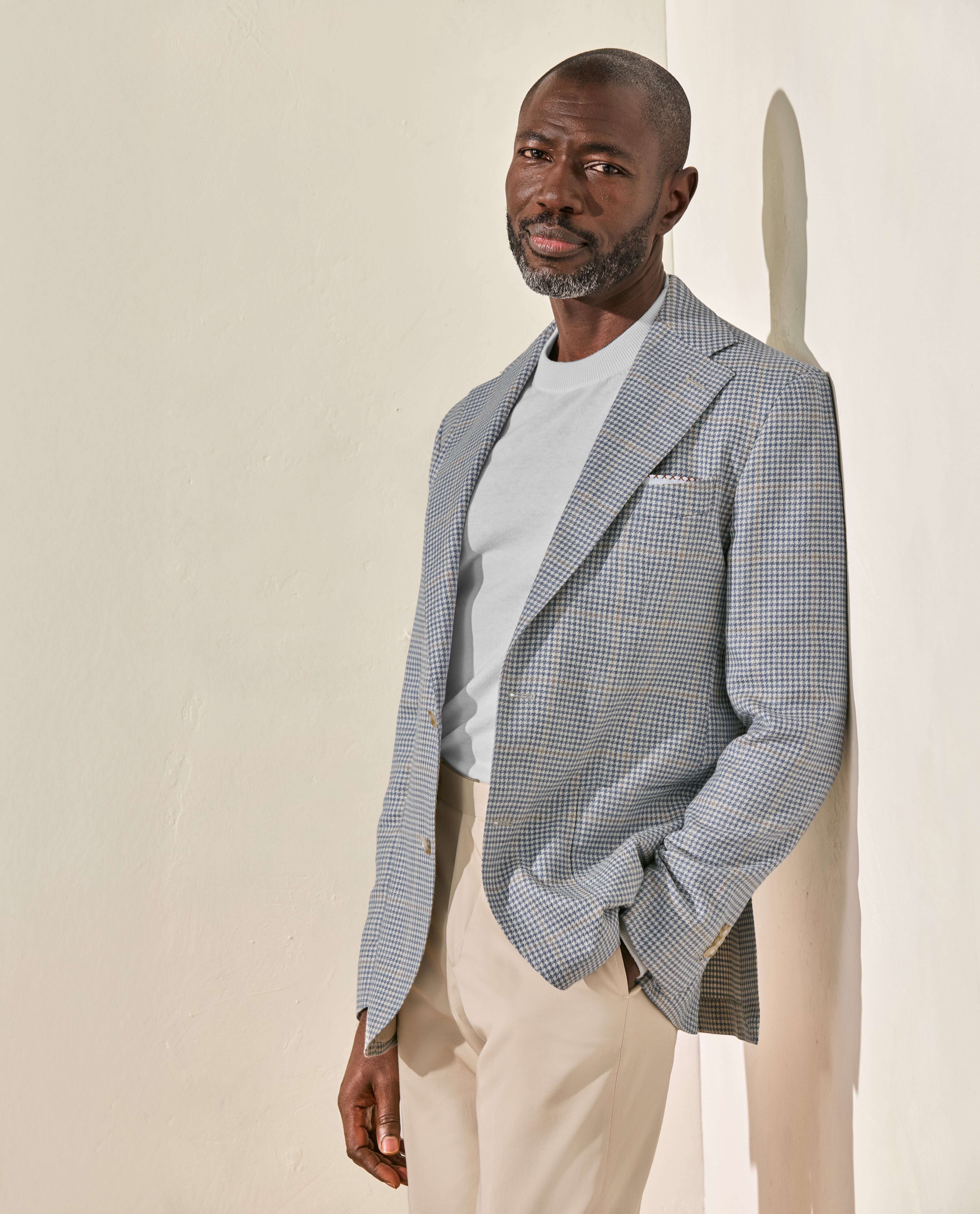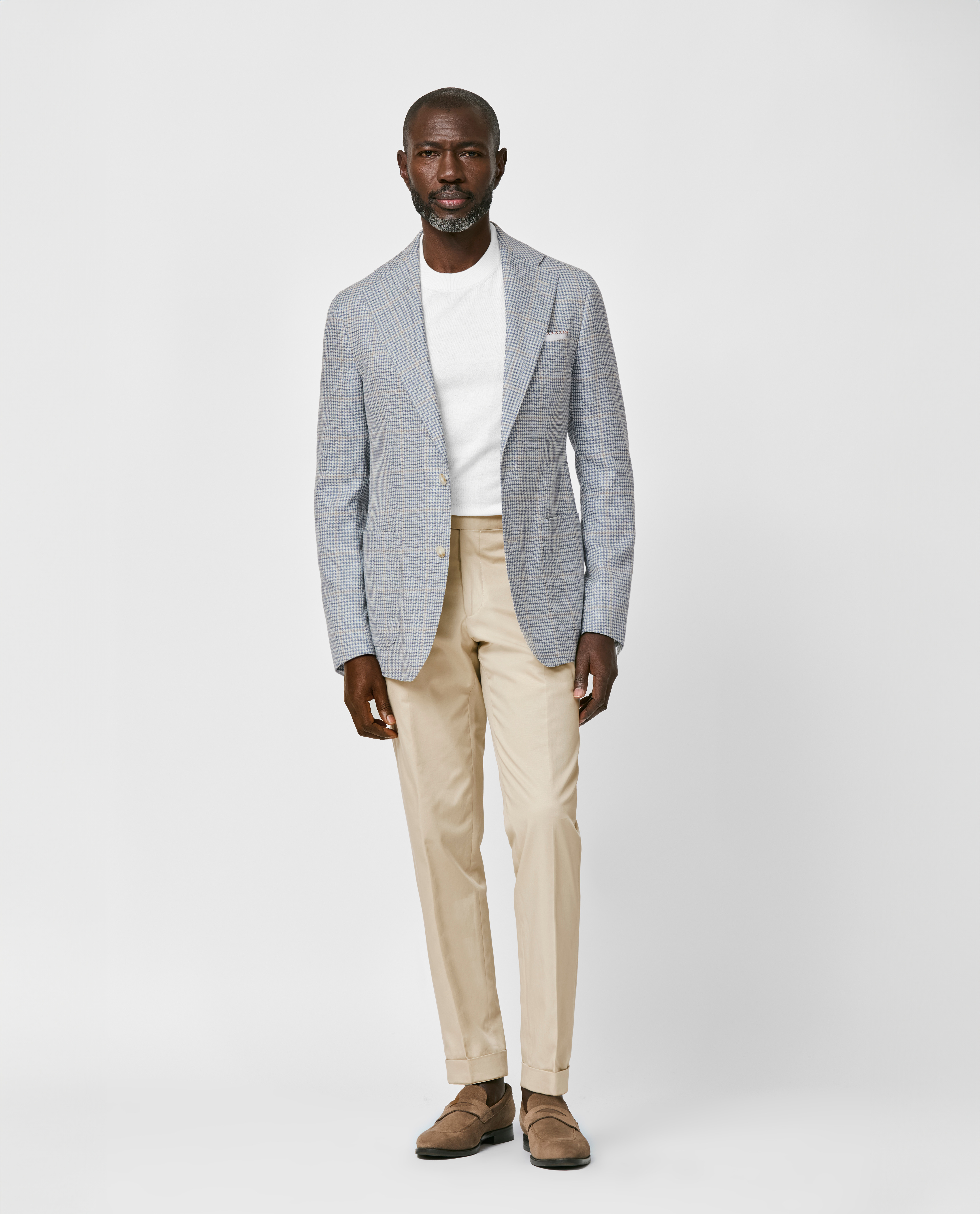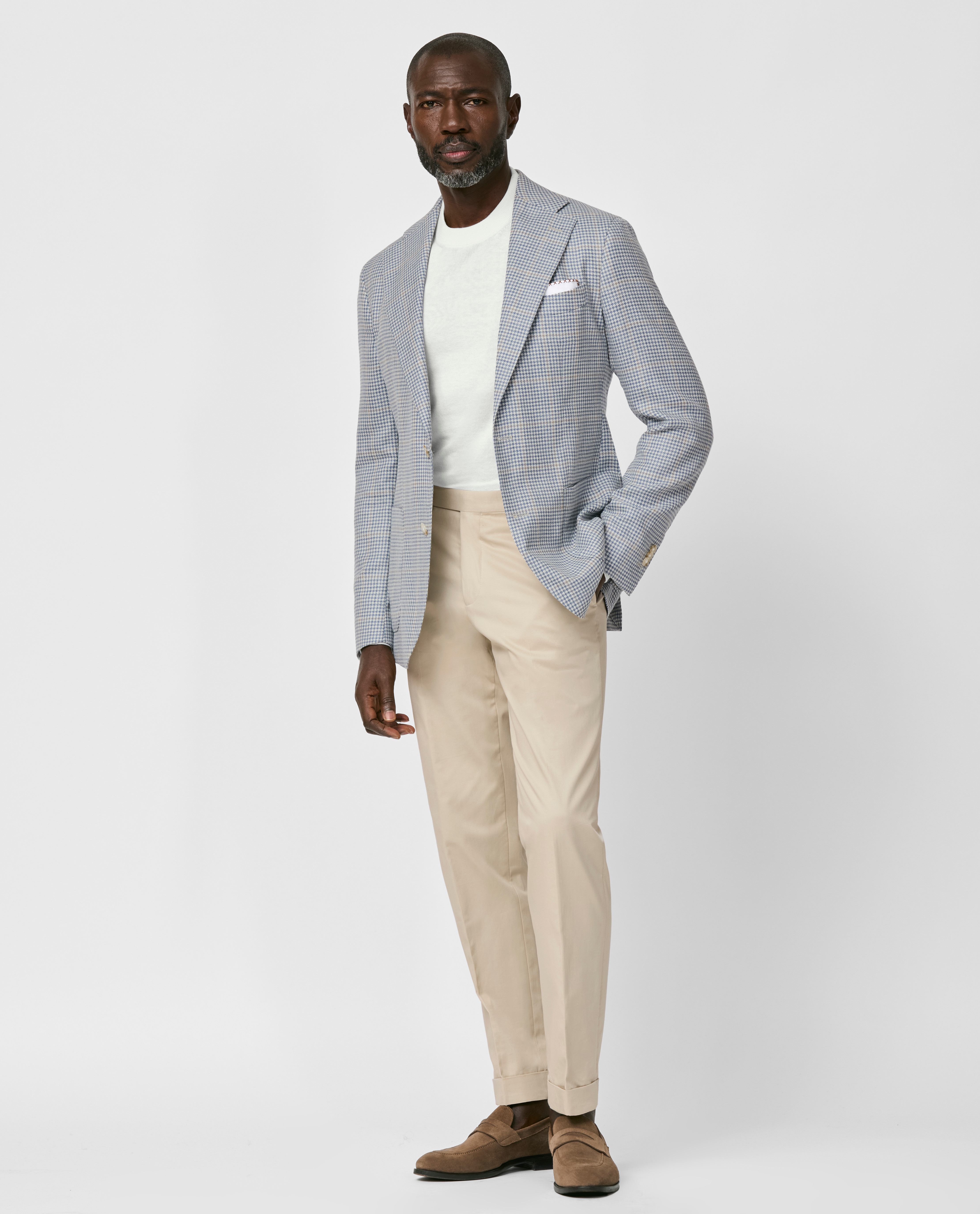 Versatile and striking, this storm blue and ivory houndstooth jacket with a subtle sand windowpane offers nearly endless possibilities for styling. Go formal with a white button-up, dark trousers, and tie – or opt for the smart-casual vibe shown here with your favorite summer knit, stretch cotton trousers, and suede penny loafers.