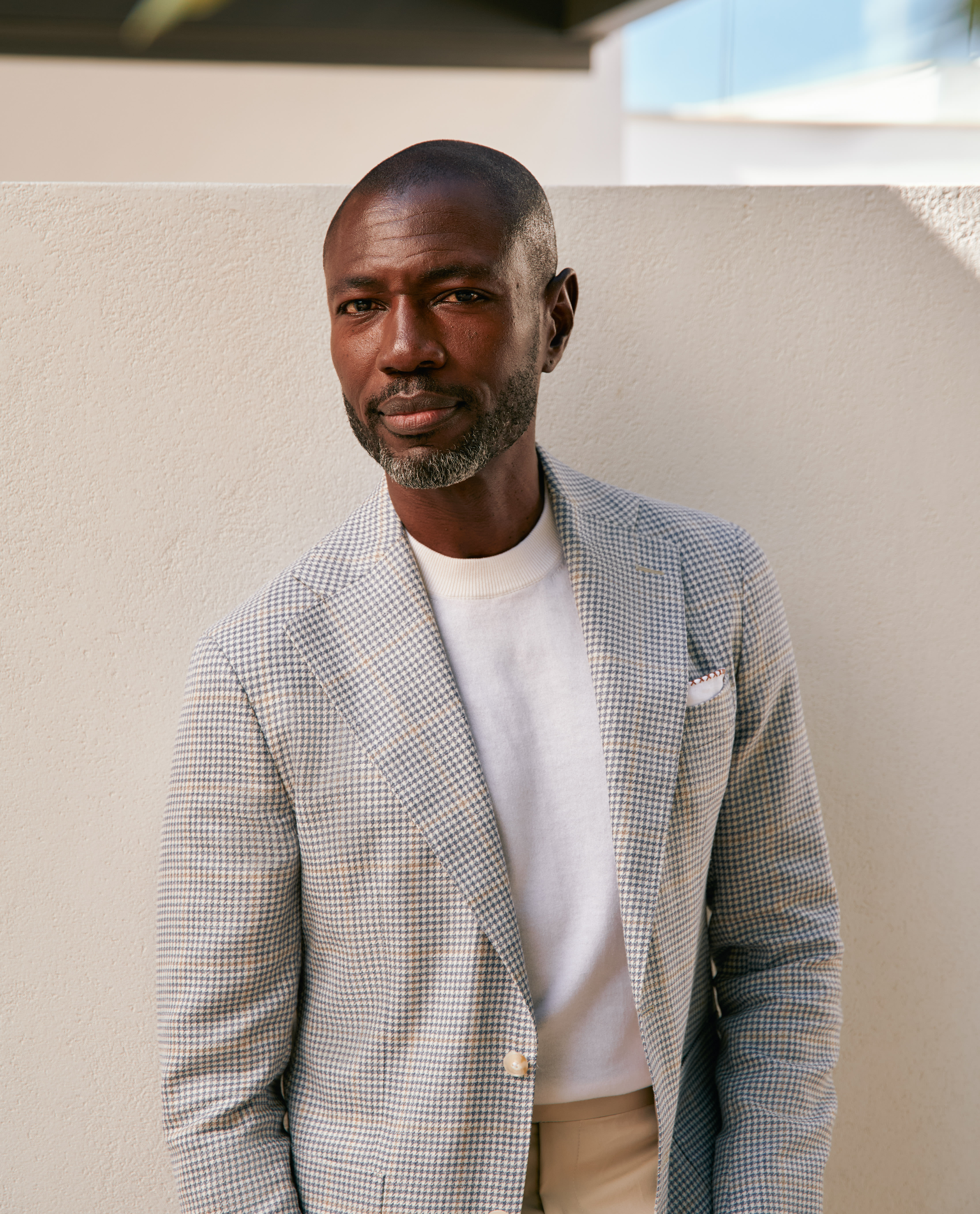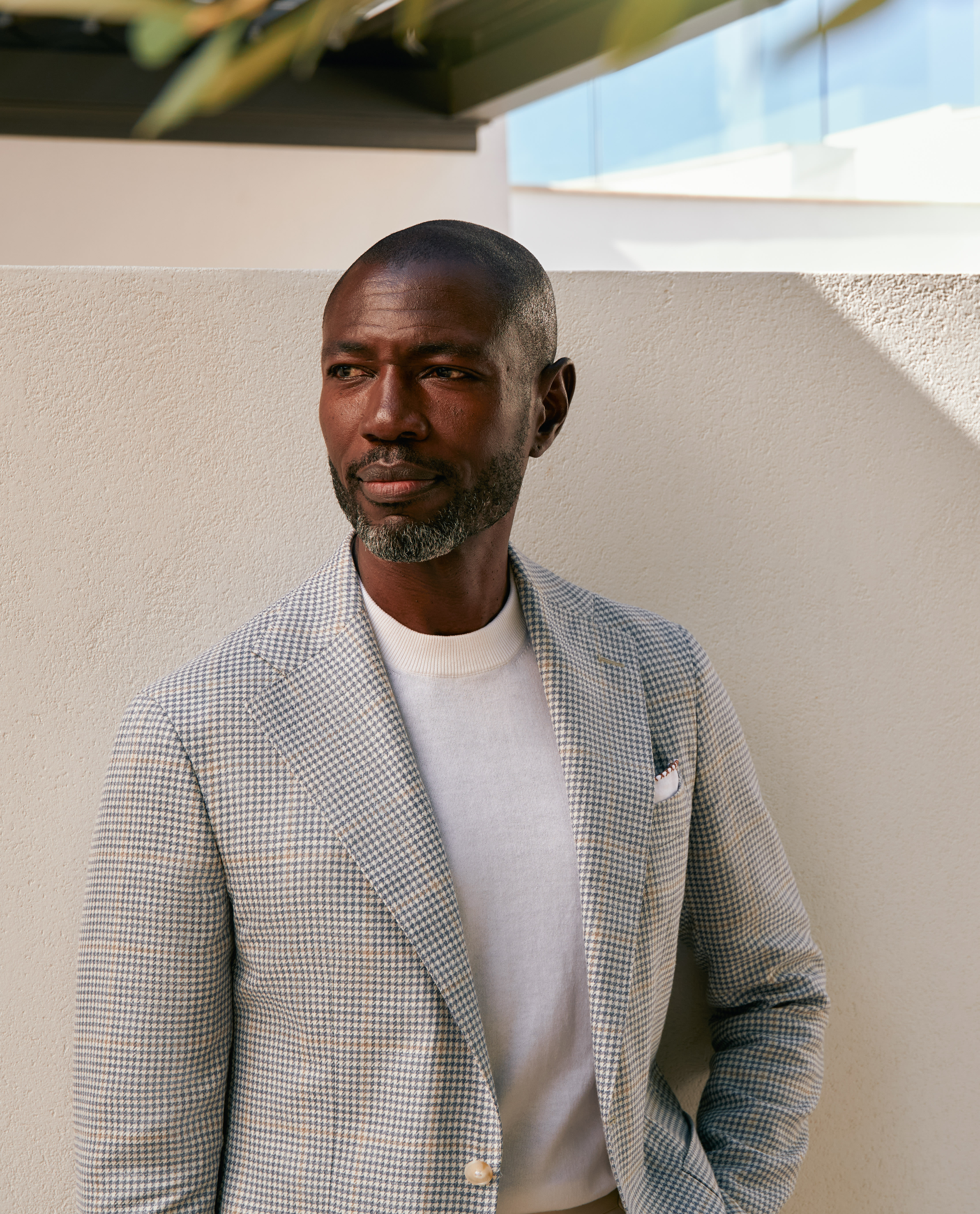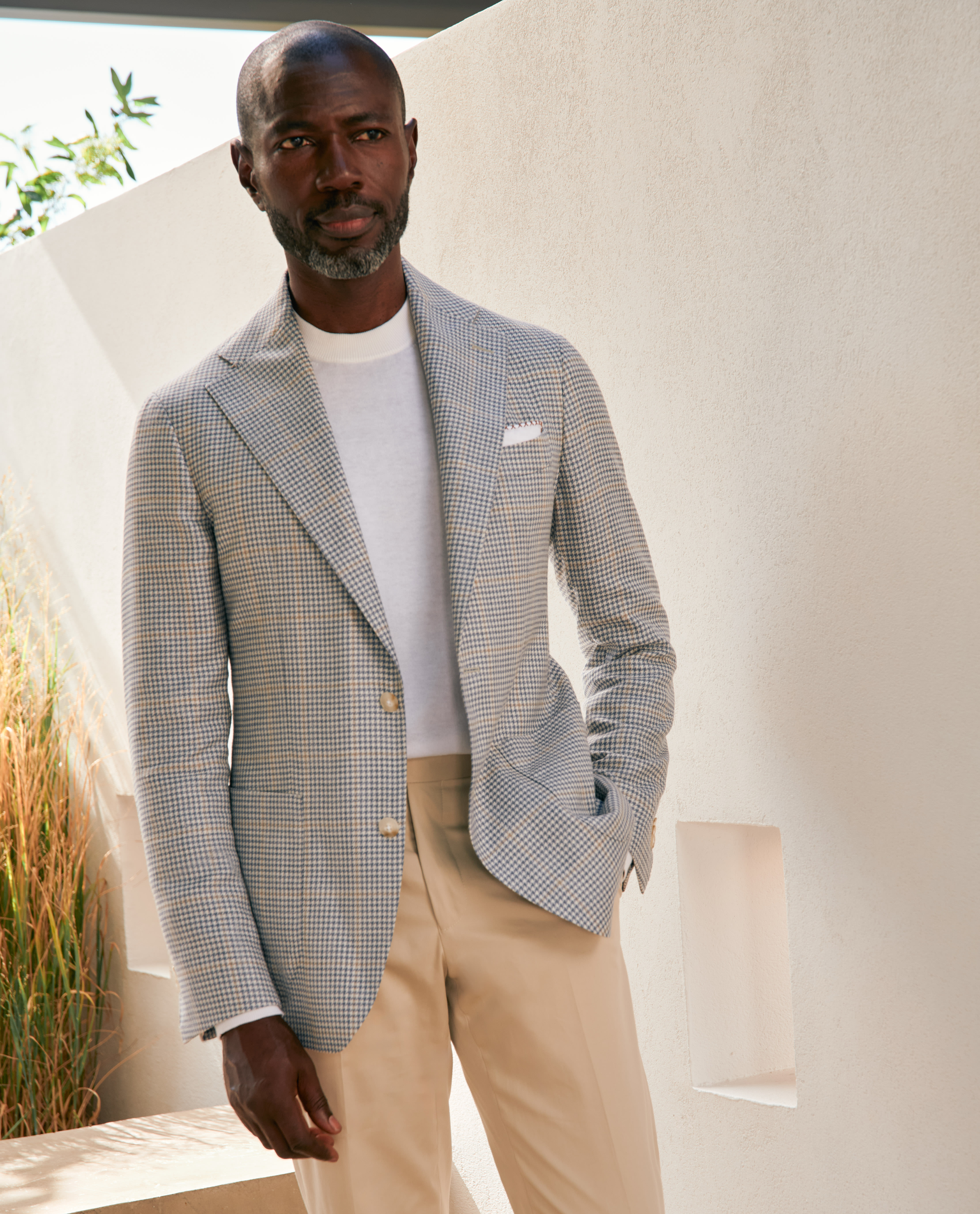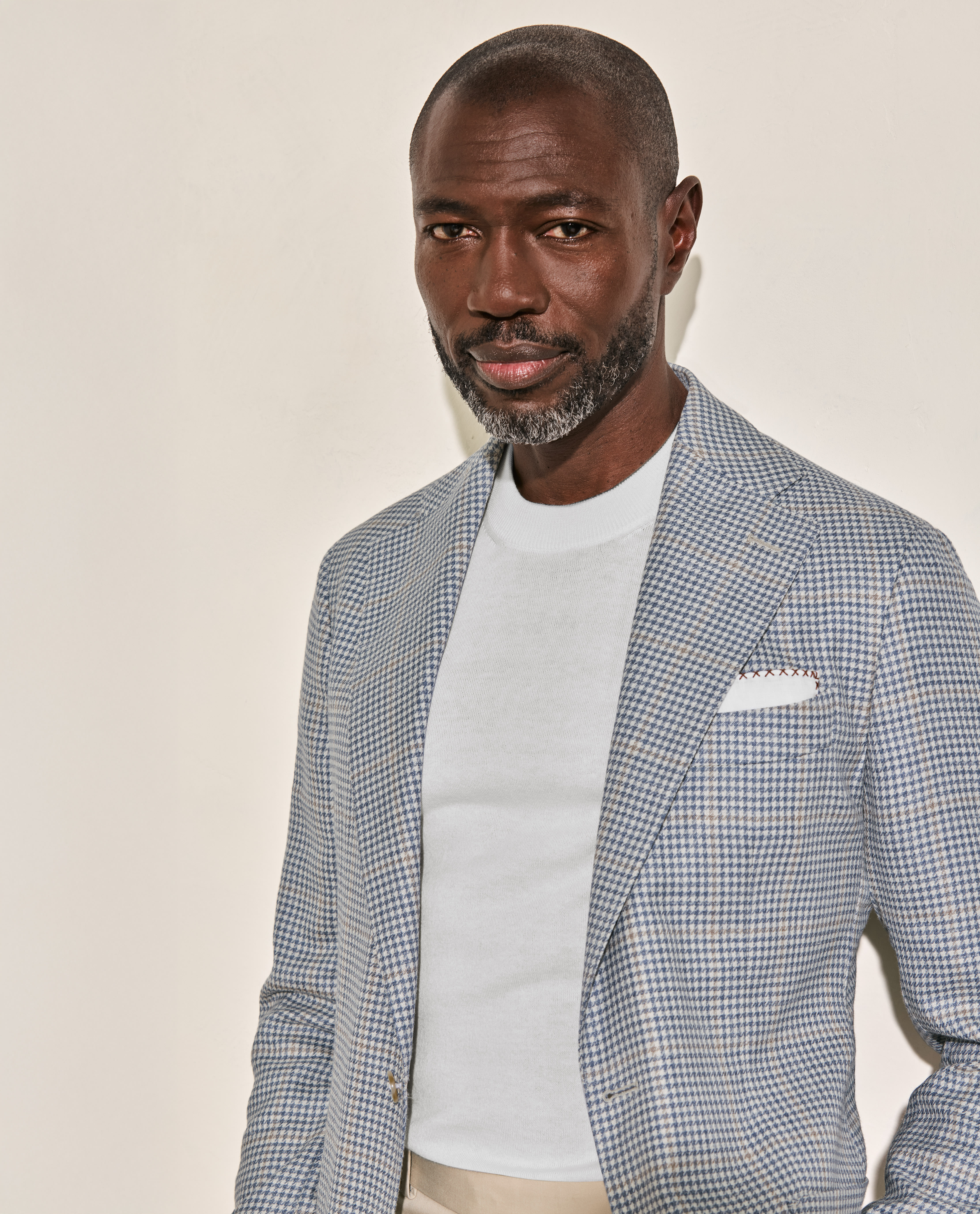 Versatile and striking, this storm blue and ivory houndstooth jacket with a subtle sand windowpane offers nearly endless possibilities for styling. Go formal with a white button-up, dark trousers, and tie – or opt for the smart-casual vibe shown here with your favorite summer knit, stretch cotton trousers, and suede penny loafers.