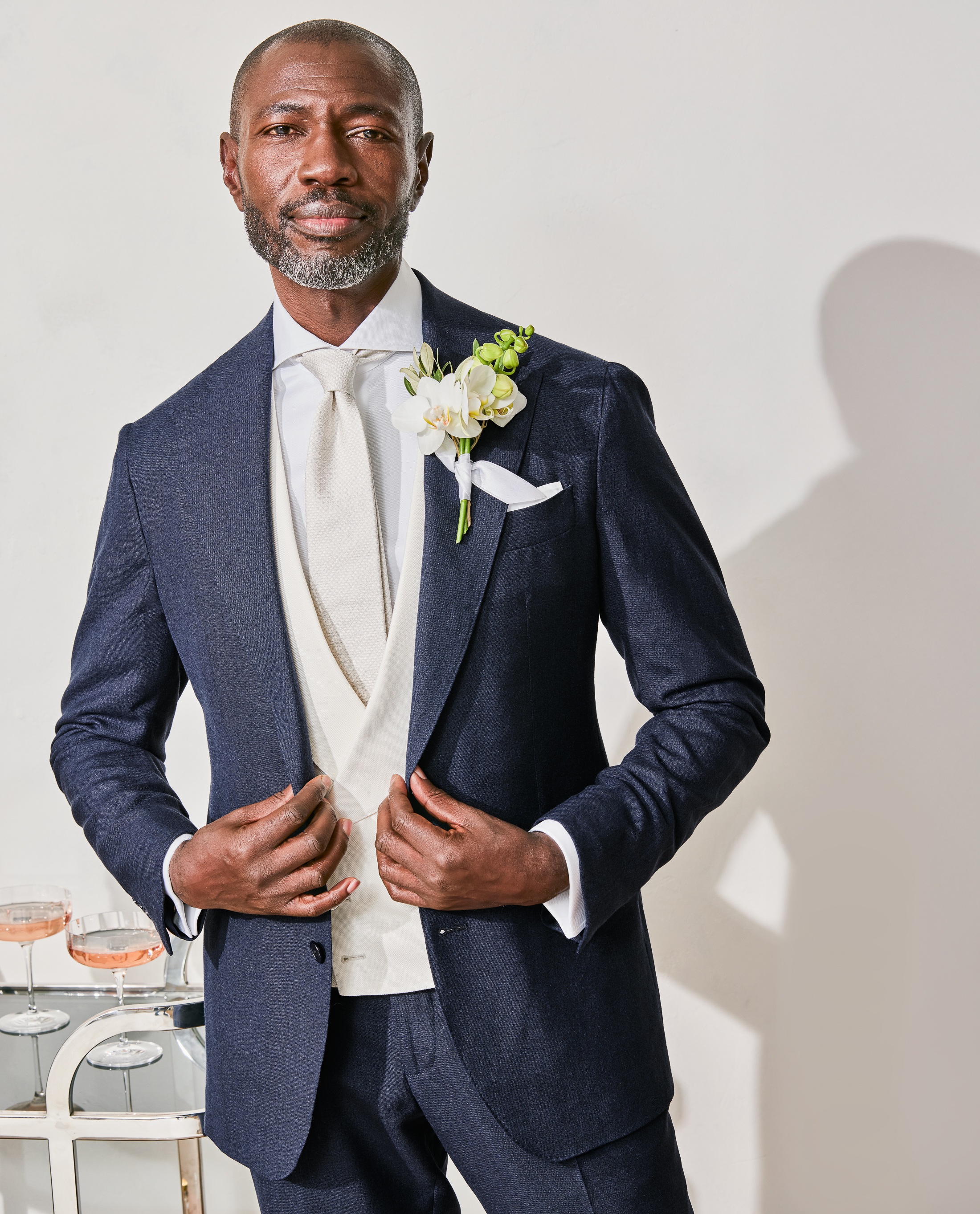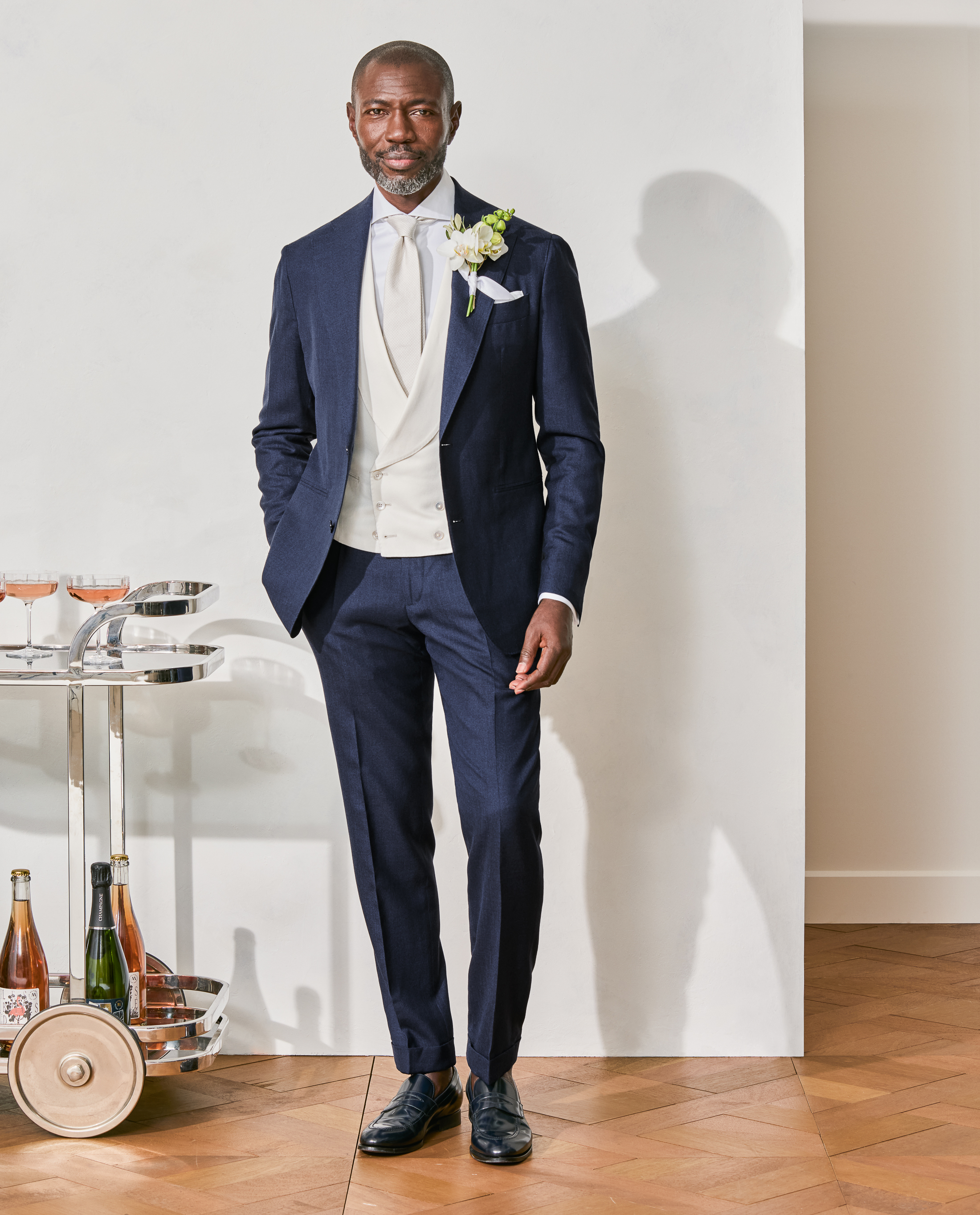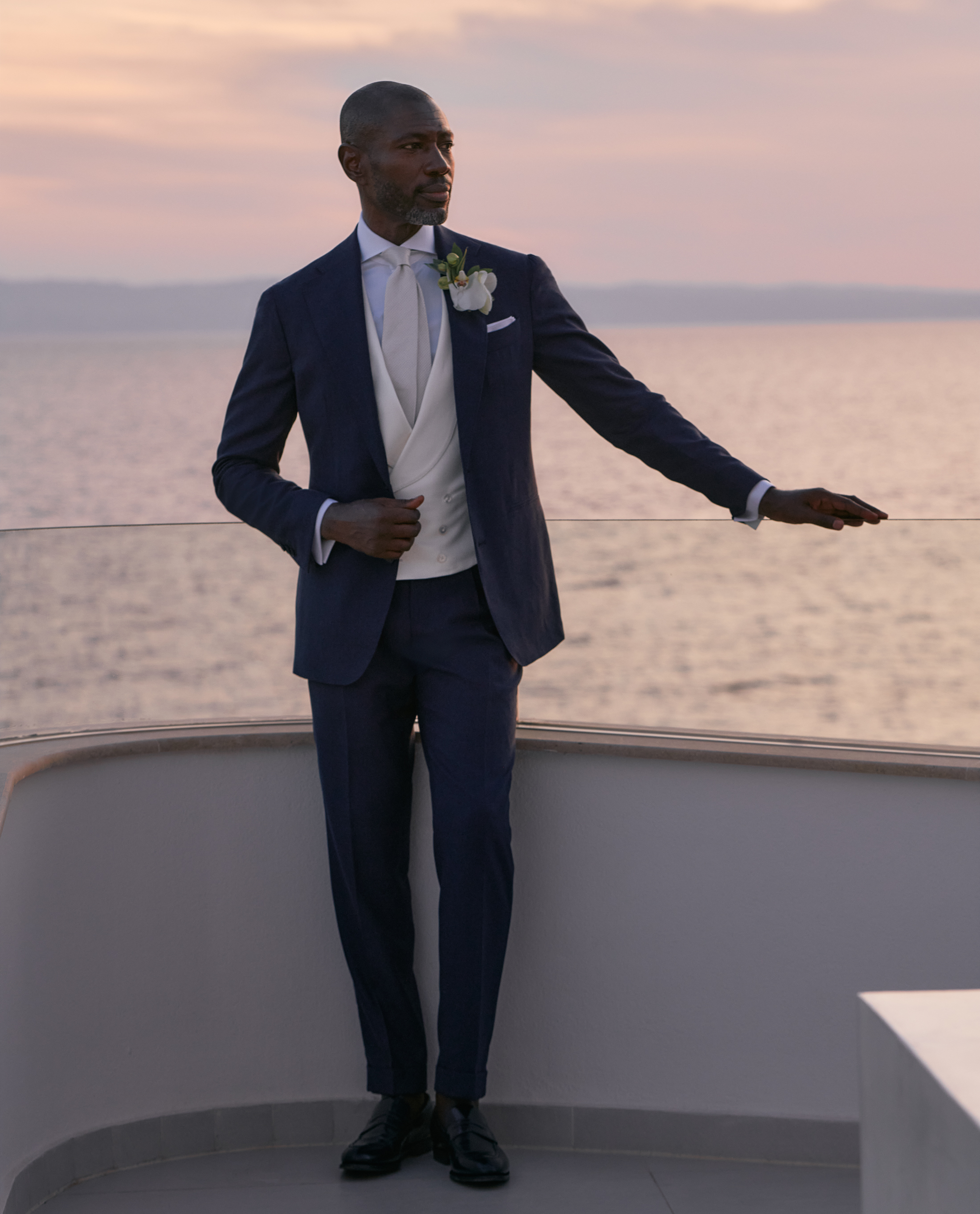 If blue and white are your colors, look no further than this wool-silk-linen suit in calming Neapolitan blue, elevated by a subtle, elegant sheen and paired with an off-white double-breasted waistcoat. Created with tropical and destination weddings in mind from cooling Summertime® fabric, made in Italy by Loro Piana. Styled here for peak luxury with a white shirt, champagne tie, and polished blue penny loafers.